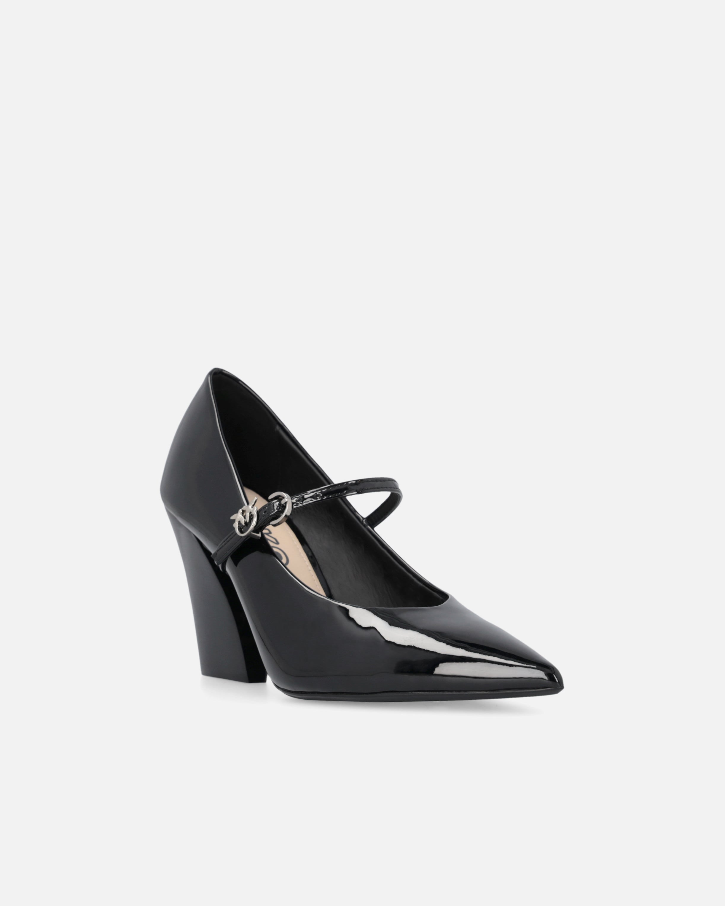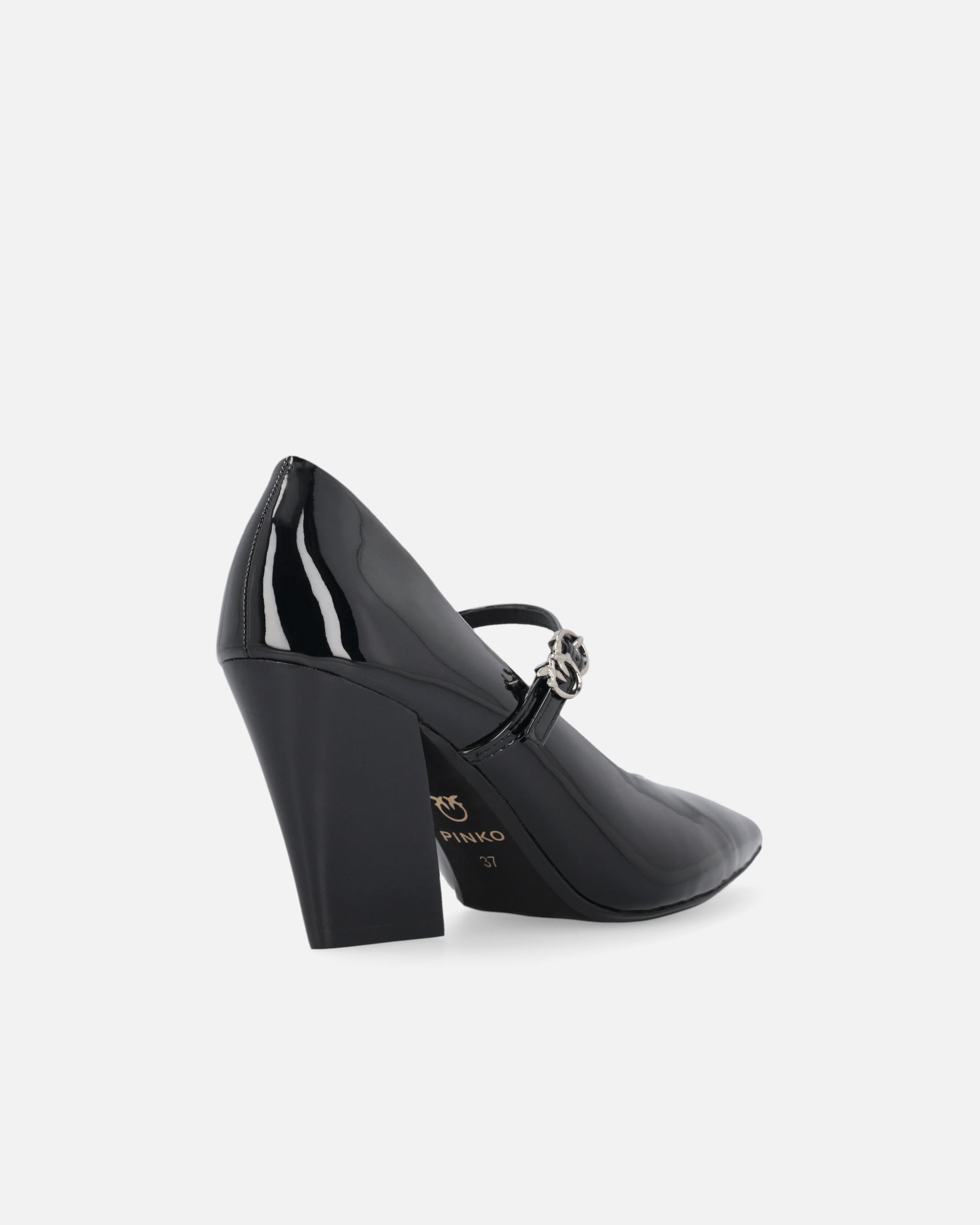 Patent-effect pointed-toe Mary Janes with 8 cm-high block heel. These shoes are fastened with a very elegant thin strap with buckle, accompanied by the iconic Love Birds logo. The asymmetric design gives the shoe an elegant and contemporary appearance, ideal for those after the perfect balance between unique style and comfort. Pair these shoes with a sophisticated skirt for an unforgettable day-to-night look.