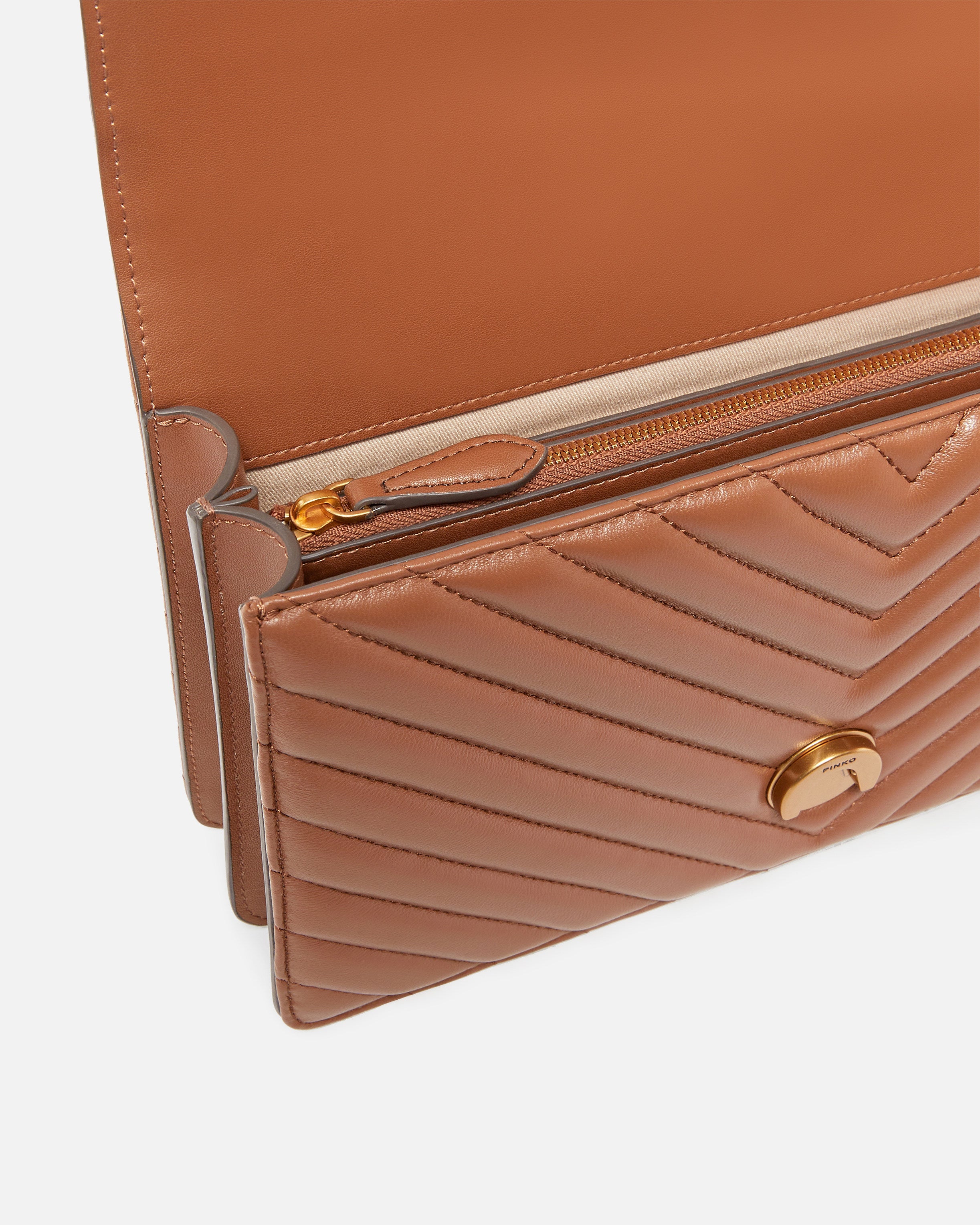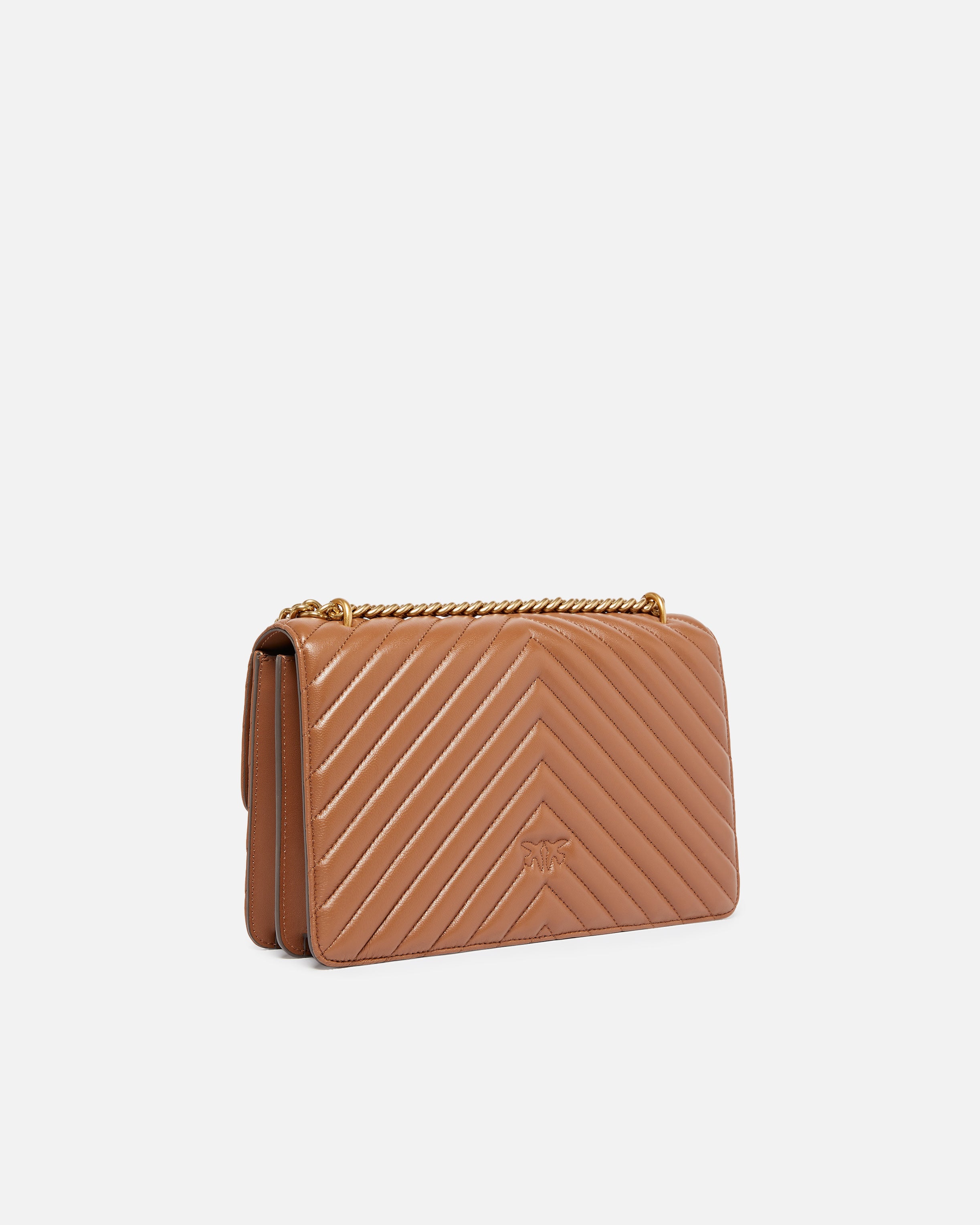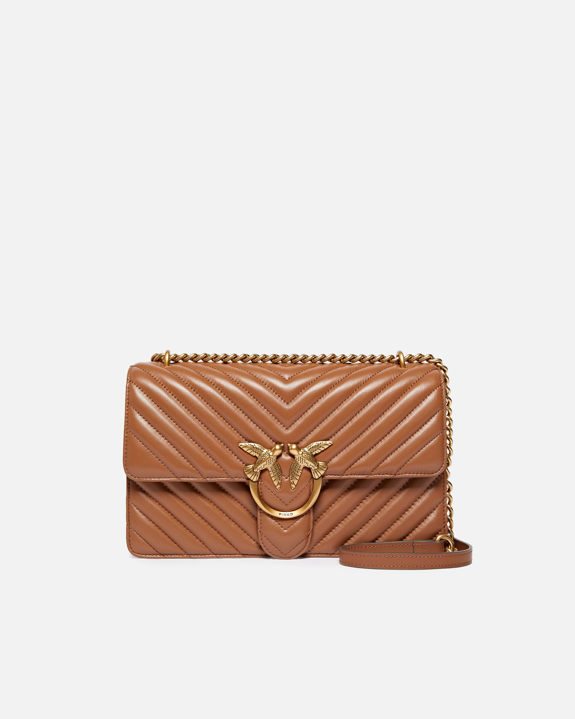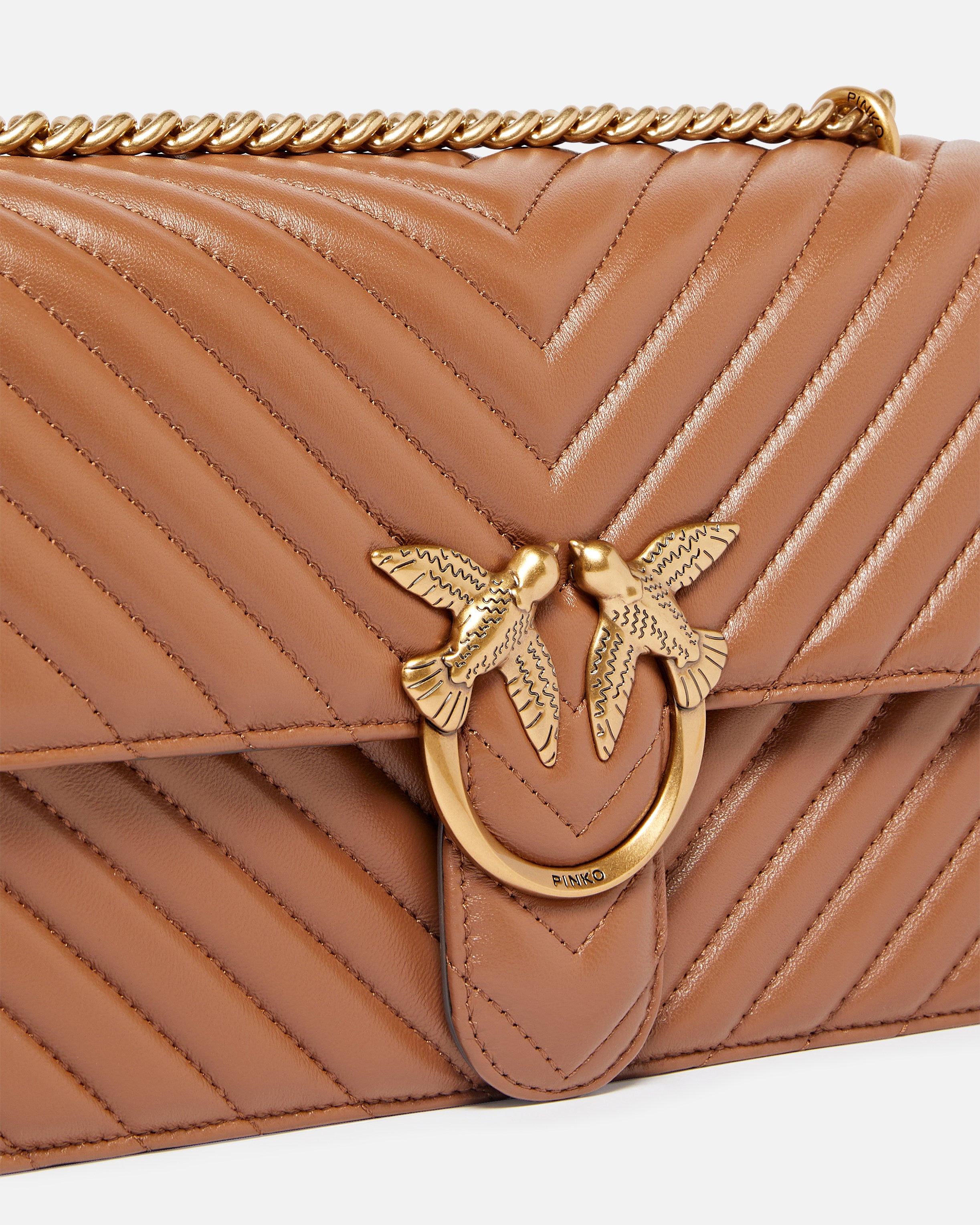Classic Love Bag One in quilted nappa leather with chevron pattern. The fastening is embellished with the iconic metal Love Birds Diamond Cut buckle. The accessory boasts a suede microfibre-lined interior, complete with a zipped centre divider pocket and leather slip pocket. The shoulder strap combines the classic round-link chain with a practical, adjustable leather shoulder pad.