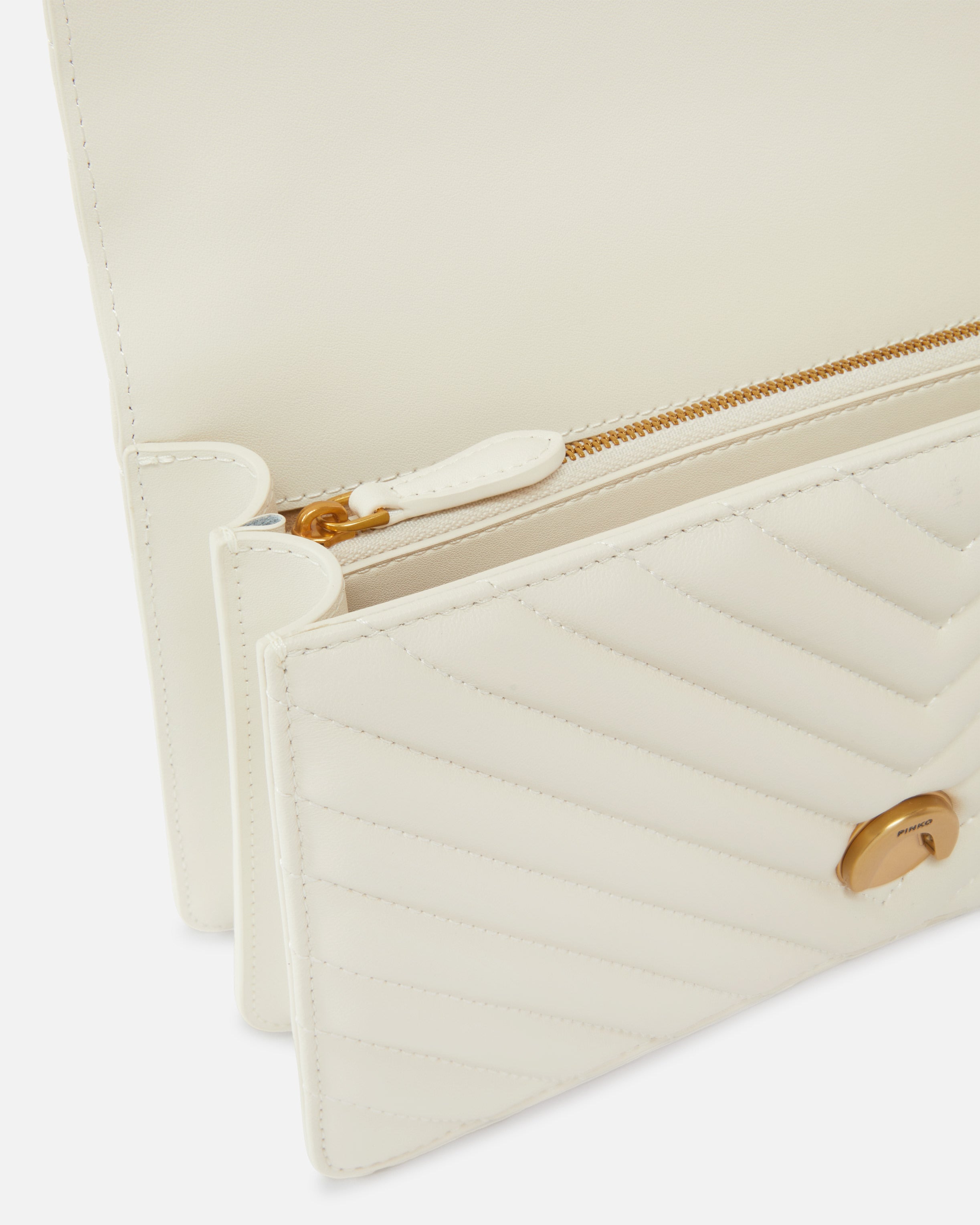 Classic Love Bag One in quilted nappa leather with chevron pattern. The fastening is embellished with the iconic metal Love Birds Diamond Cut buckle. The accessory boasts a suede microfibre-lined interior, complete with a zipped centre divider pocket and leather slip pocket. The shoulder strap combines the classic round-link chain with a practical, adjustable leather shoulder pad.
