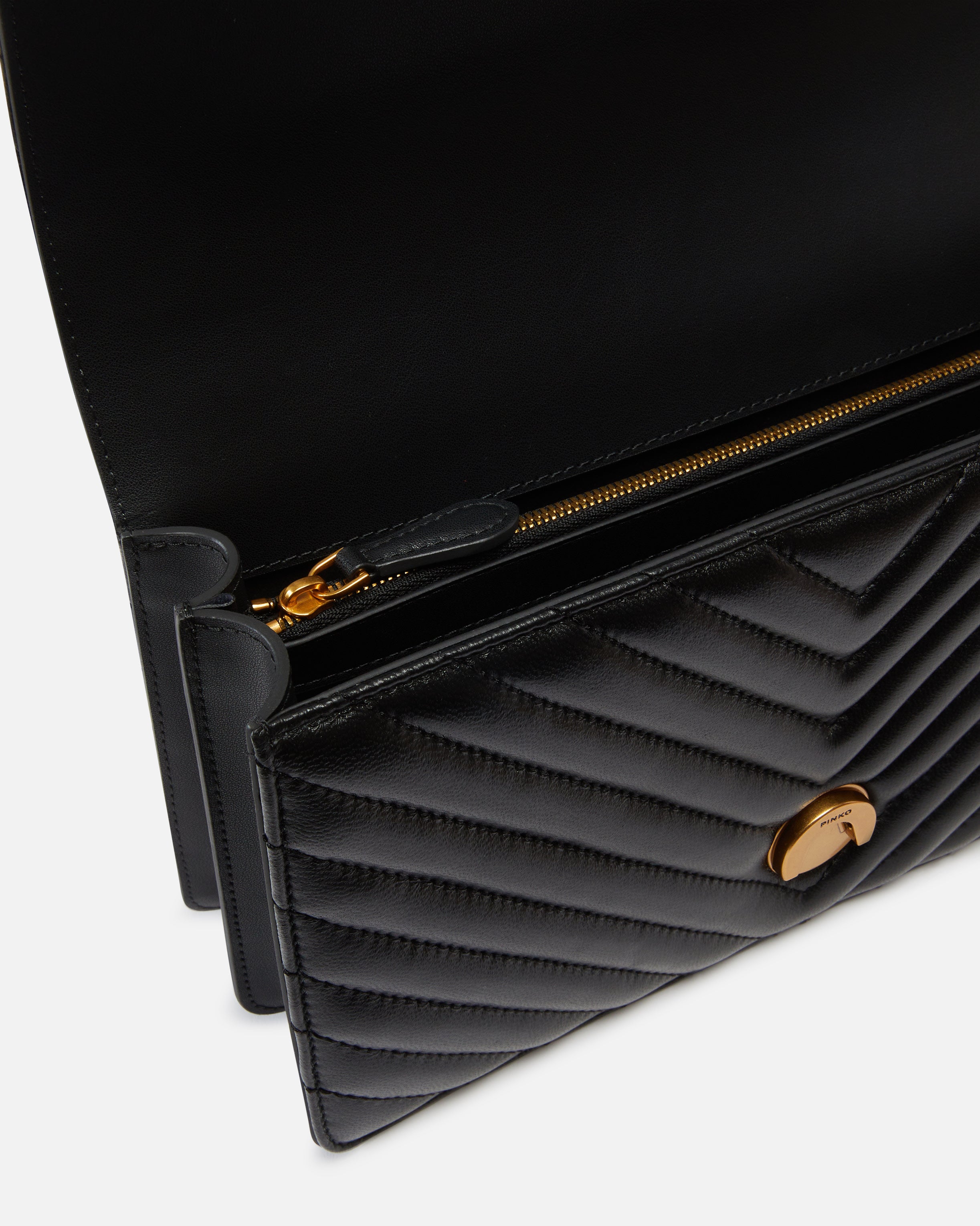 Classic Love Bag One in quilted nappa leather with chevron pattern. The fastening is embellished with the iconic metal Love Birds Diamond Cut buckle. The accessory boasts a suede microfibre-lined interior, complete with a zipped centre divider pocket and leather slip pocket. The shoulder strap combines the classic round-link chain with a practical, adjustable leather shoulder pad.