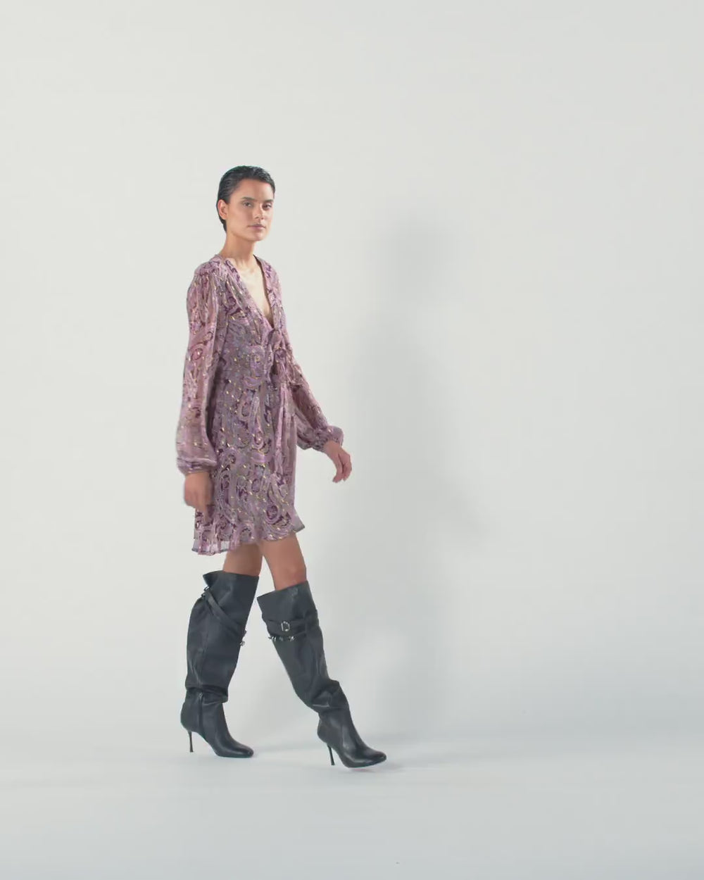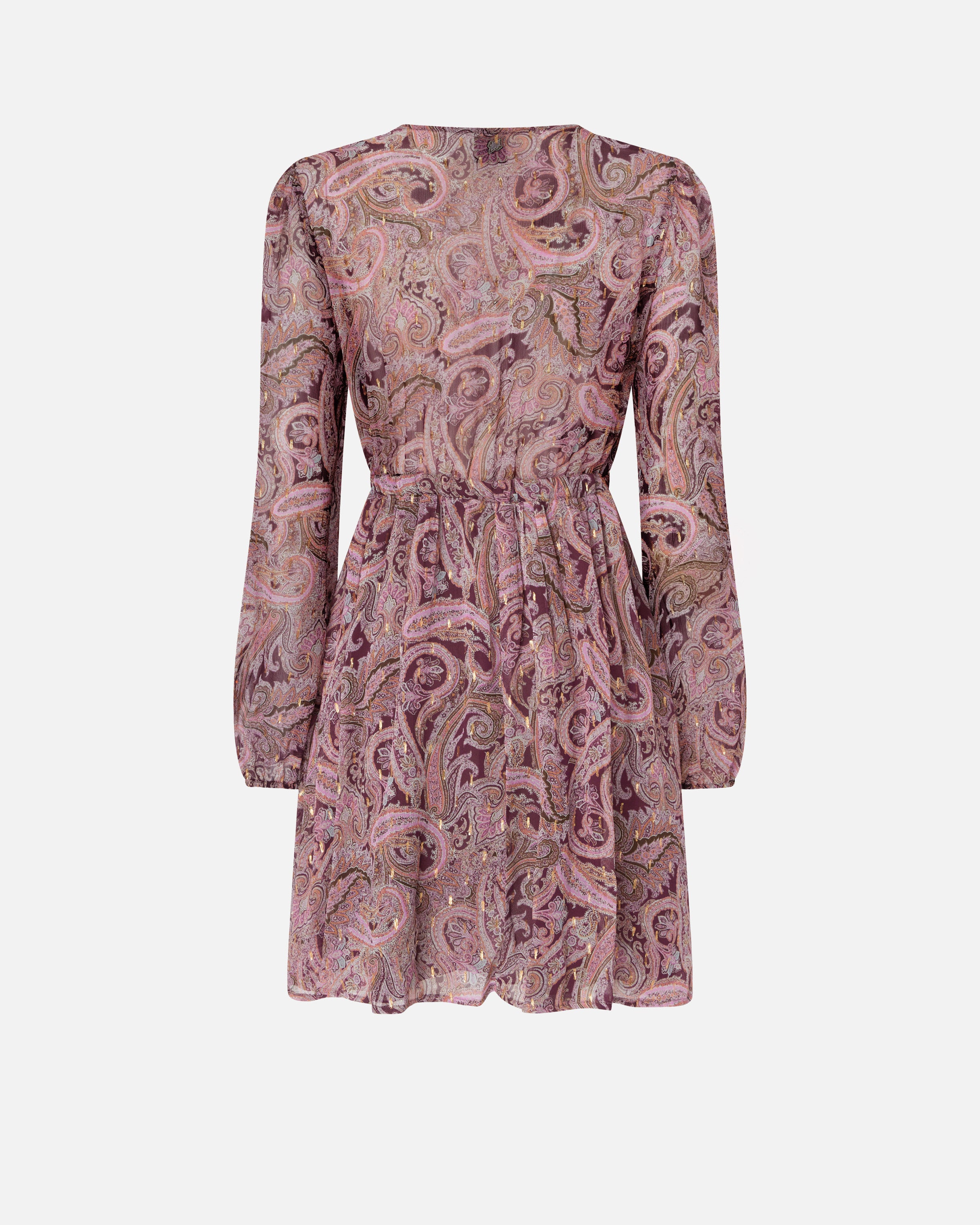 Mini dress with slightly puffed sleeves, V-neck, pleated wide skirt and figure-flattering elasticated waist. This piece is made from lightweight semi-sheer viscose crepon and is embellished with a sophisticated cashmere-inspired print with metallic-thread detailing for extra radiance. The garment's light weight and silhouette make it feminine and sensual, but the most eye-catching element is the simple yet striking cut-out effect at the front, formed by two tied fabric bands.