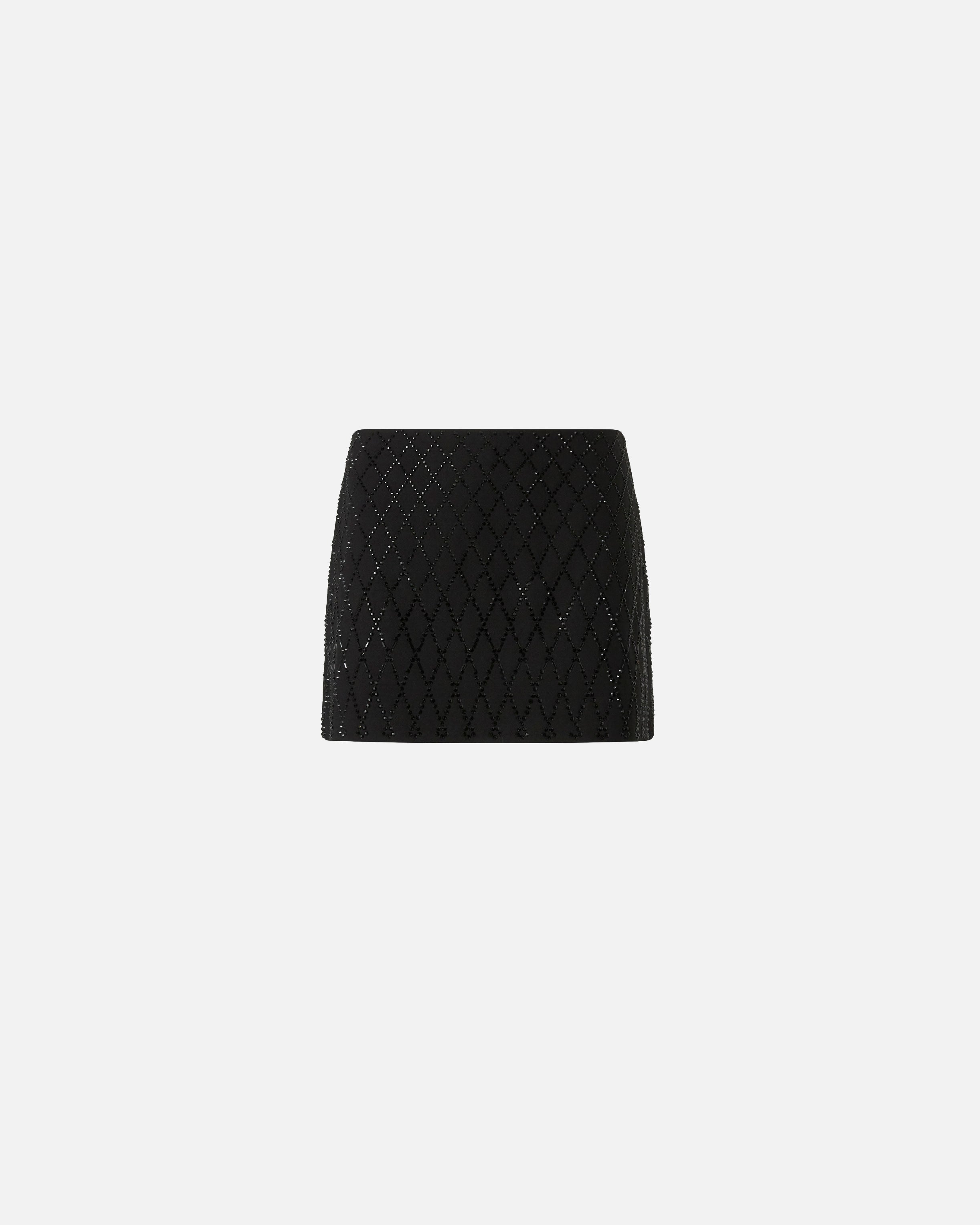 Fitted miniskirt with zip on the back. This design features rhinestone appliqué of different shapes and sizes that creates a sophisticated all-over geometric design. The detailing gives the garment a fine, luminous effect that elevates the understated quality of the silhouette. Opt for a refined, scintillating total look with the matching skirt for the most special occasions.