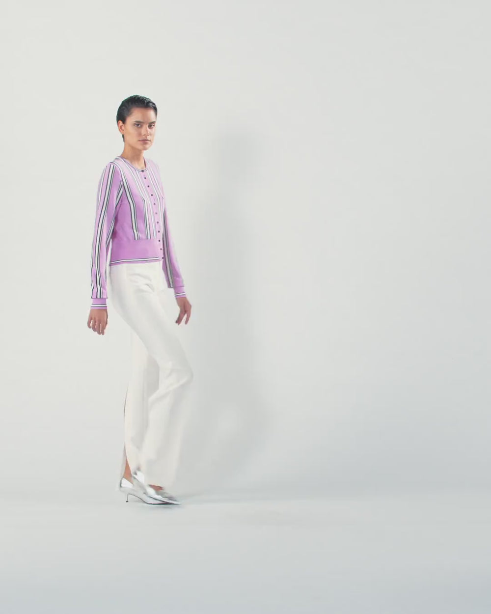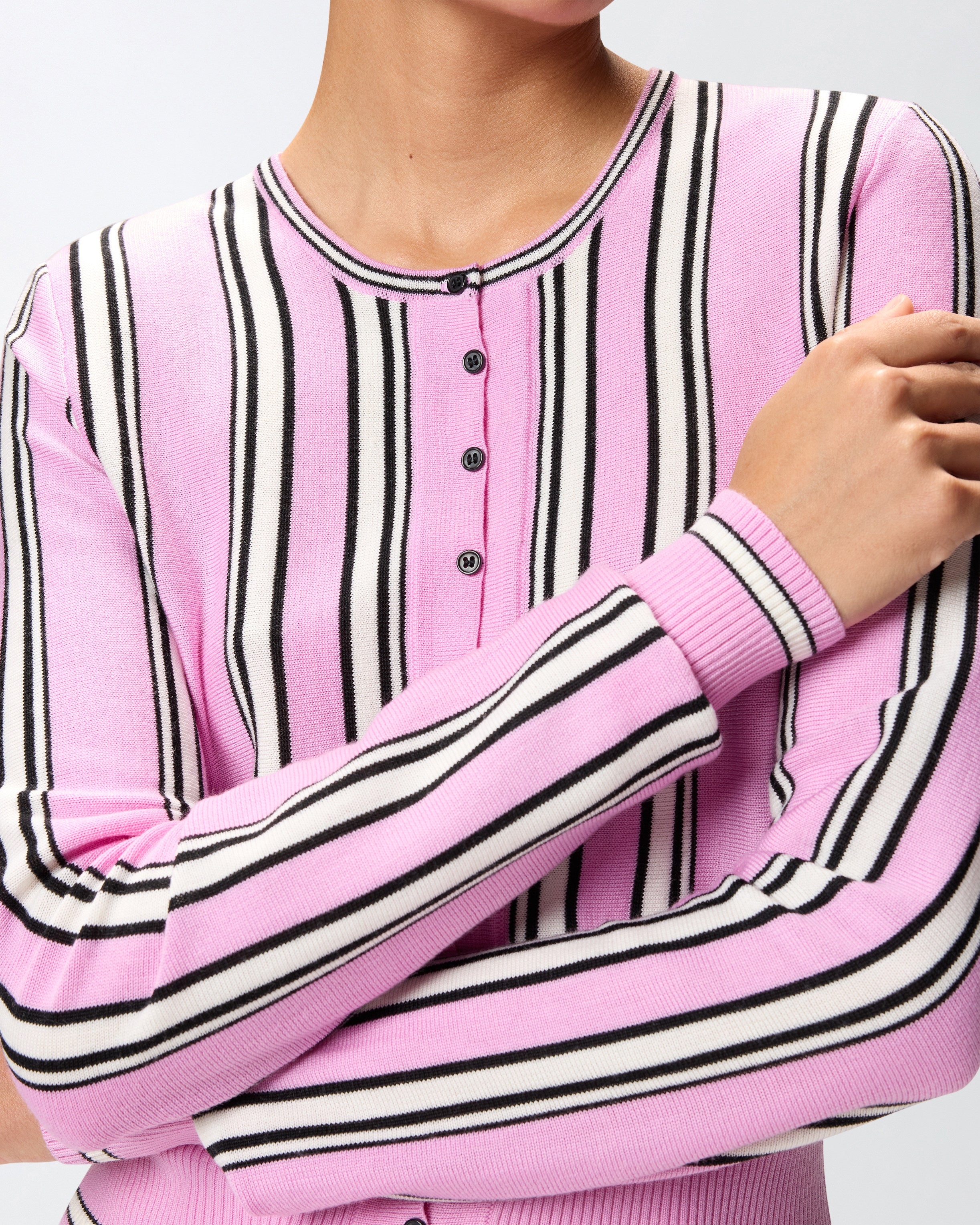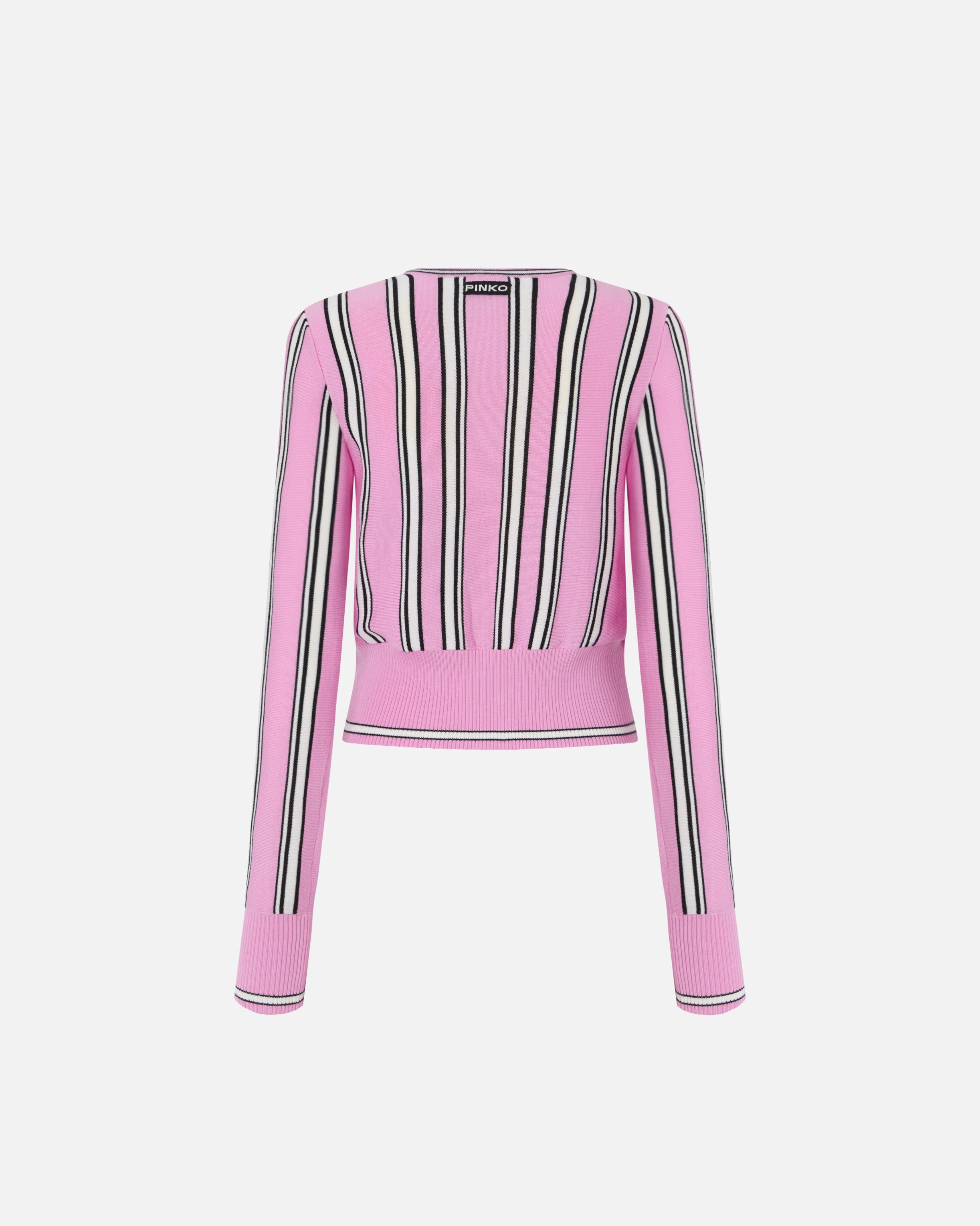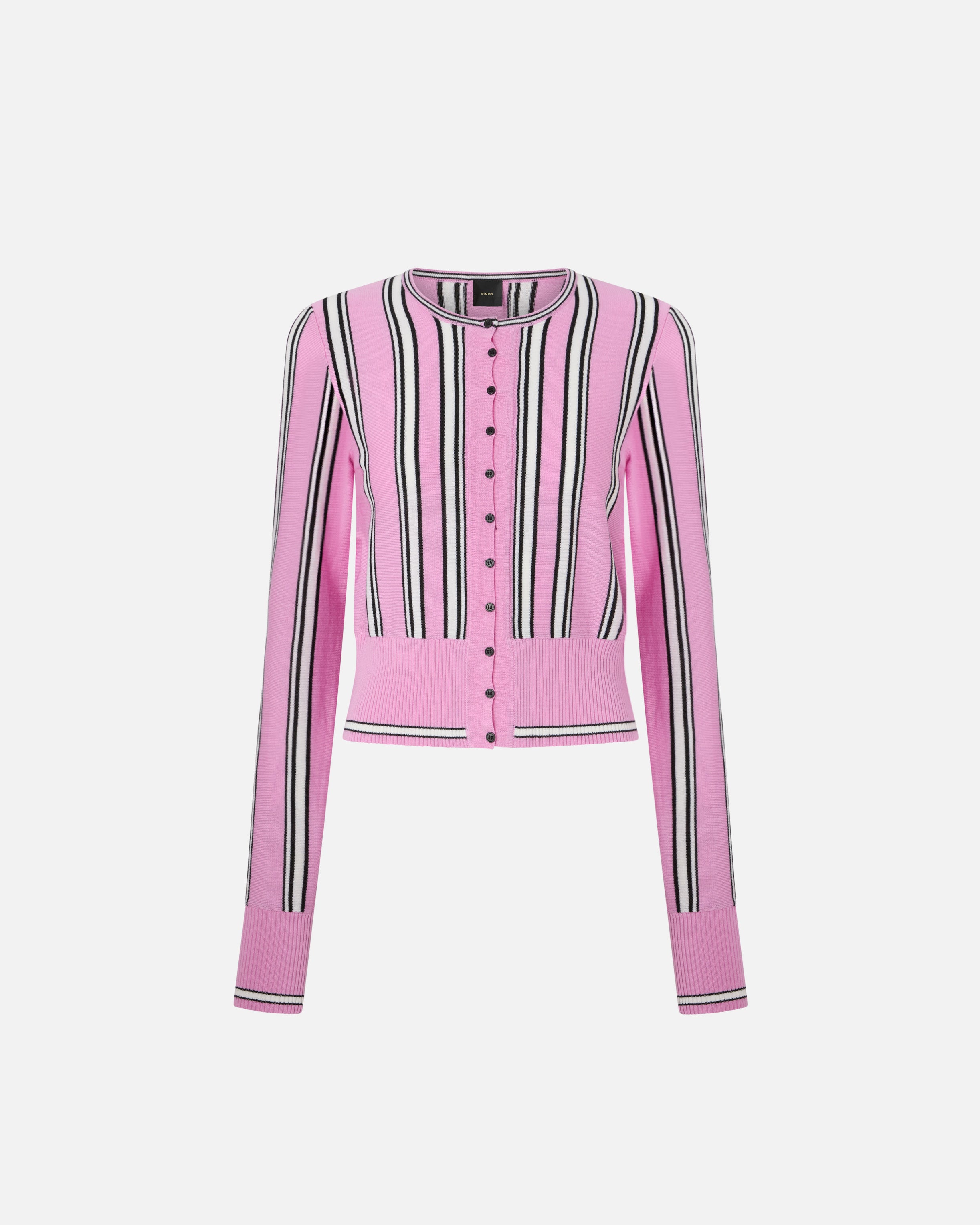 Extra-fine pure merino wool cardigan featuring a contrasting vertical-striped pattern, perfect for adding a pop of colour to your wardrobe. The cuffs and hem are ribbed, while the back is customised with the PINKO lettering logo label. The piece has undergone finishing tests to minimise the possible formation of pilling, ensuring greater fabric softness and durability. Choose this design to recreate a vibrant but classy look, which will accompany you at all times of the day, from the office to evenings out with friends.