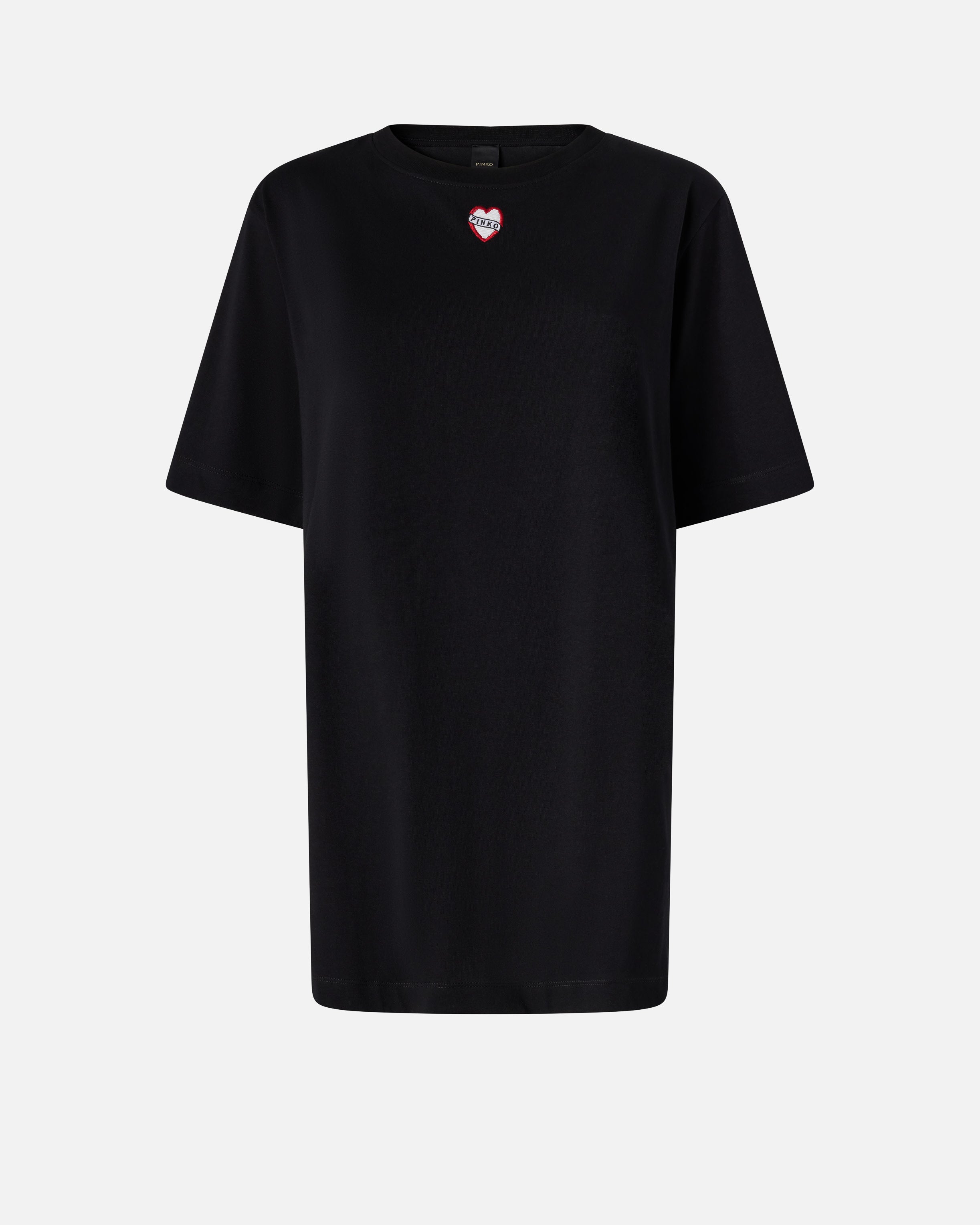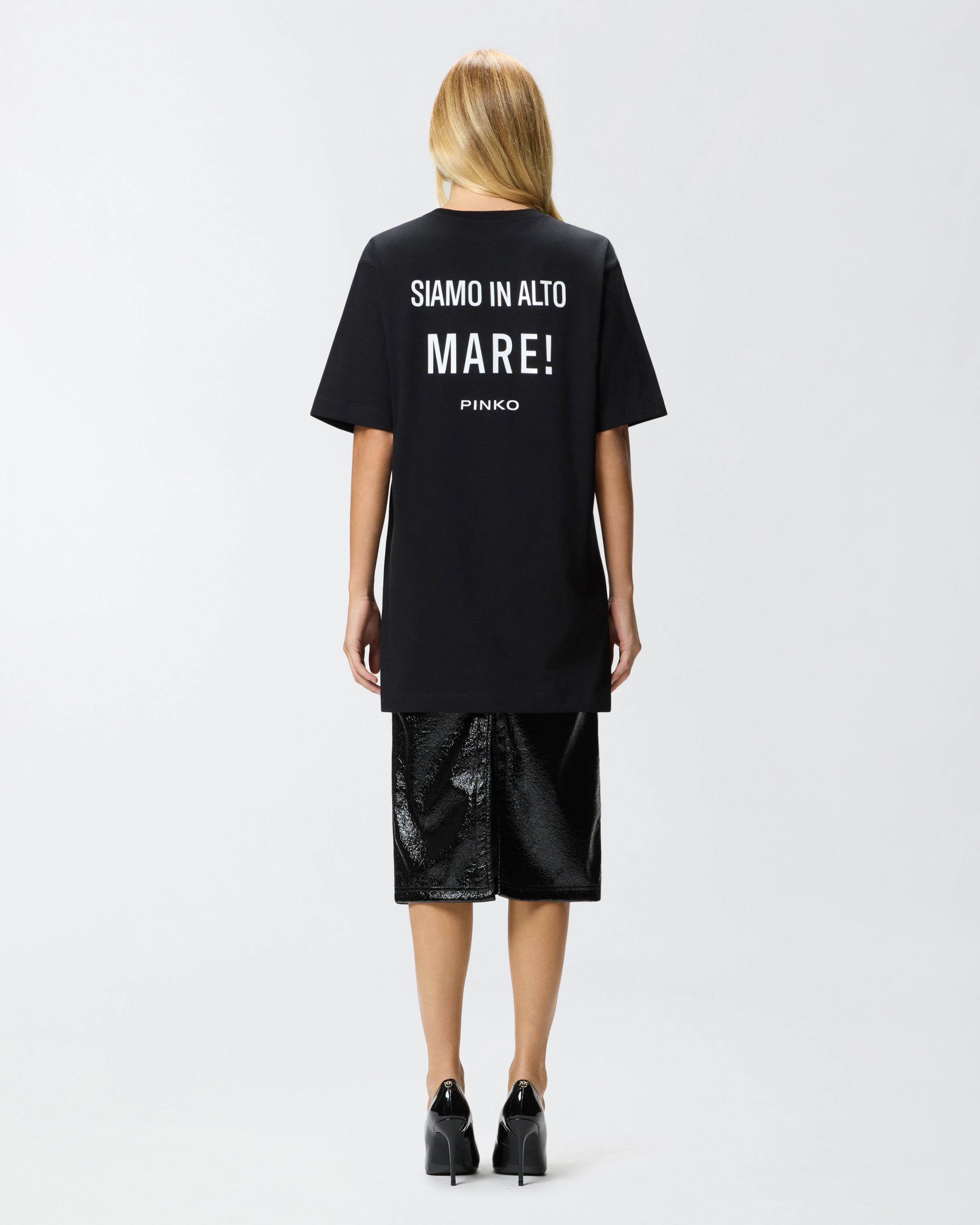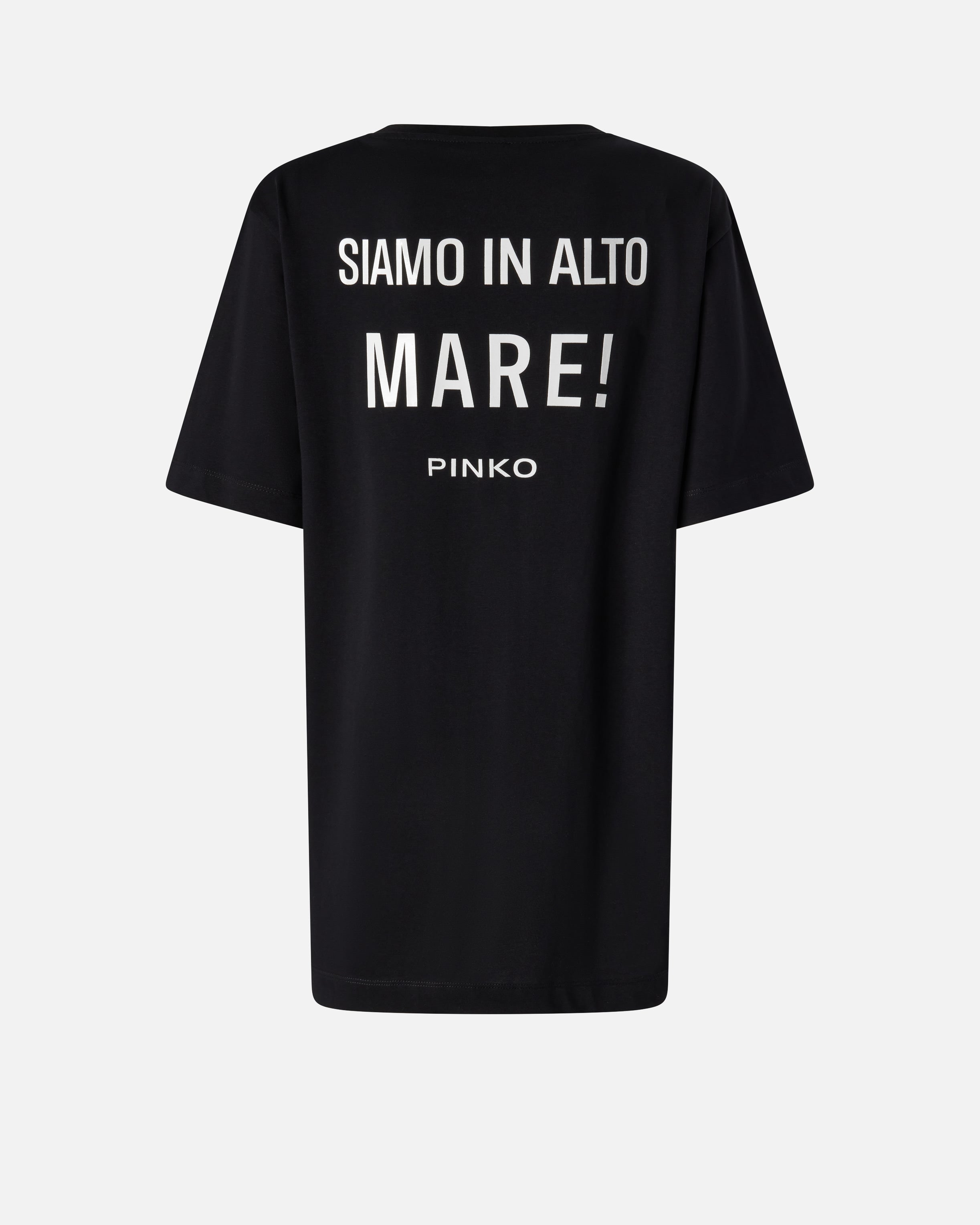 Long, half-sleeved T-shirt in cotton jersey, with a rib-knit crew-neck. The front features heart embroidery with the PINKO logo, while the back is embellished with a shiny embossed print with the slogan WE ARE ON the HIGH SEAS!, accompanied by the PINKO logo as always. This T-shirt can be worn with a pair of jeans for a casual look or with elegant-cut trousers for a casual and feminine touch.