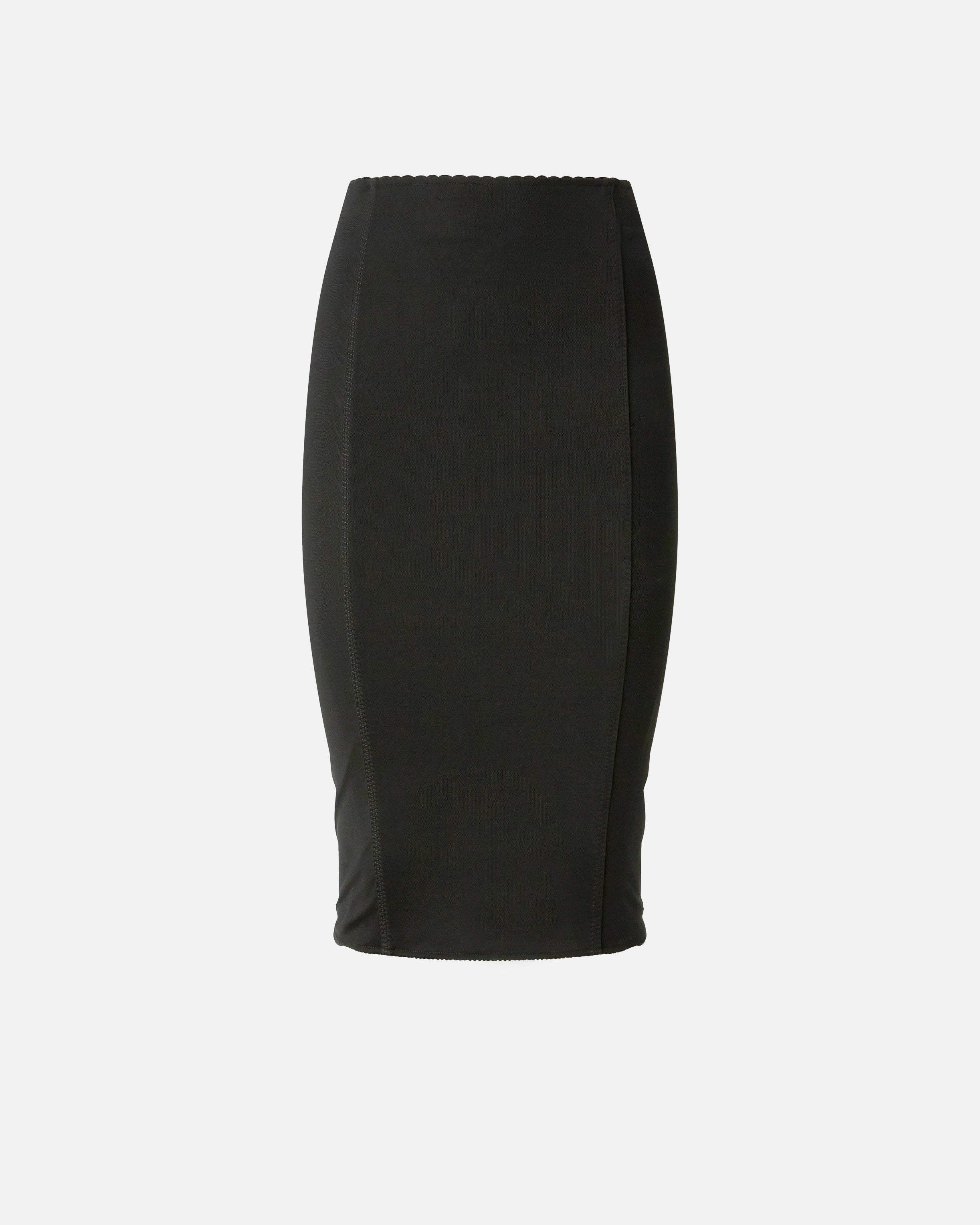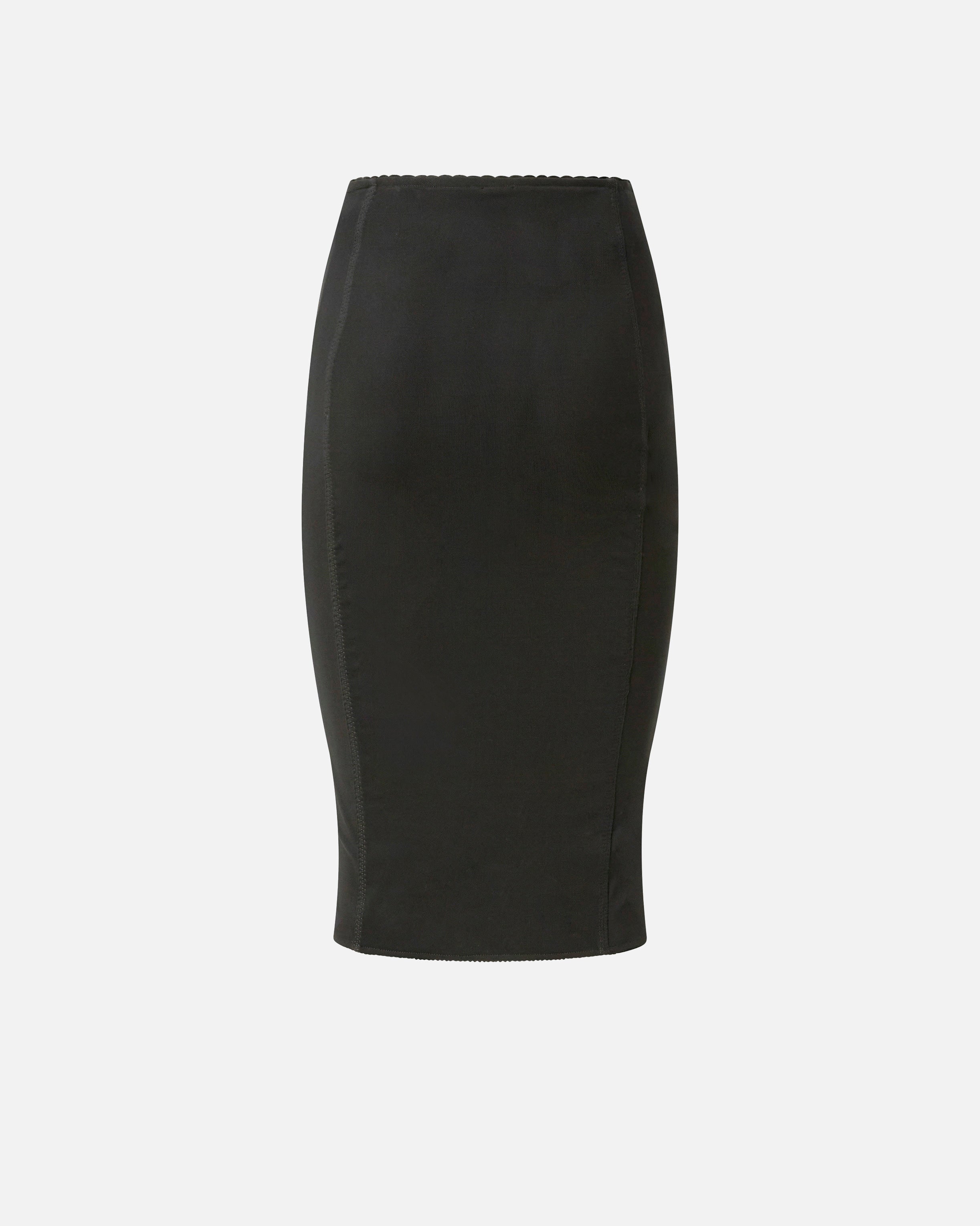 Fitted pencil skirt made from bodice fabric, a fabric commonly used in corsetry. The material is distinguished by great elasticity and gives the piece a shaping effect, enhancing curves in a natural and harmonious way. The piece guarantees optimal comfort, wrapping the body without compromising freedom of movement, and offering a fit that emphasises the figure with discretion and elegance.