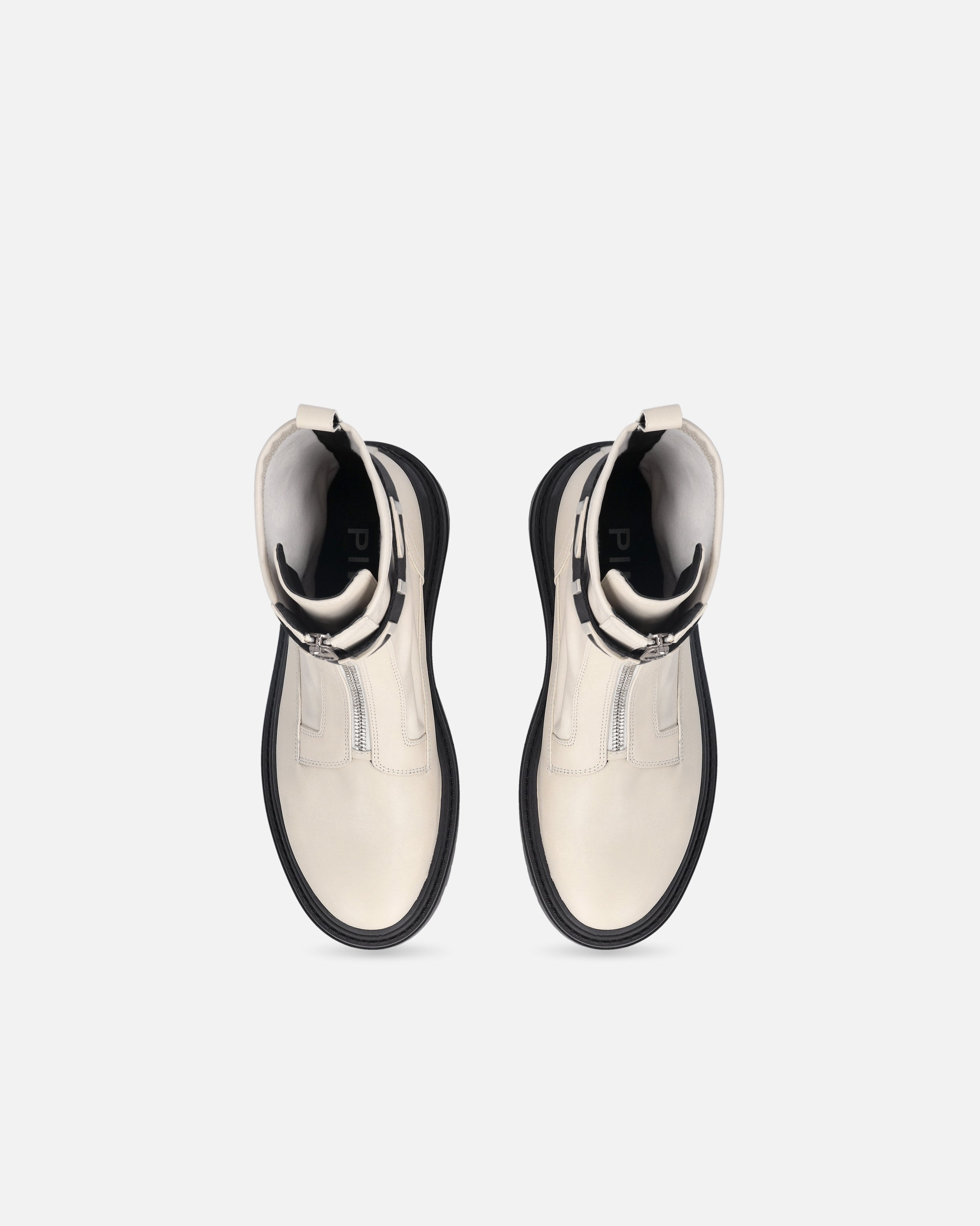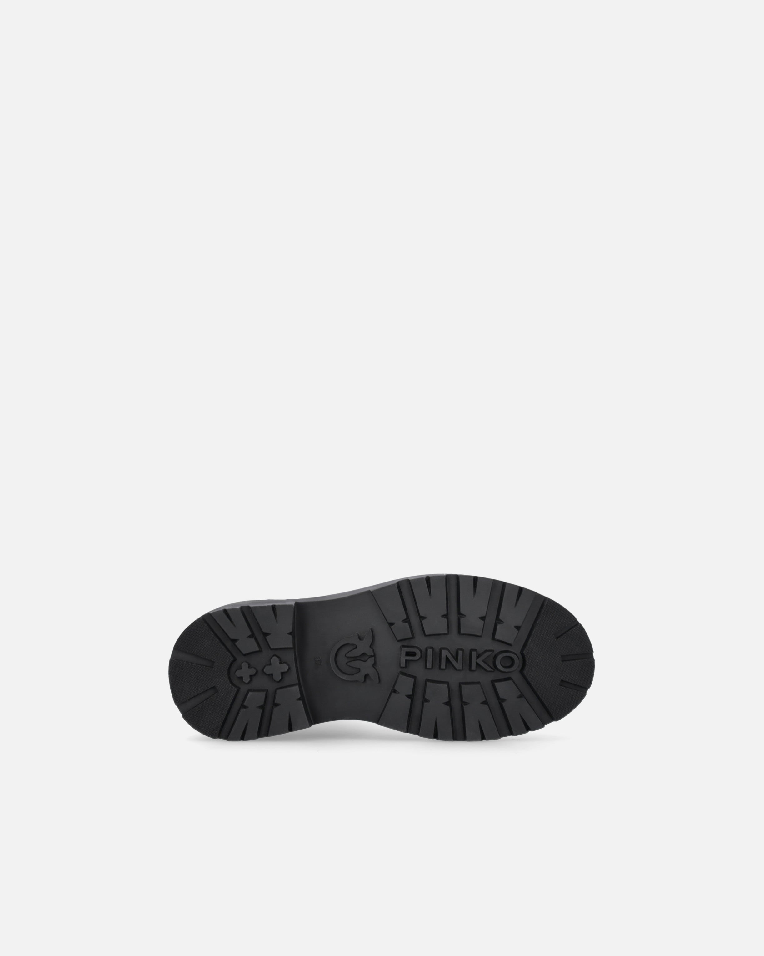 Leather ankle boots with a rubber platform lug sole, a leather lining, a front zip fastening and a pull-tab on the back to help get them on. The final touch is provided by the technical ribbon band with PINKO lettering logo. Modern and versatile, these combat boots are perfect for a casual and audacious look. Platform sole height: 5.5 cm.
