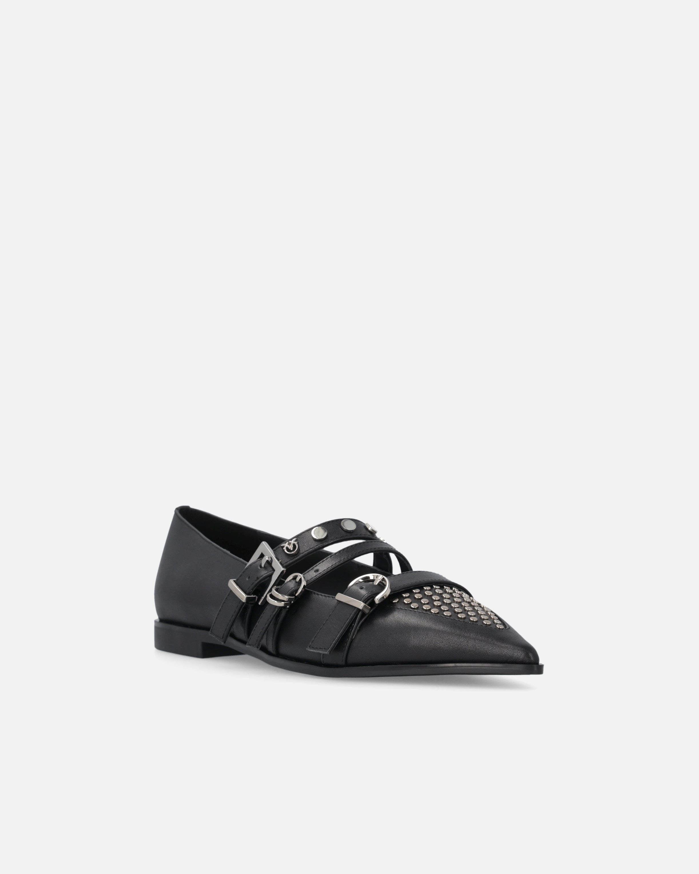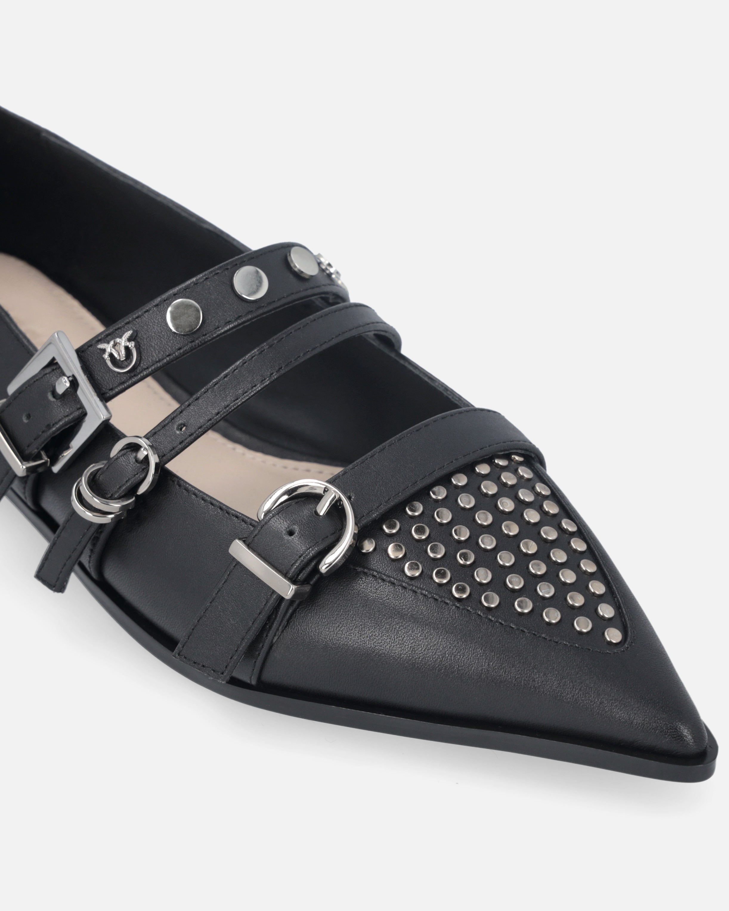 Pointed-toe leather ballerinas with 1.5 cm-high heel. This shoe features three distinctive straps at the top, one of which is finished with studs and the iconic Love Birds logo plaque, while the toe features a triangular insert dotted with mini studs that lend a shiny, rock'n'roll edge. The perfect blend of casual elegance and urban grit.