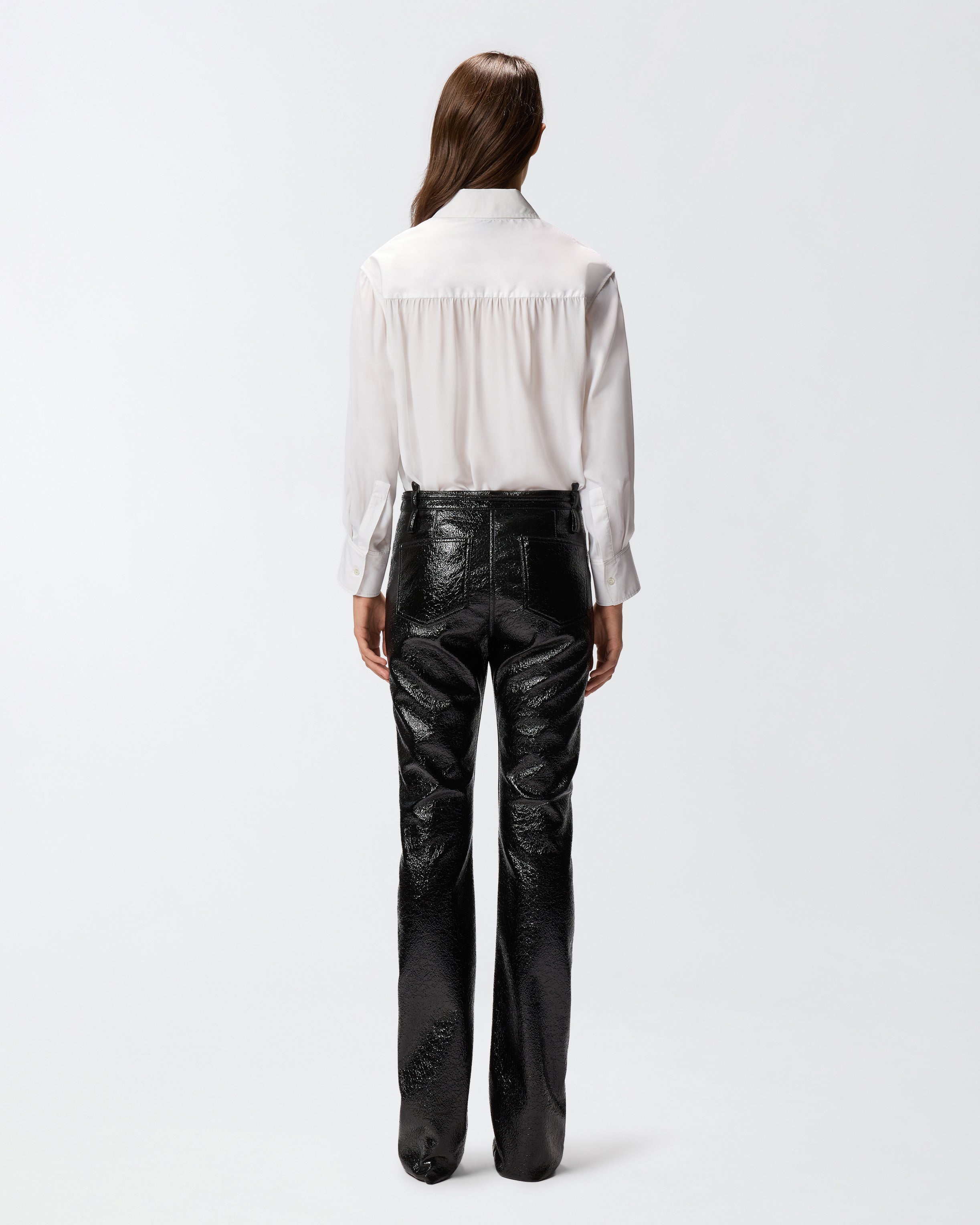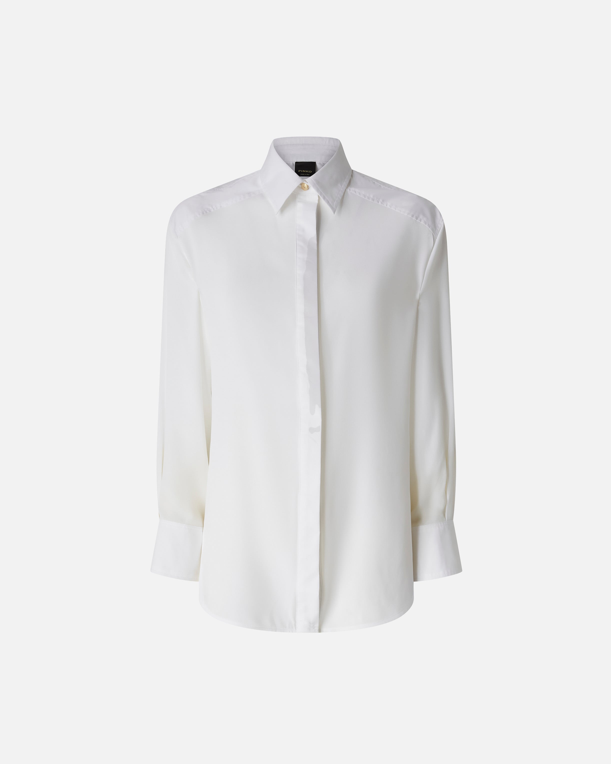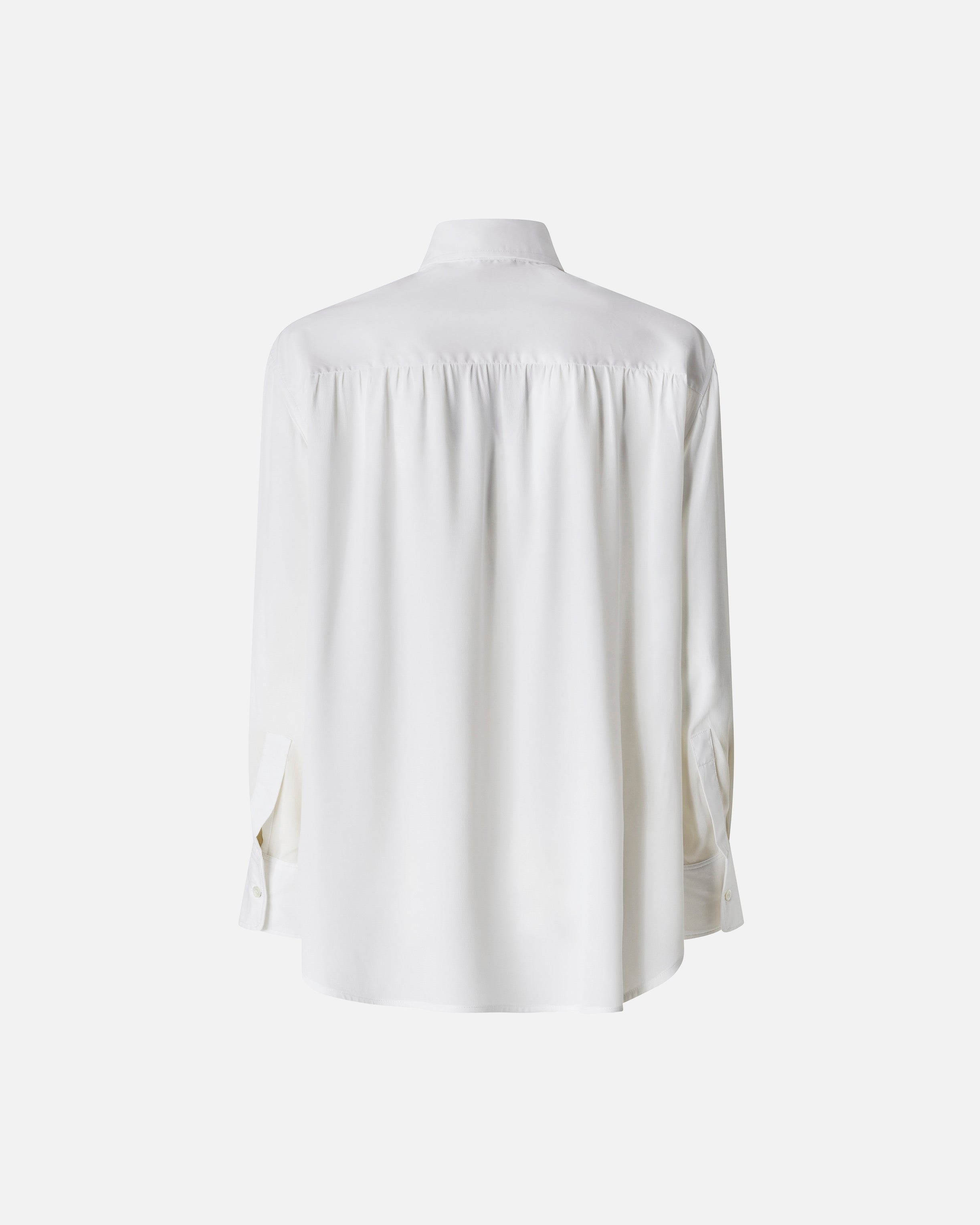 Classic shirt characterized by the combination of cotton poplin with a more compact hand, present on the main body and sleeves, and crêpe de Chine fabric, more fluid, on the slightly gathered back insert. Pointed collar, long sleeves with cuff at the bottom, button closure at the front. Pair the shirt with a pair of jeans to elevate your everyday look with a feminine and original piece that does not go unnoticed.