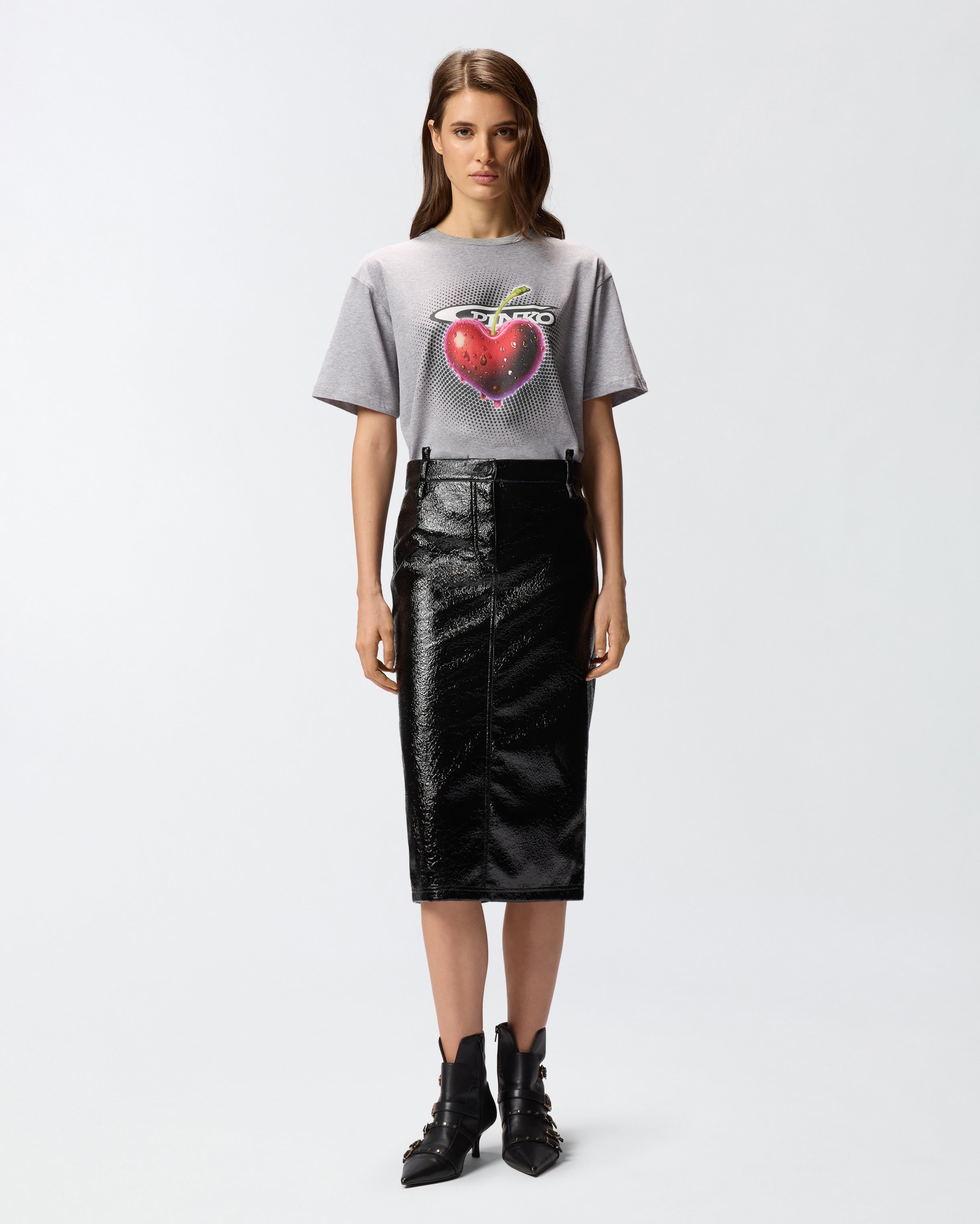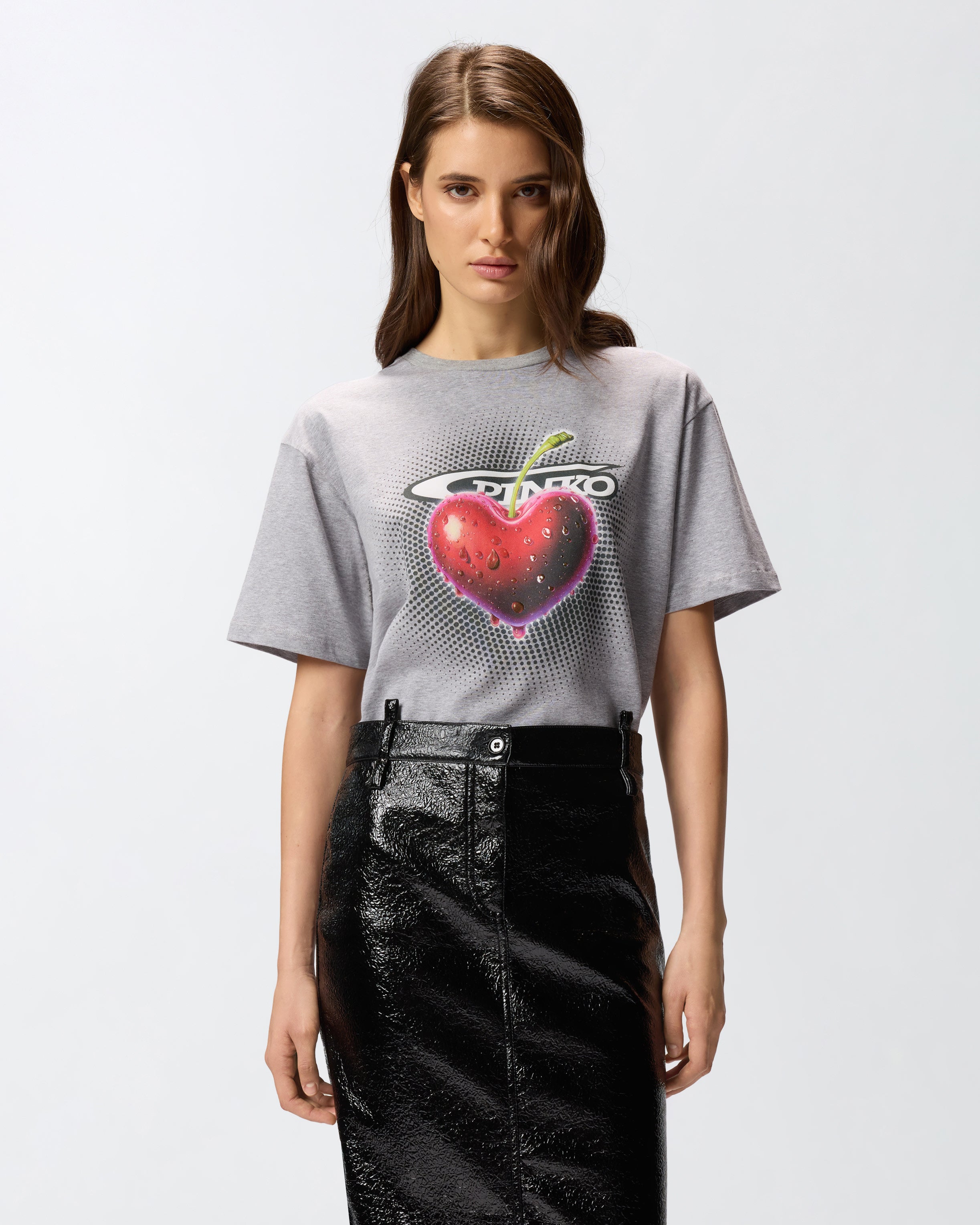 Regular-fit short-sleeved T-shirt with a rib-knit crew-neck made from soft melange stretch jersey. The style features a cherry print that stands out on the front, accompanied by the PINKO lettering logo. This garment is easy to pair with jeans for a casual look.