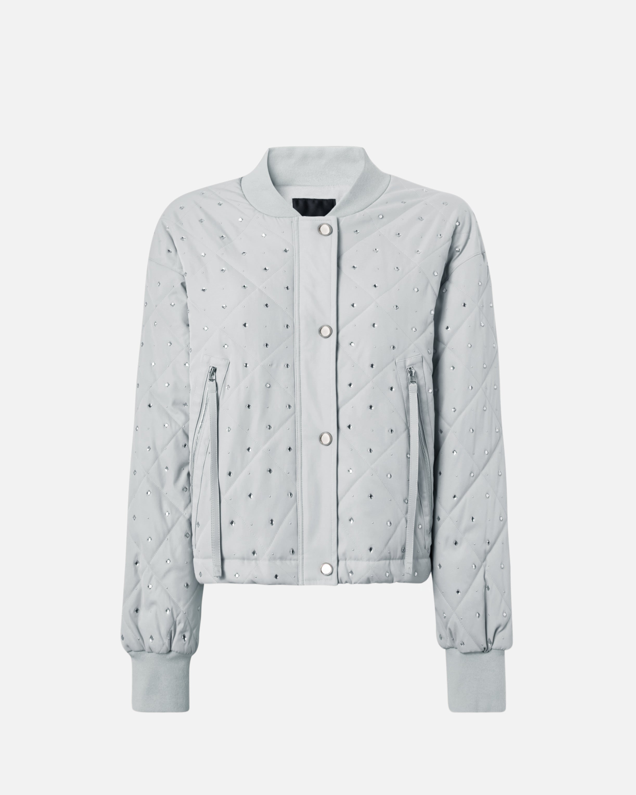 Bomber jacket made from matte-finish twill fabric with quilting and light padding. This piece is functional thanks to the zipped side pockets with tonal straps, the concealed zip and press-stud fastening and the stretch knit fabric at the neck and cuffs that provides maximum comfort. Balancing out the practicality of the garment perfectly is its embellishment: an exquisite all-over motif featuring diamond-shaped heat-transferred rhinestones and metal micro studs ready to elevate your outfits in pure PINKO style.