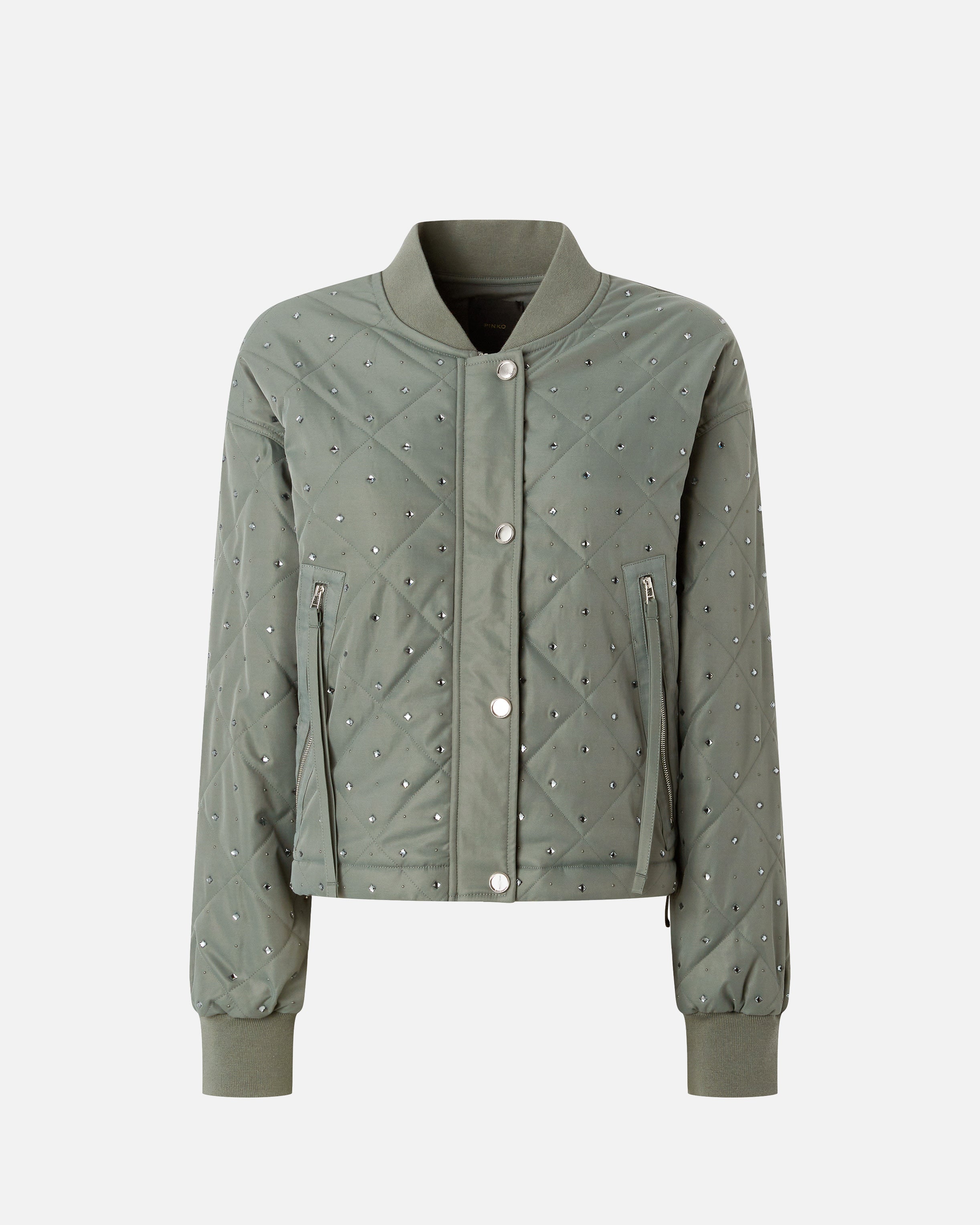 Bomber jacket made from matte-finish twill fabric with quilting and light padding. This piece is functional thanks to the zipped side pockets with tonal straps, the concealed zip and press-stud fastening and the stretch knit fabric at the neck and cuffs that provides maximum comfort. Balancing out the practicality of the garment perfectly is its embellishment: an exquisite all-over motif featuring diamond-shaped heat-transferred rhinestones and metal micro studs ready to elevate your outfits in pure PINKO style.