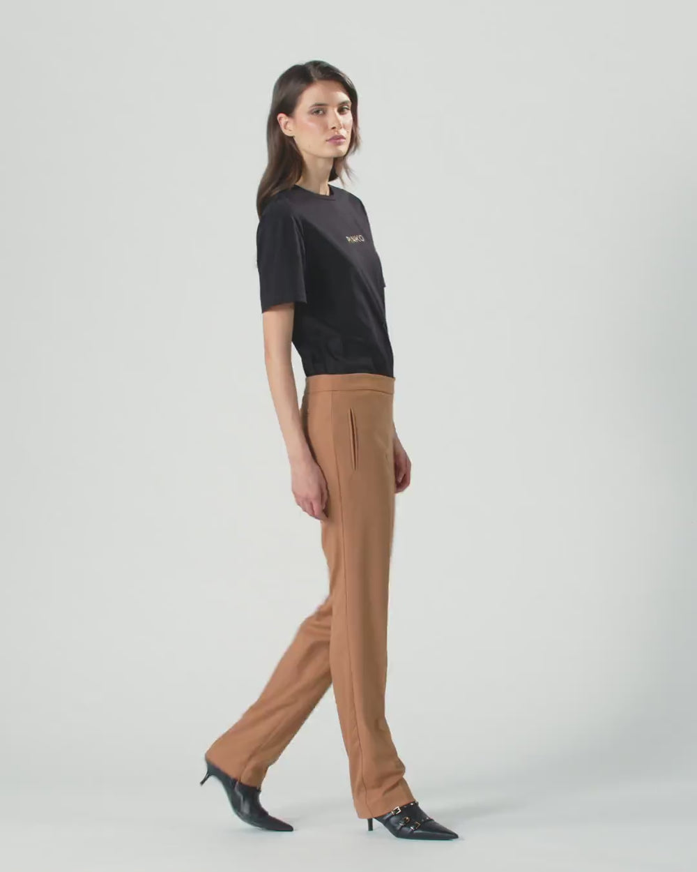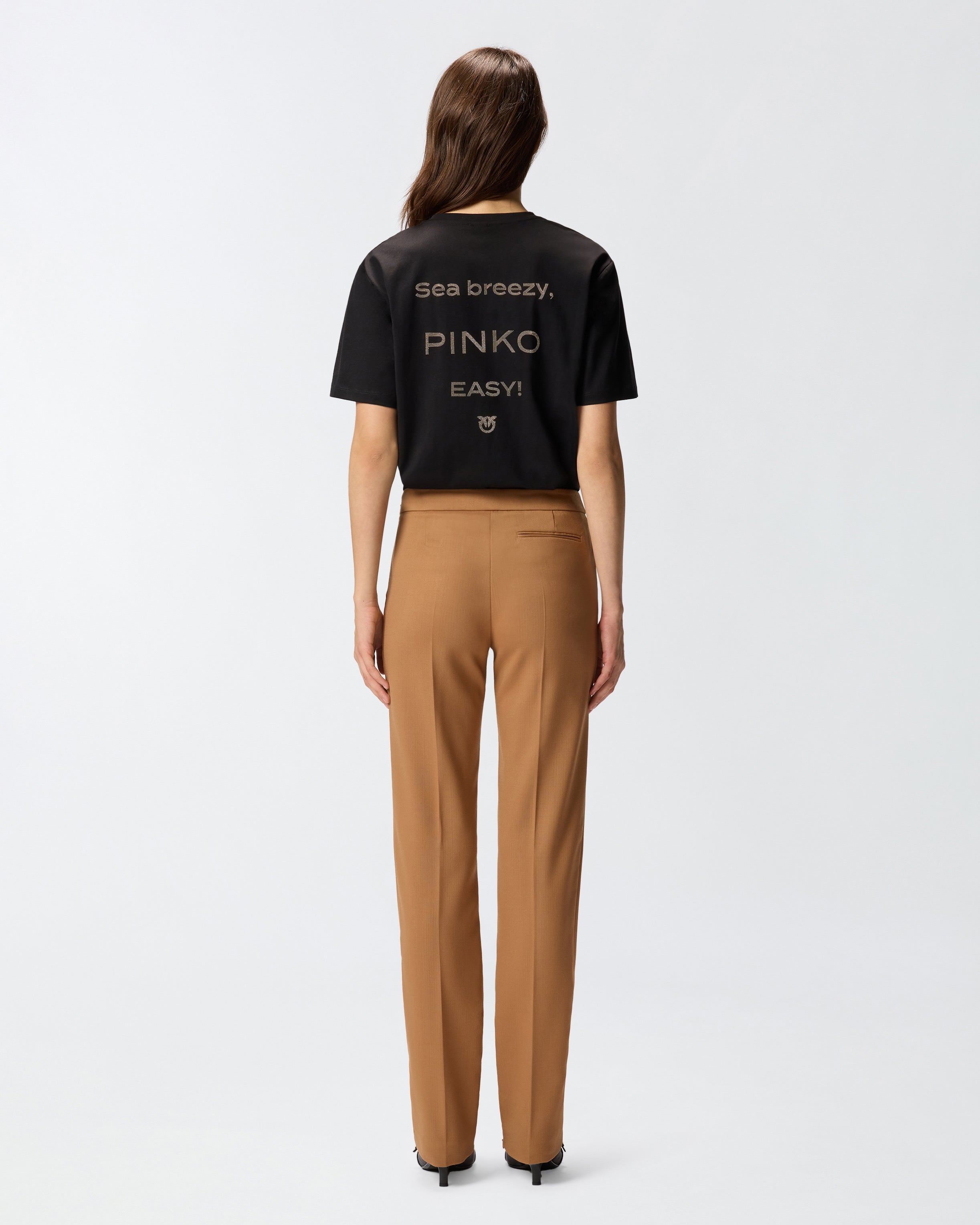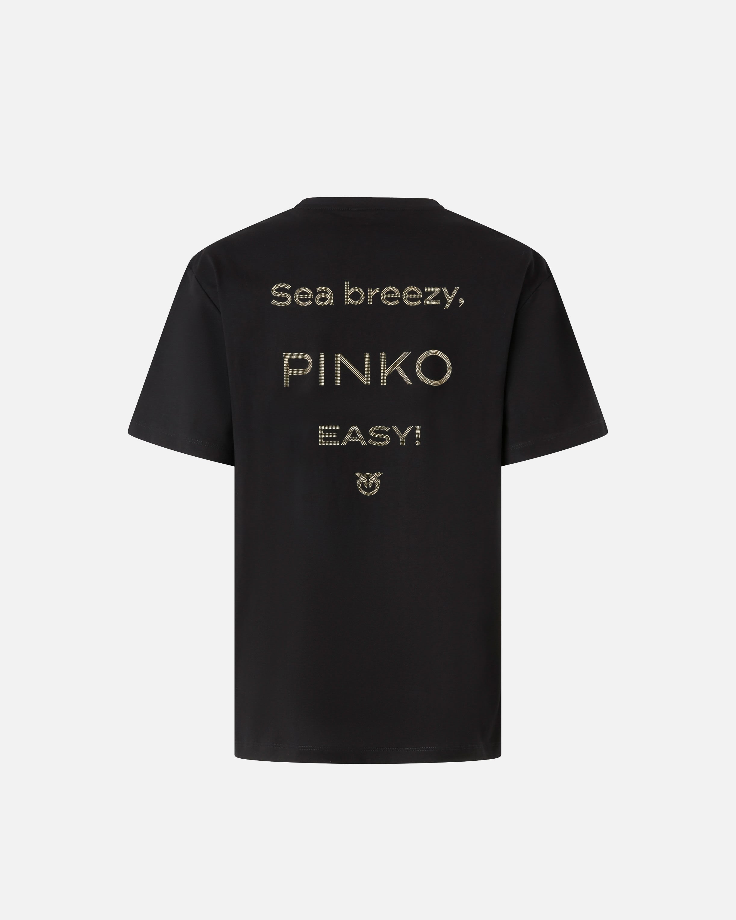 Pure cotton jersey T-shirt with round neck and short sleeves. The piece features shiny rhinestones that cover both the PINKO lettering logo on the front and the lettering on the back with the slogan See breezy, PINKO easy and our must-have Love Birds logo. This T-shirt will work seamlessly with your favourite trousers, elevating your look in a simple, elegant and original way.