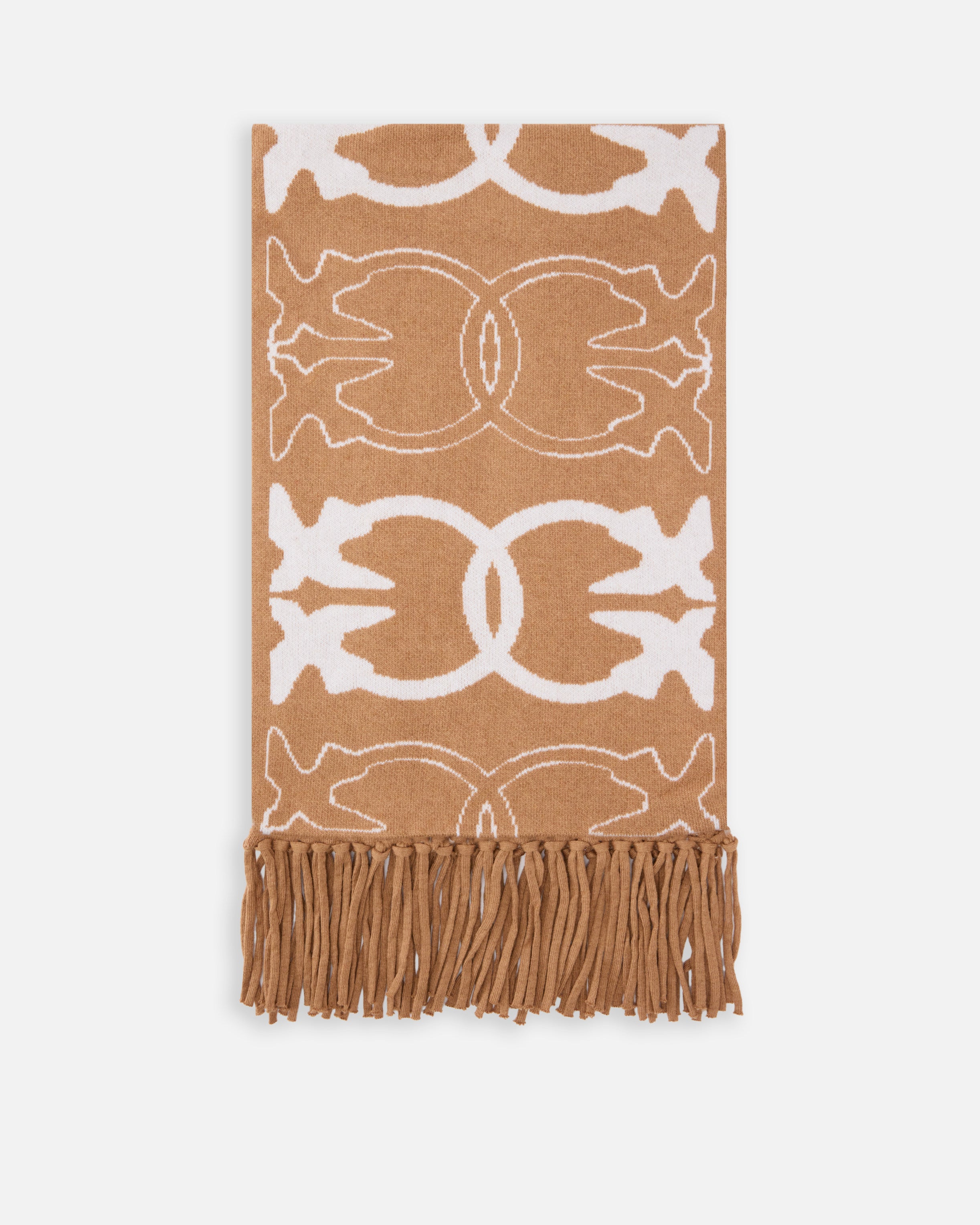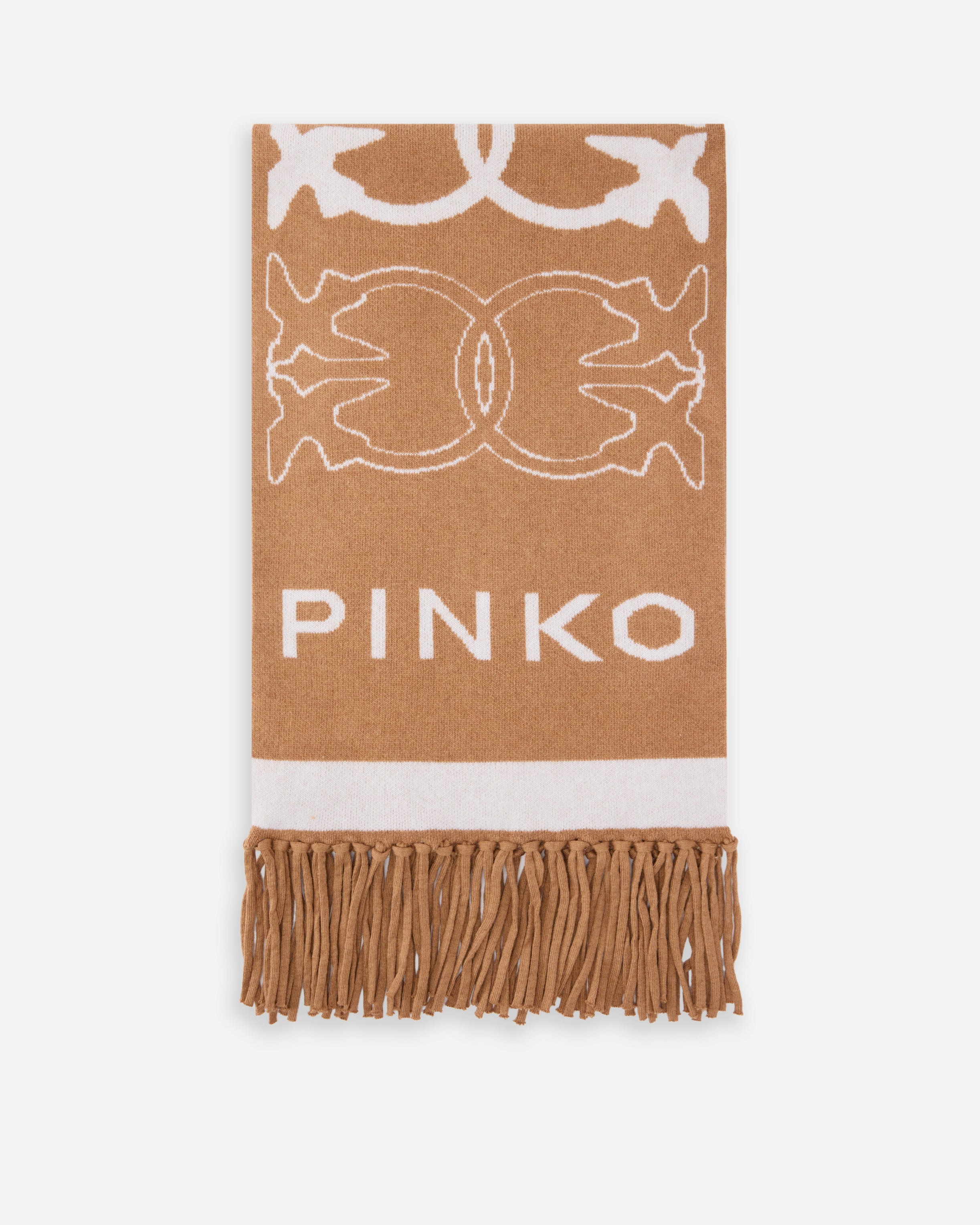 Wool, cashmere and viscose-blend scarf with a soft hand. The contrasting ends, the all-over Love Birds logo pattern with jacquard detailing and the PINKO lettering maxi-logo are striking elements that enhance the design. The fringing at the bottom completes the look, adding a touch of movement. Face the coldest days in full-on PINKO style with this refined winter wardrobe essential.