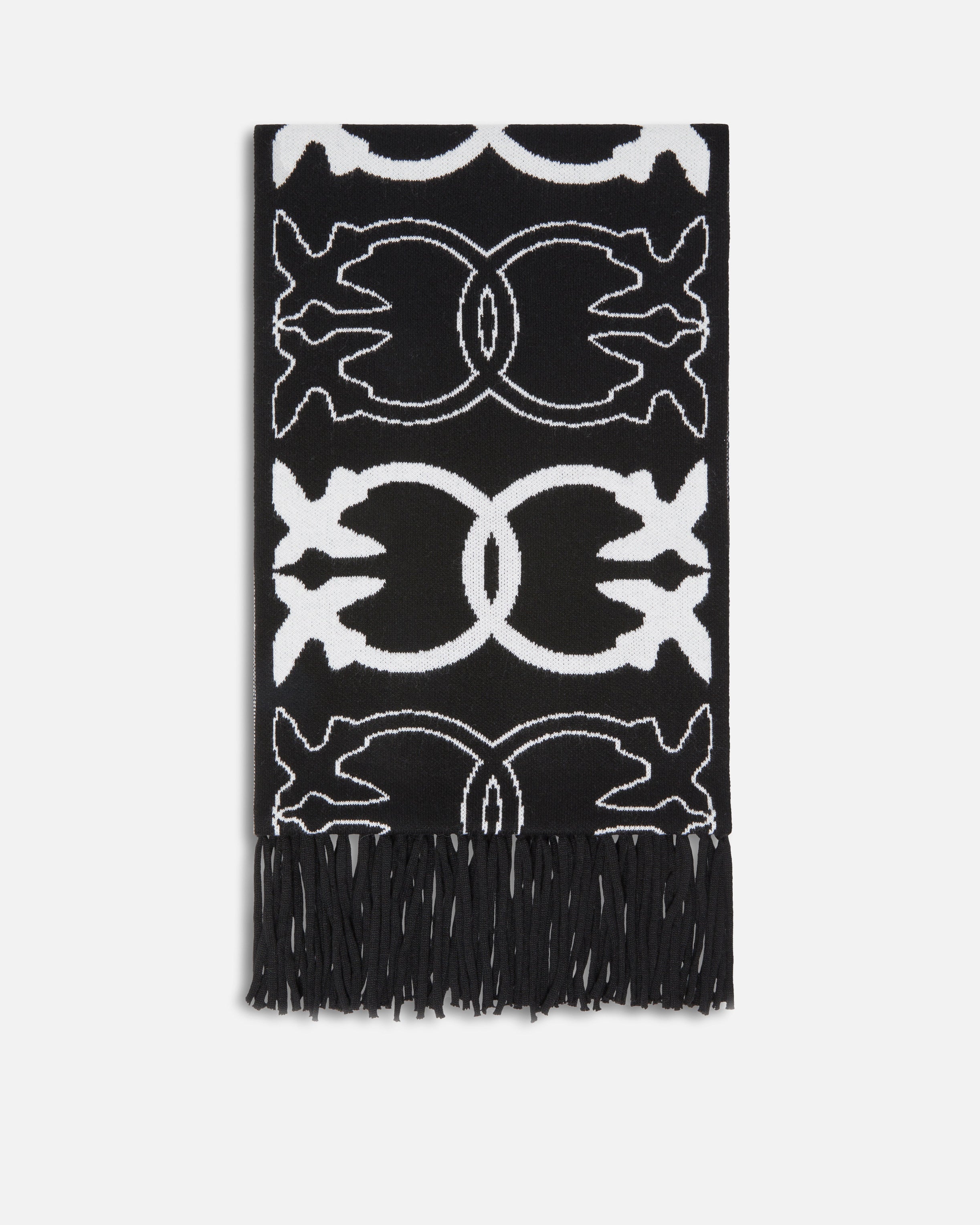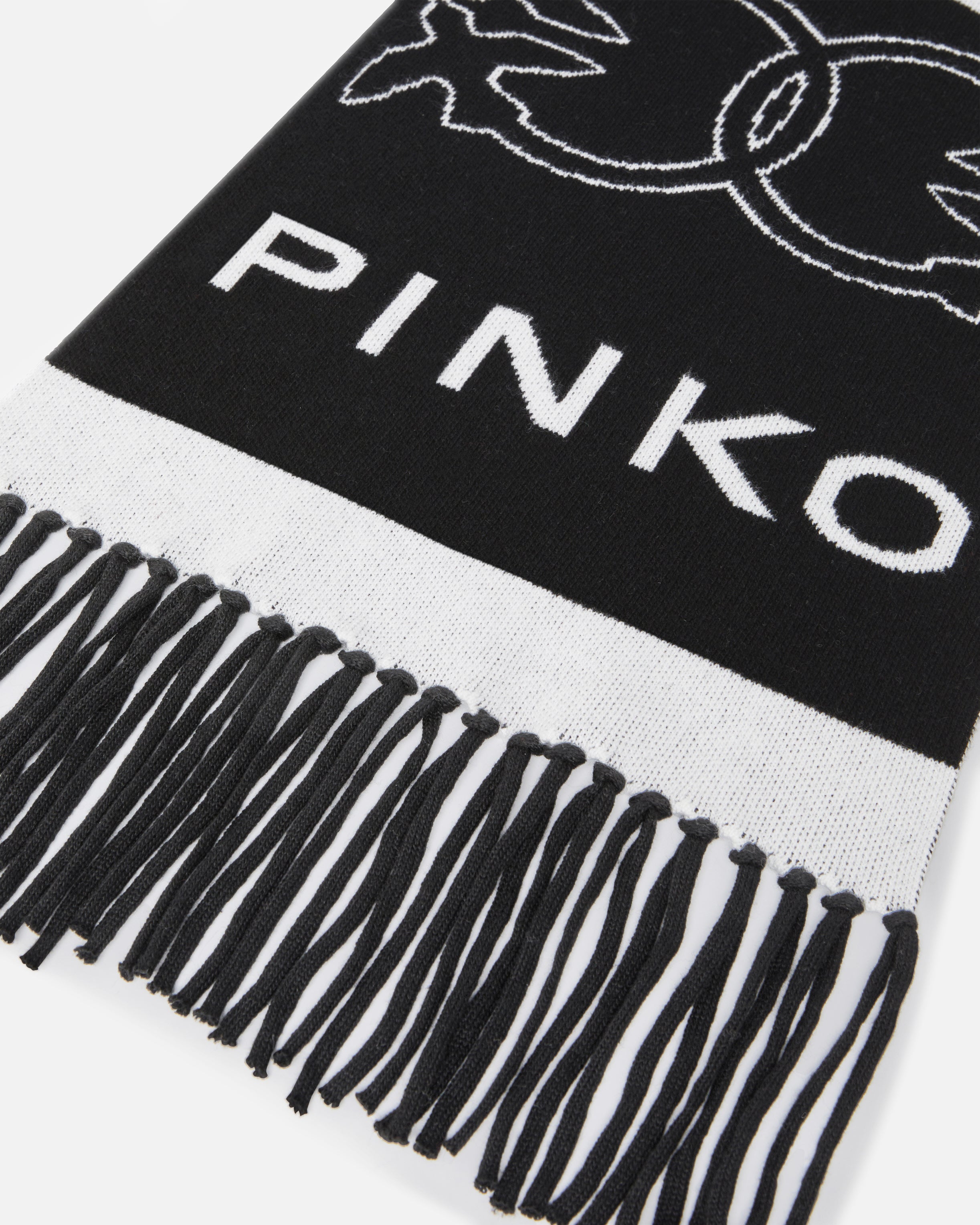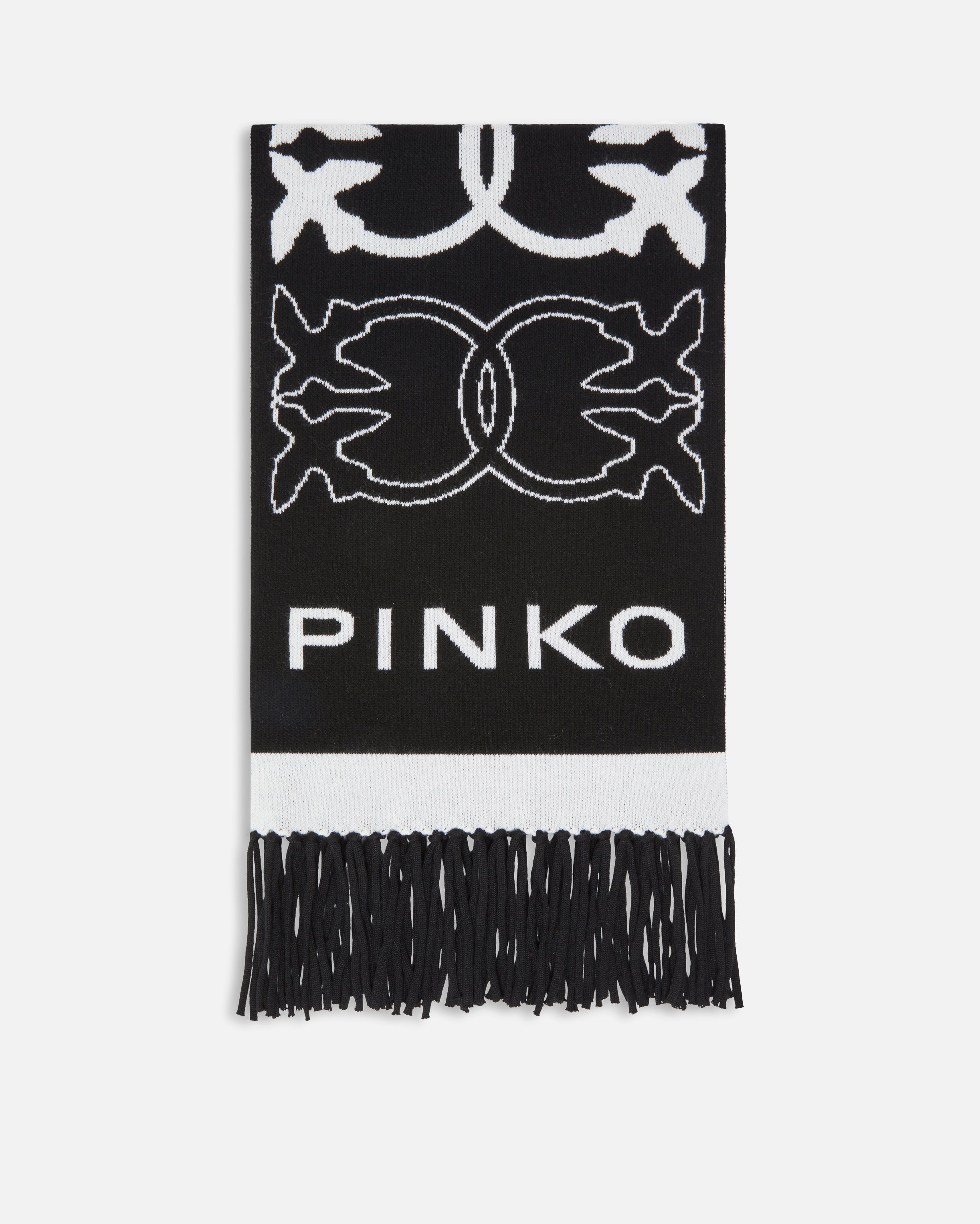 Wool, cashmere and viscose-blend scarf with a soft hand. The contrasting ends, the all-over Love Birds logo pattern with jacquard detailing and the PINKO lettering maxi-logo are striking elements that enhance the design. The fringing at the bottom completes the look, adding a touch of movement. Face the coldest days in full-on PINKO style with this refined winter wardrobe essential.