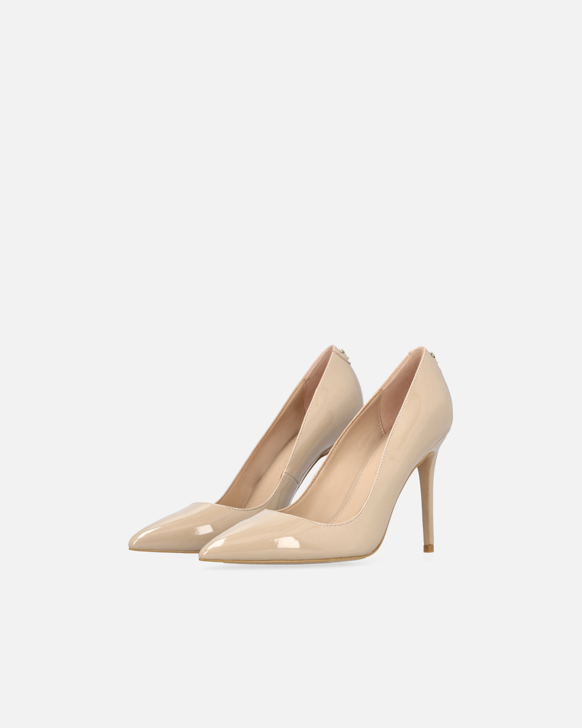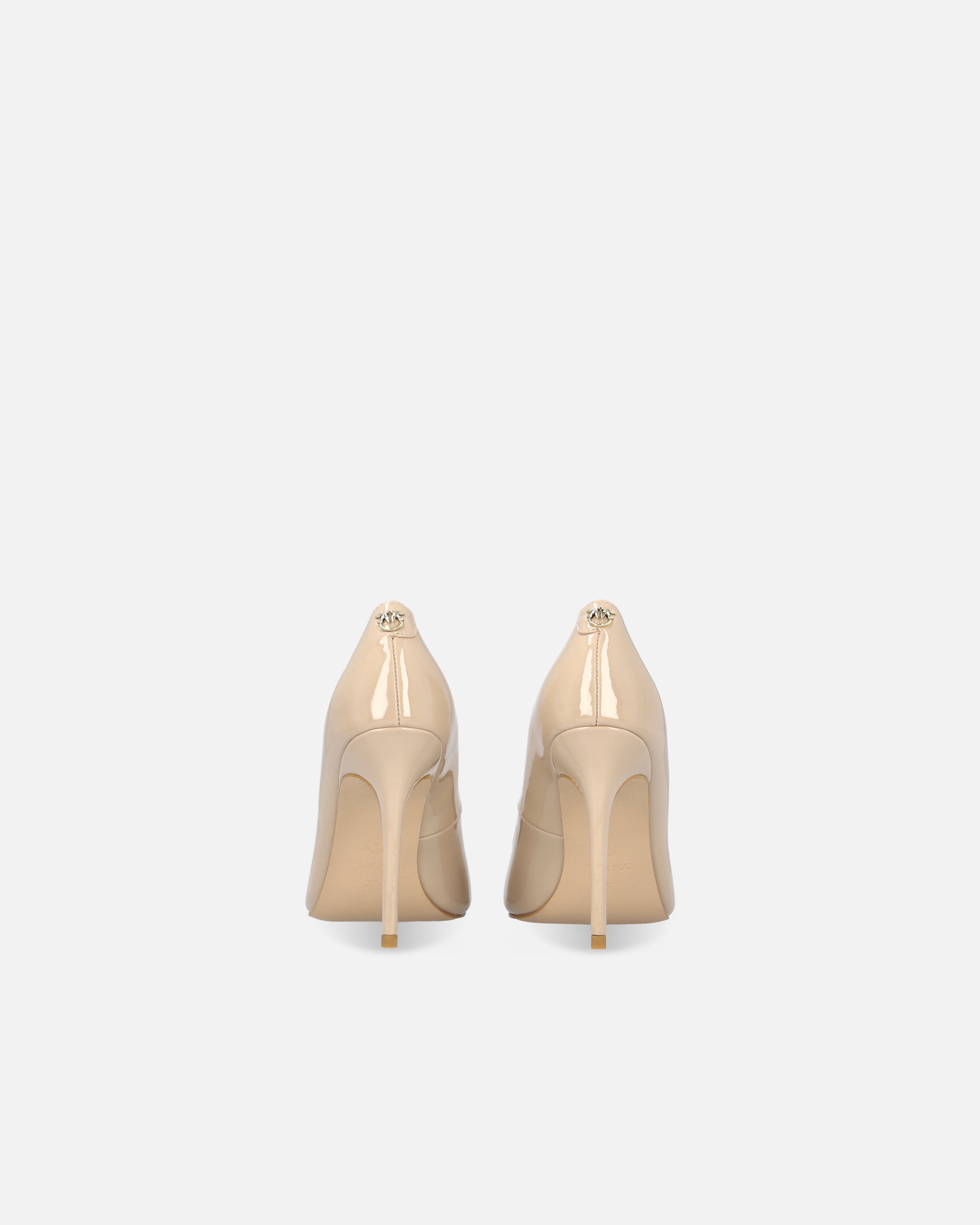 Pumps in patent leather-effect fabric with tapered toe and custom mini Love Birds logo plaque on the heel. Sole made from tunit, a synthetic material with properties similar to leather, 10.5 cm stiletto heel, and leather lining and insole.