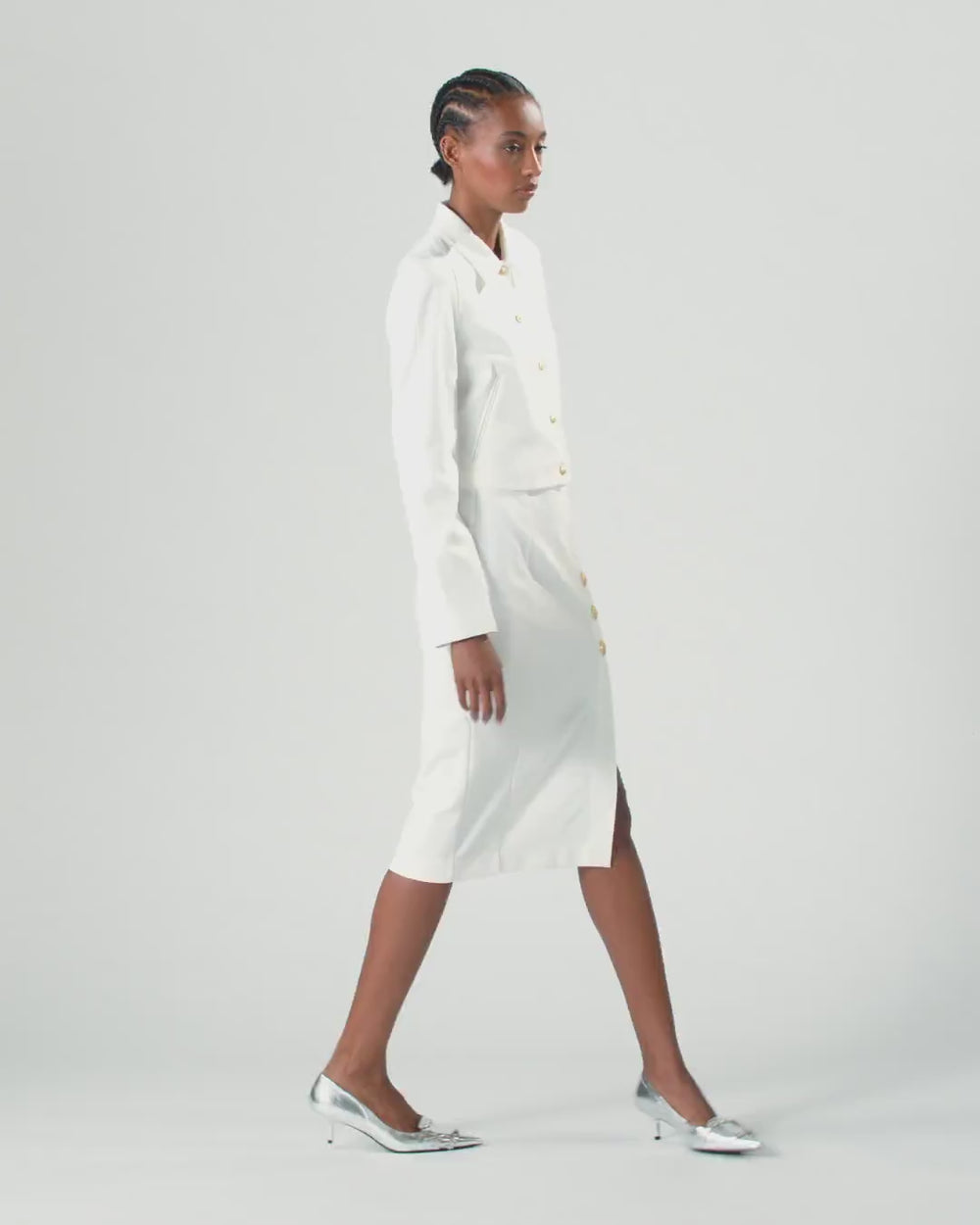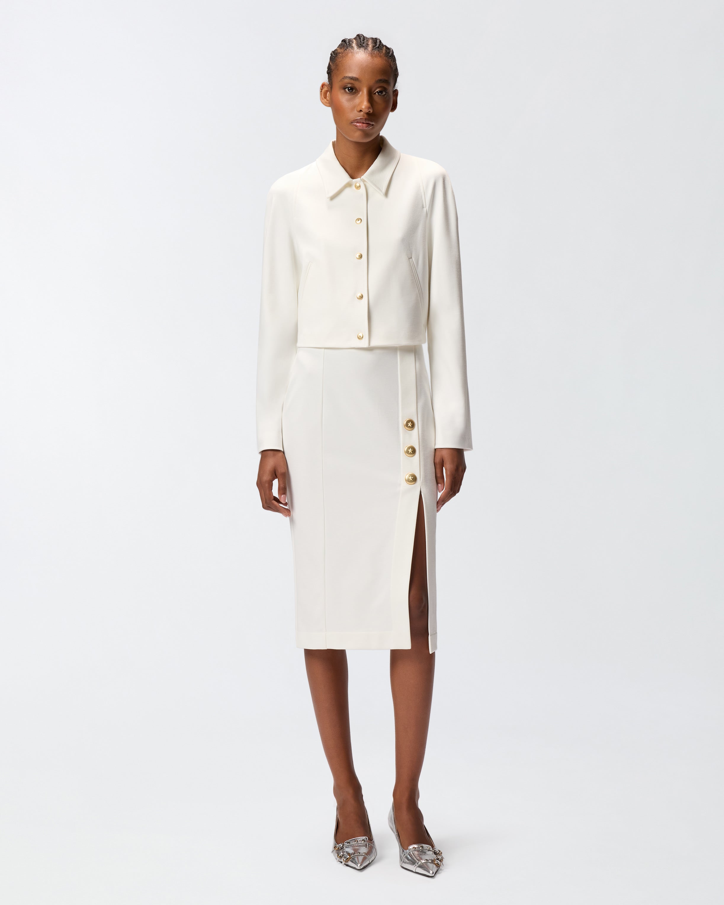 Short jacket with a straight hem and classic shirt collar made from full Milano-knit technical fabric. This style comes in a slim fit and features a design with long sleeves and no pockets for a minimalist style that has not sacrificed feminine details. This piece is the perfect solution when you are searching for a refined and effortless look, with an extra elegant touch.