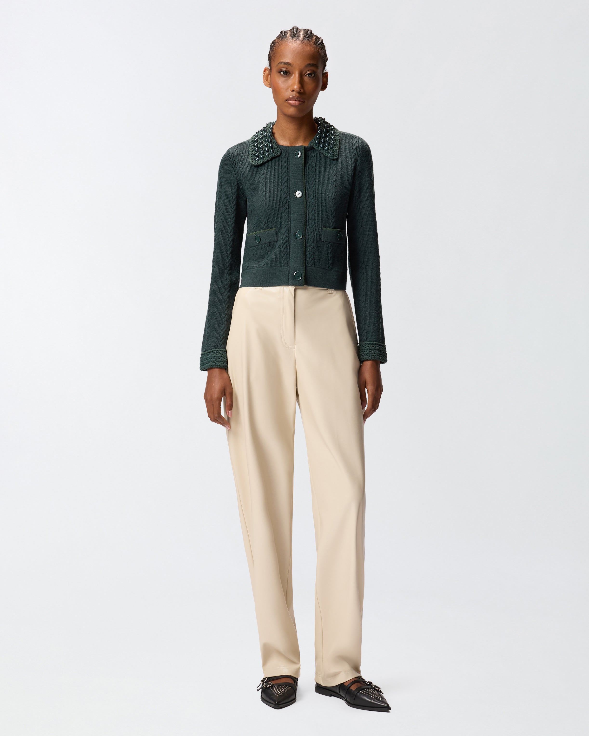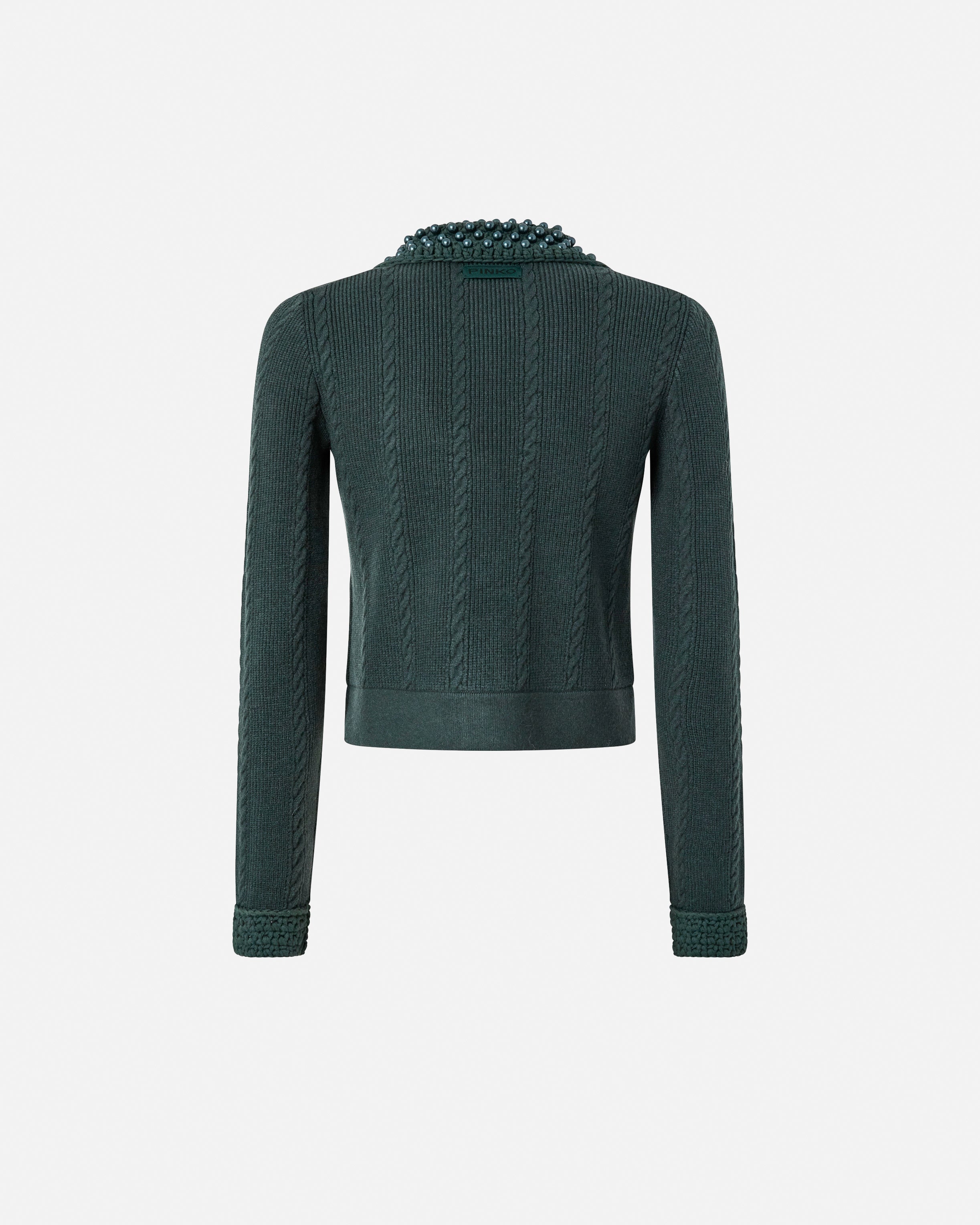 Slim-fitting short jacket in knit viscose-blend fabric. The design is animated by the alternating cable knit and rib knit, as well as being embellished by the pearl detailing in the same colour on the collar. The four buttons on the front are also found on the two side pockets. The final touch is given by the tone-on-tone label with PINKO lettering logo behind the neck. The piece has undergone finishing tests to minimise the possible formation of pilling, ensuring greater fabric softness and durability. The perfect choice for a comfortable look that does not compromise on elegance.