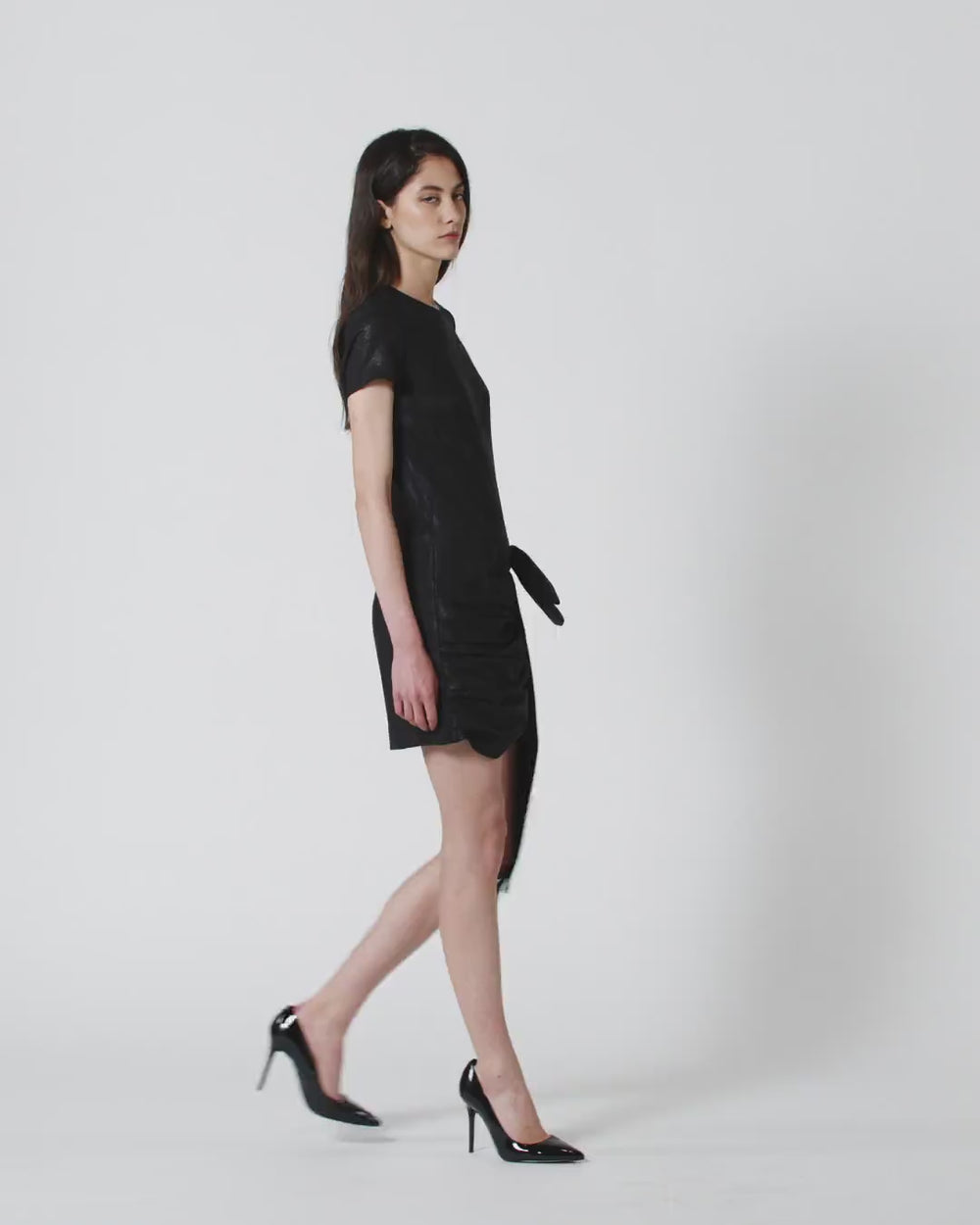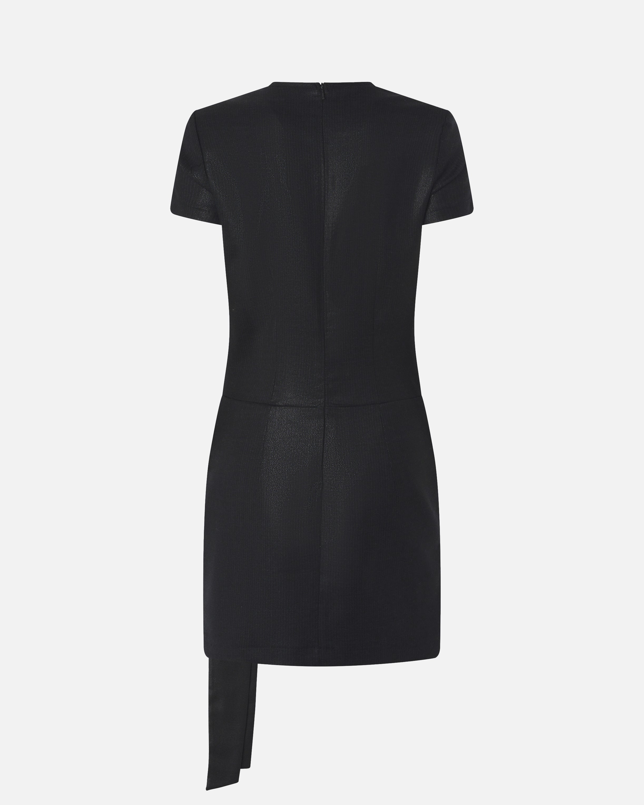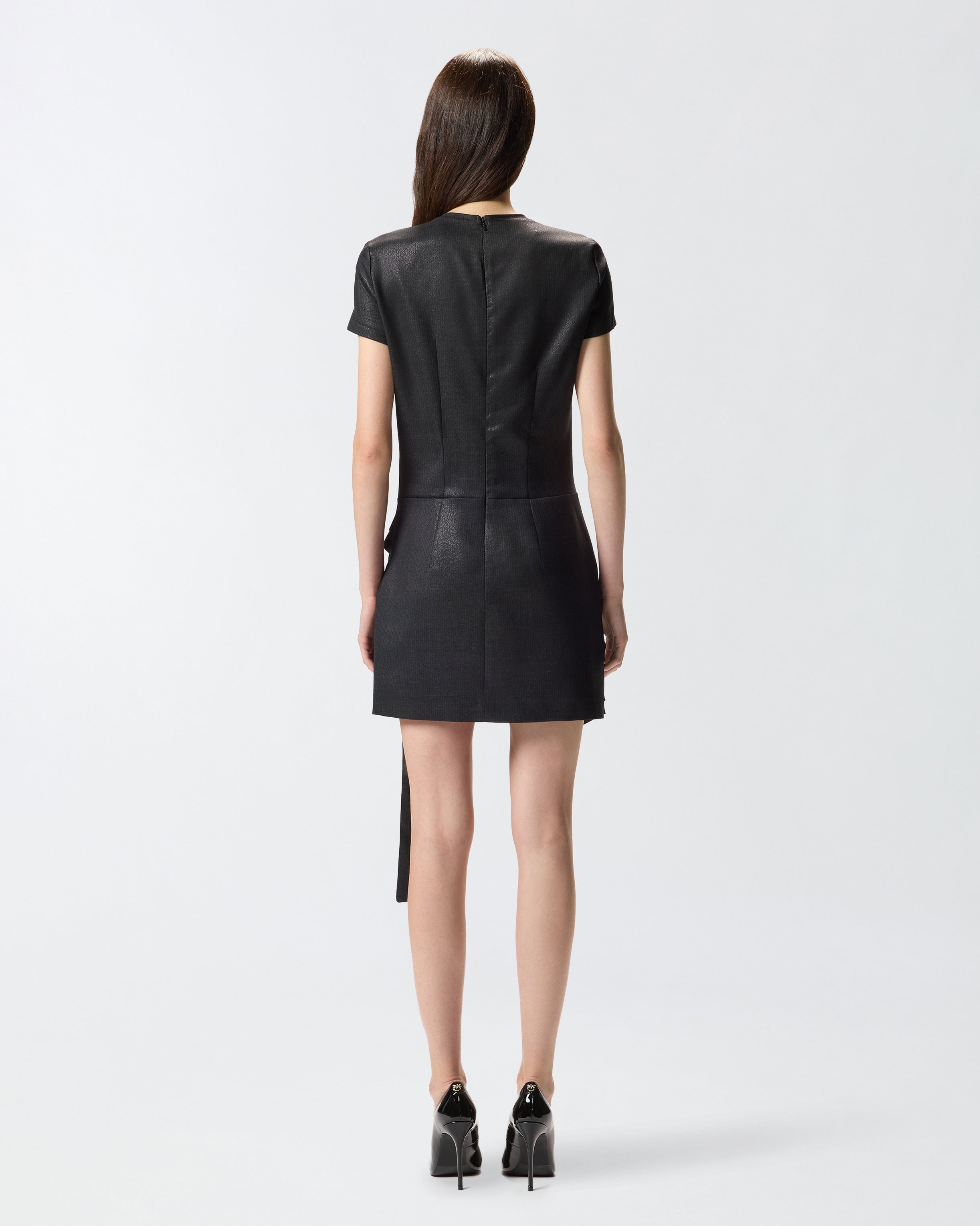 Short sheath dress made from wool-blend fabric shot through with metallic thread, which creates a very delicate and slightly iridescent pinstripe effect depending on how the light hits the fabric. This short dress also features a crew-neck design and soft draping on the front of the skirt, accompanied by a side sash. Concealed zip at the back.