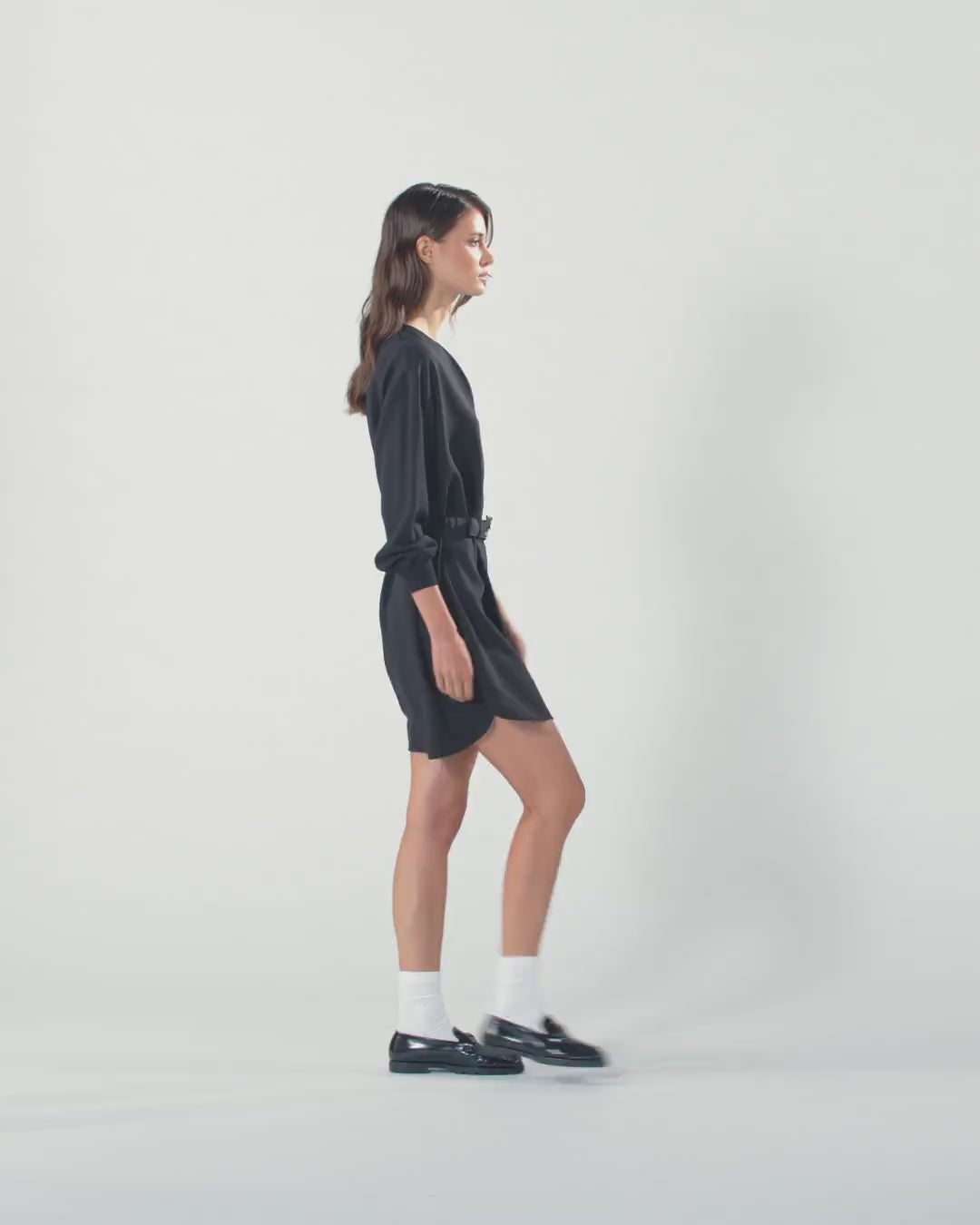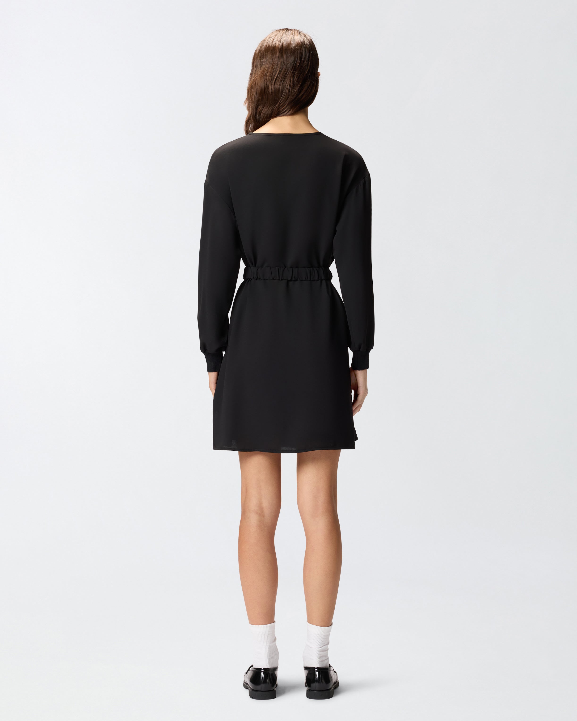 Short round-neck dress defined by a V-shaped opening on the front and long loose sleeves with dropped shoulders and stretch cuffs. The very fine, fluid and light technical crepe fabric is particularly suitable for everyday wear. Complete with a matching-fabric belt with the metal Love Birds Diamond Cut buckle. Wear it every day to get practicality, romance and femininity in one piece that can be worn from the office to after-work drinks.