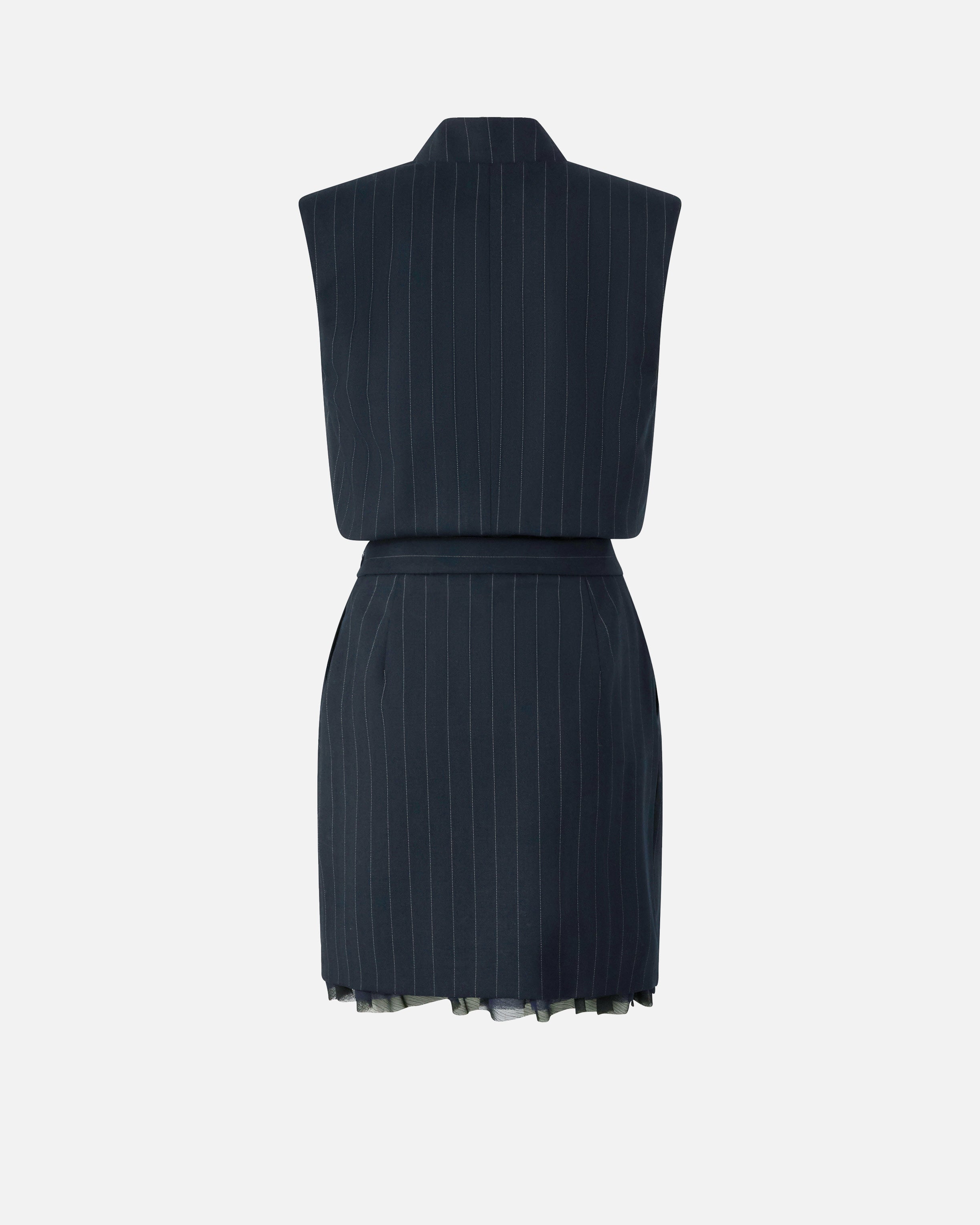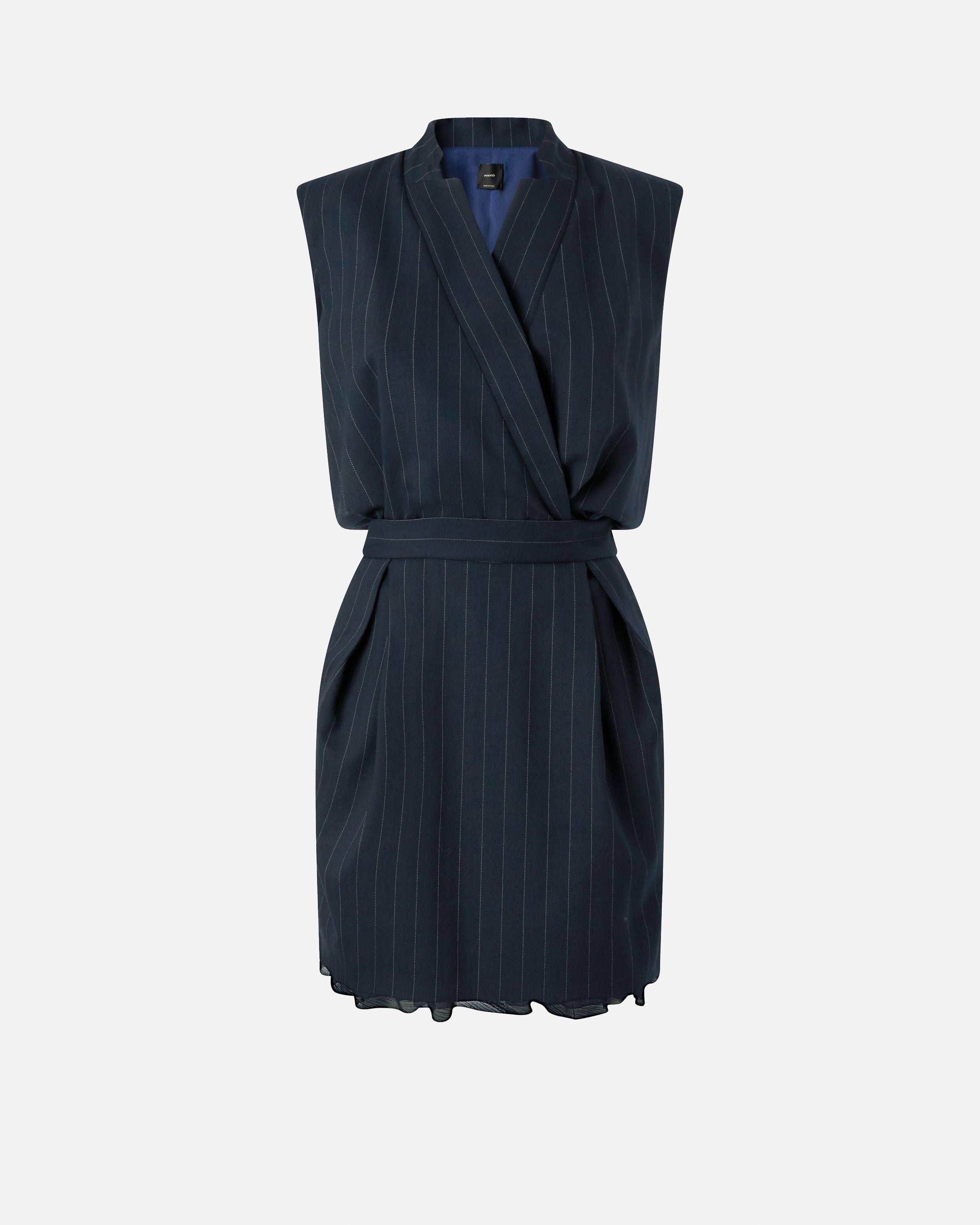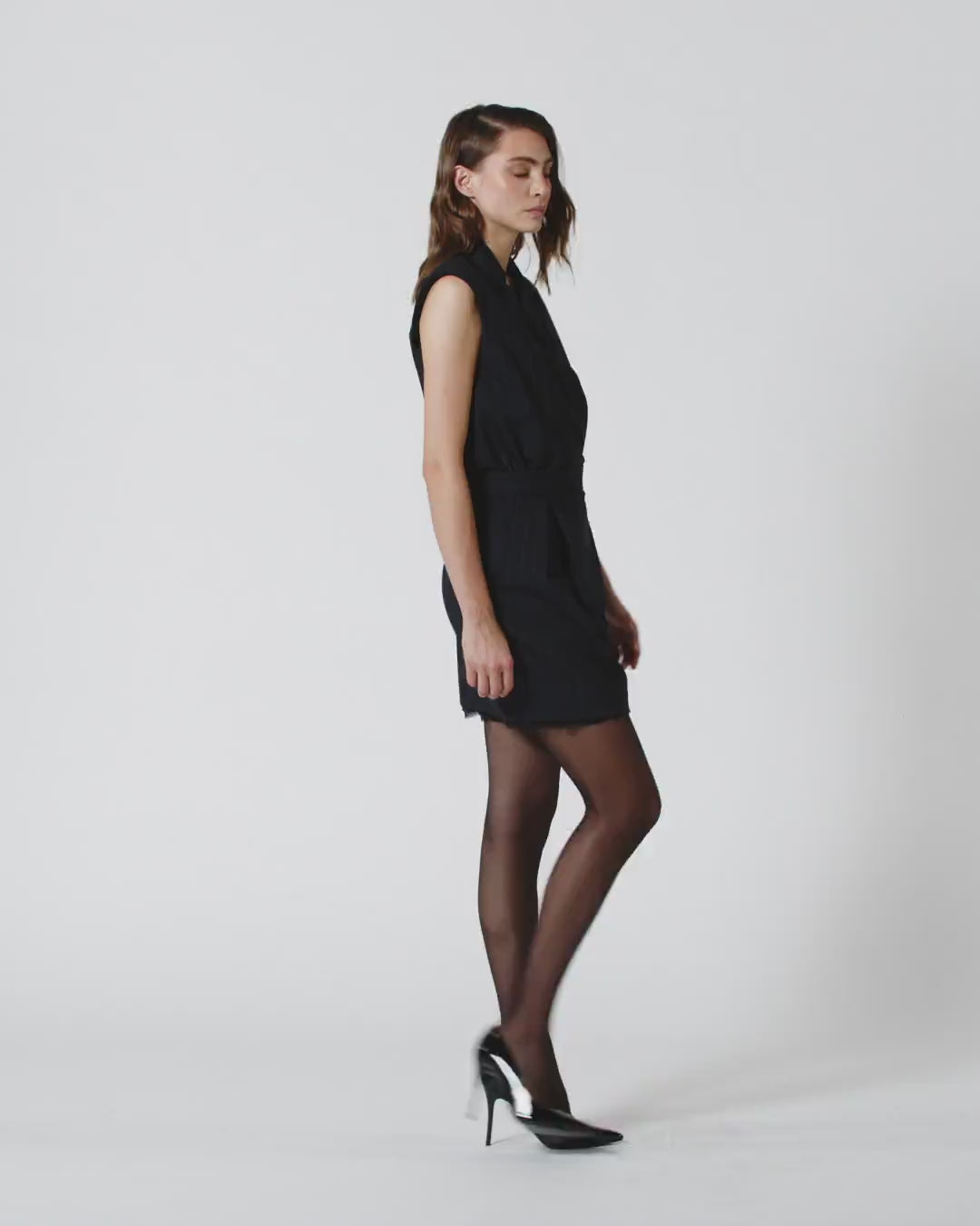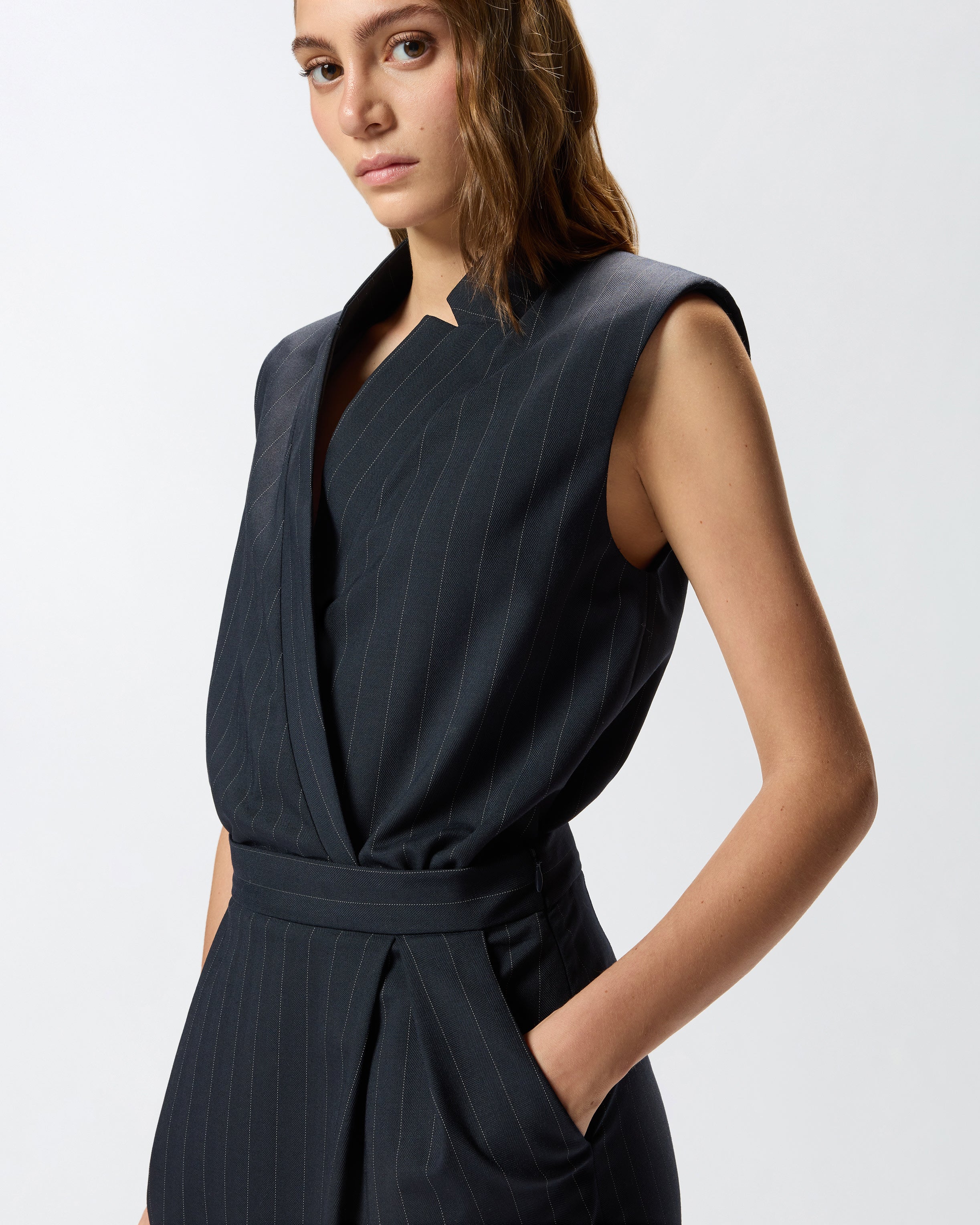 Short, sleeveless dress made from a durable poly wool fabric that prevents creasing and features a distinctive double herringbone weave that emphasises the pinstripe pattern. The dress features a wrap design with a lapel collar, a waist belt to emphasise the silhouette and balloon skirt with double raw-cut flounce to add a touch of femininity, in contrast to the rigour of the fabric. Lined model.