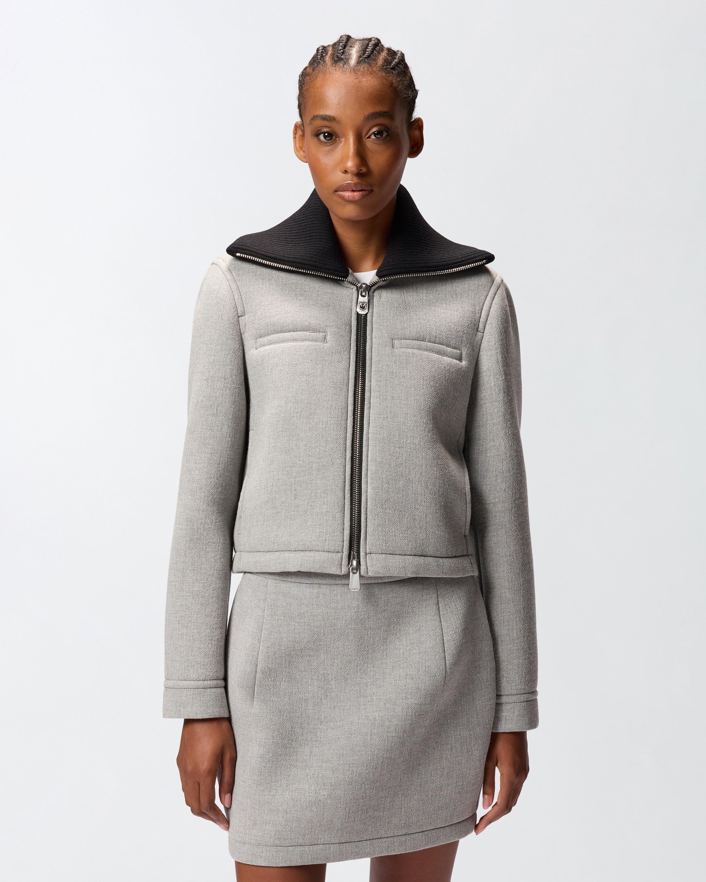 Slim-fitting jacket in washed and bonded wool gauze with two-way full-zip fastening and chest pockets. The fabric gives the garment a modern, compact effect, while the structured design is perfect for everyday looks. The focal point of the piece, however, is the knit high neck that contrasts with the plain colour of the design.