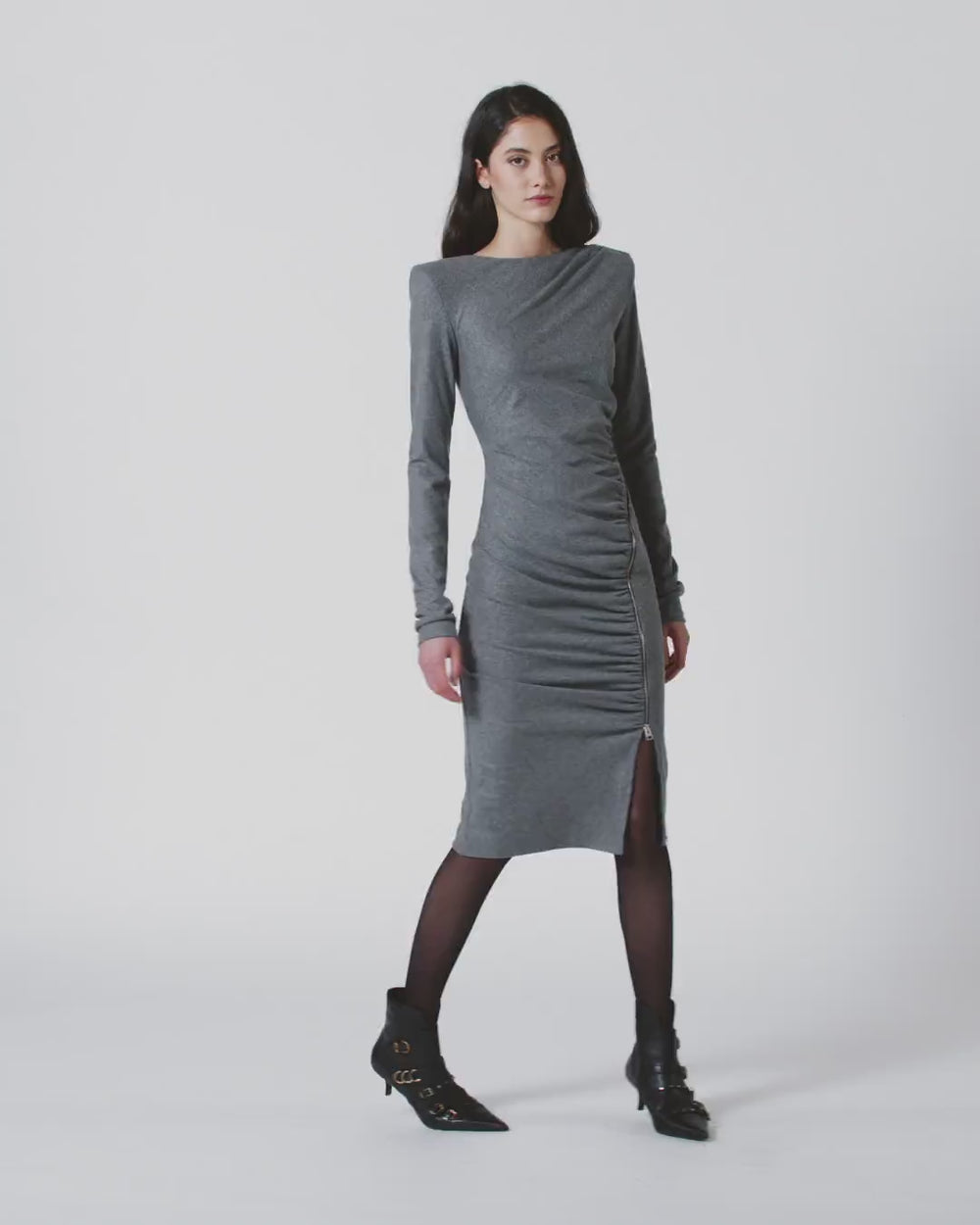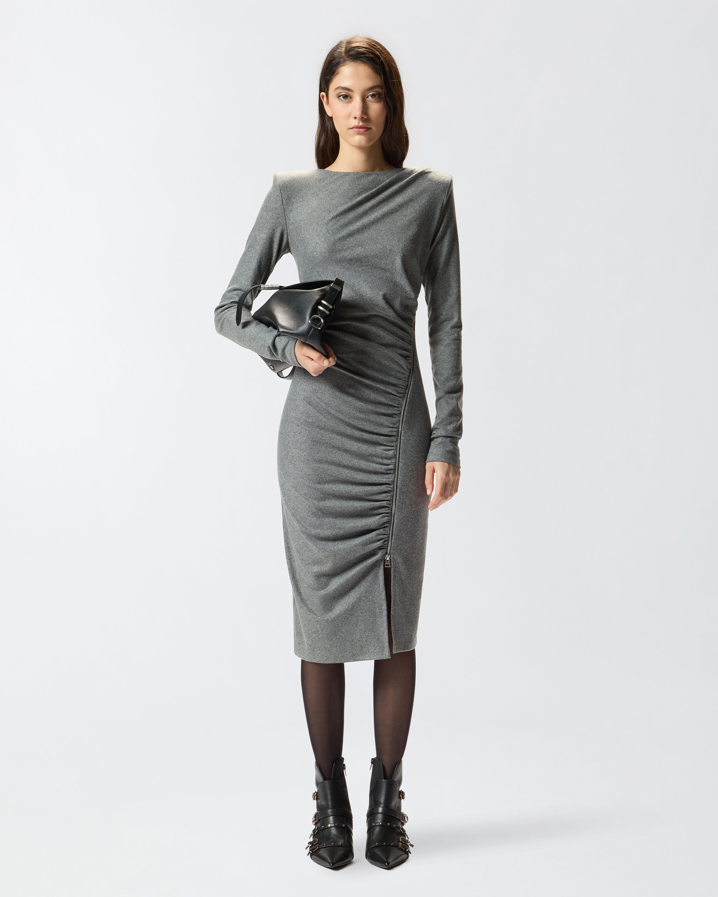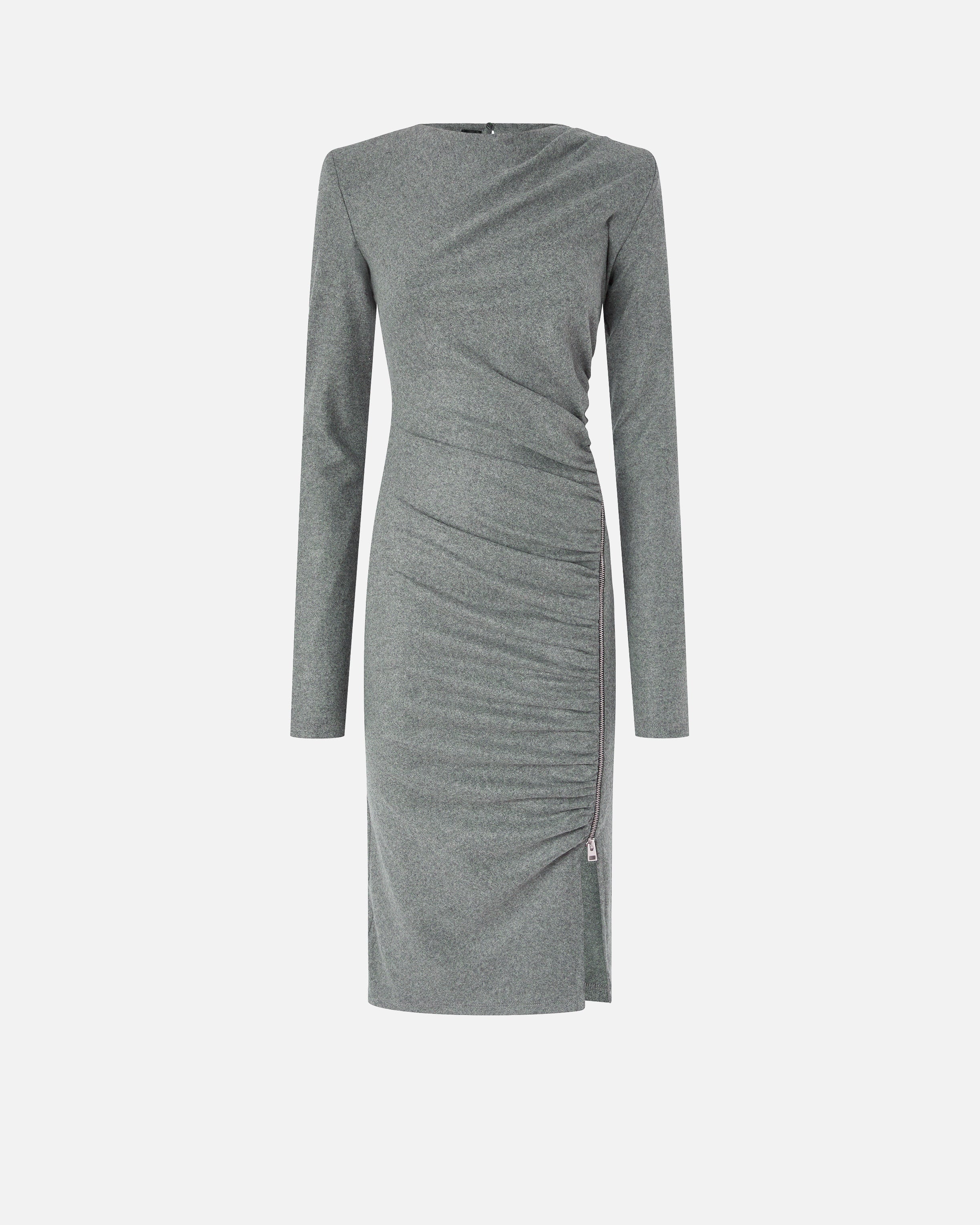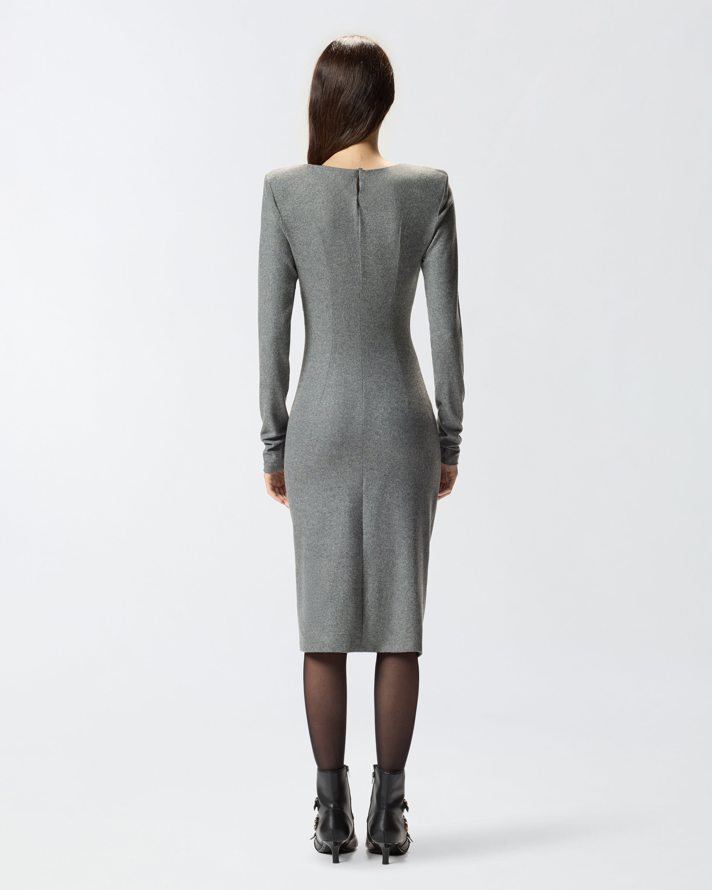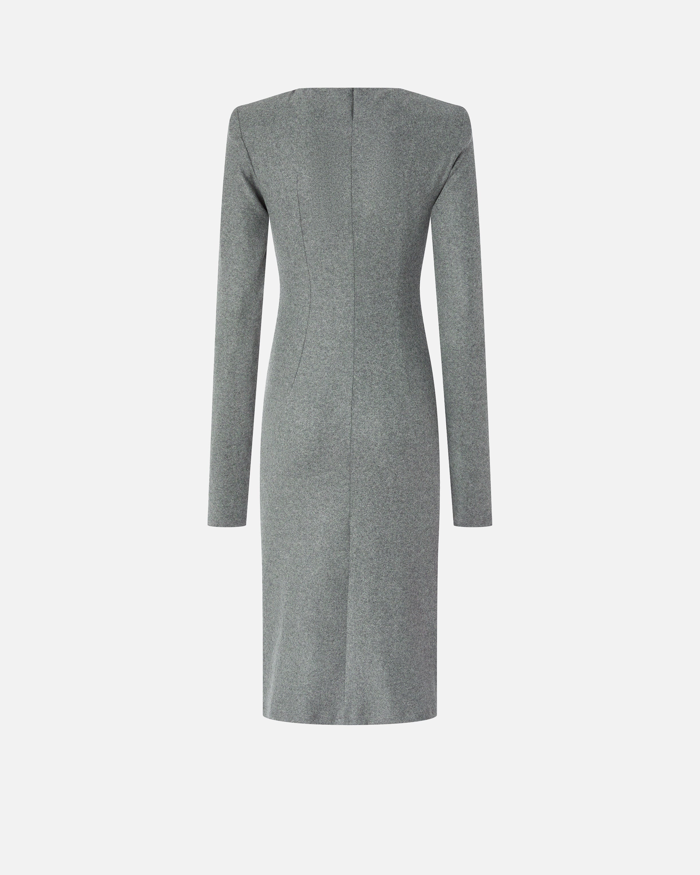 Fitted long-sleeved midi dress with structured shoulders and teardrop collar with button on the back, made of yarn-dyed wool blend jersey flannel, a perfect fabric to combine tailoring and comfort. The model shows an essential aesthetic, but enriched by striking details such as the dynamic drapes on the front and the side zip that allows you to adjust the opening of the slit. This dress is ideal for creating an everyday outfit with a feminine and personal touch, to be worn even in the office.