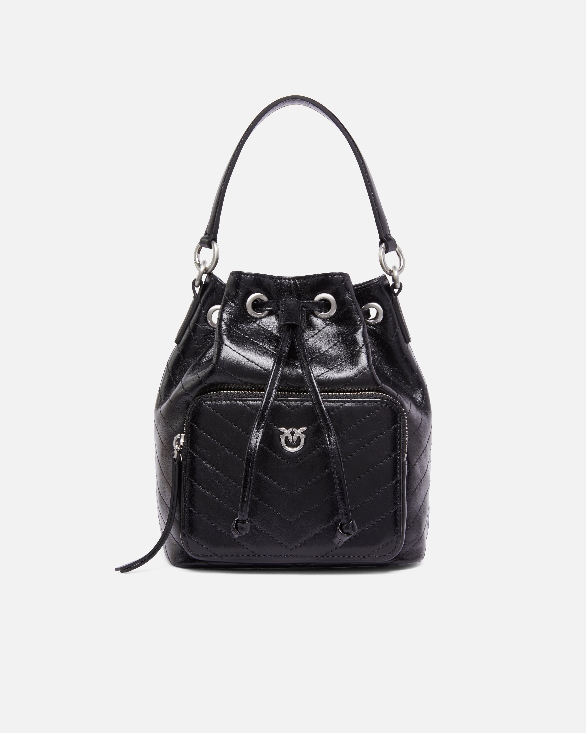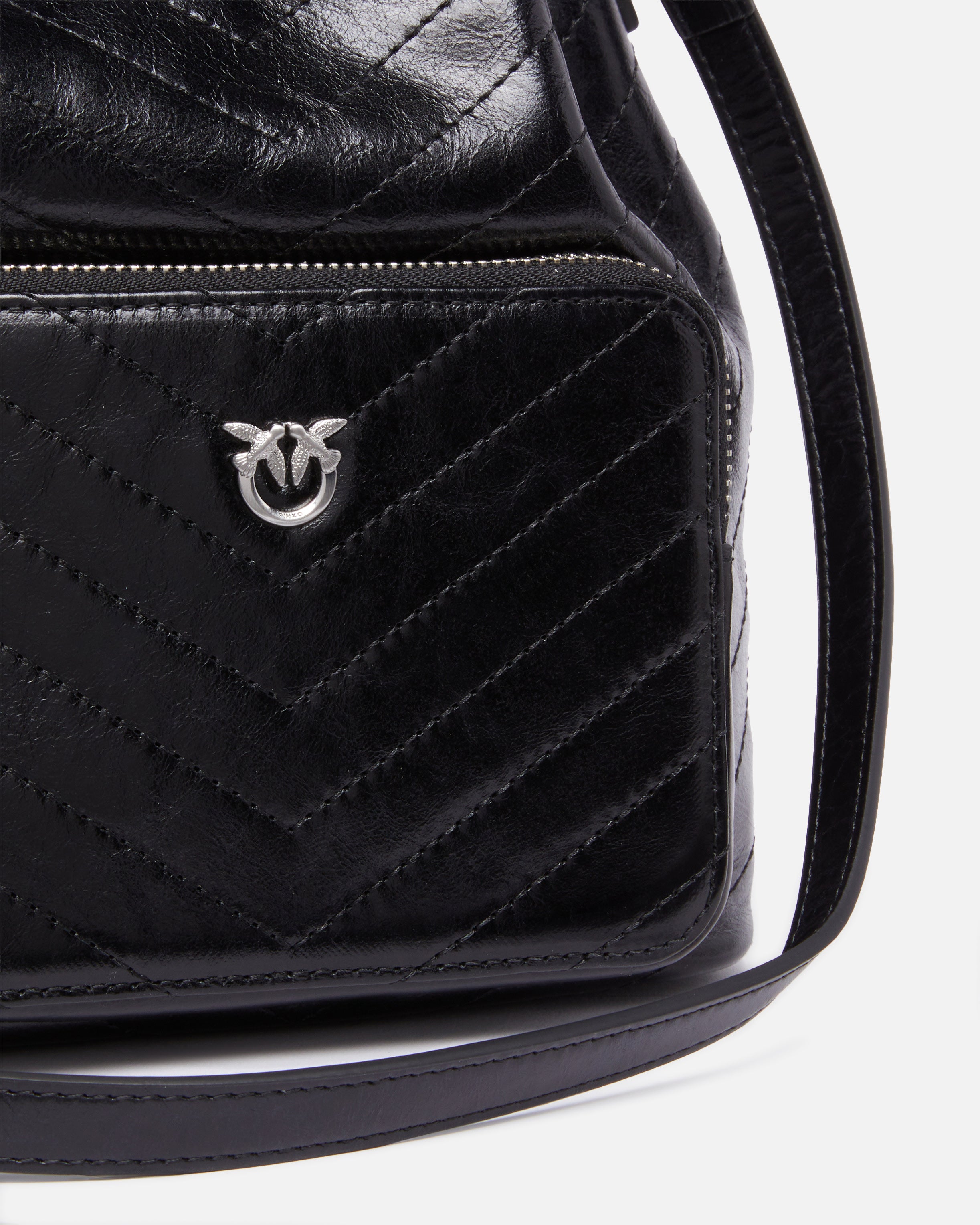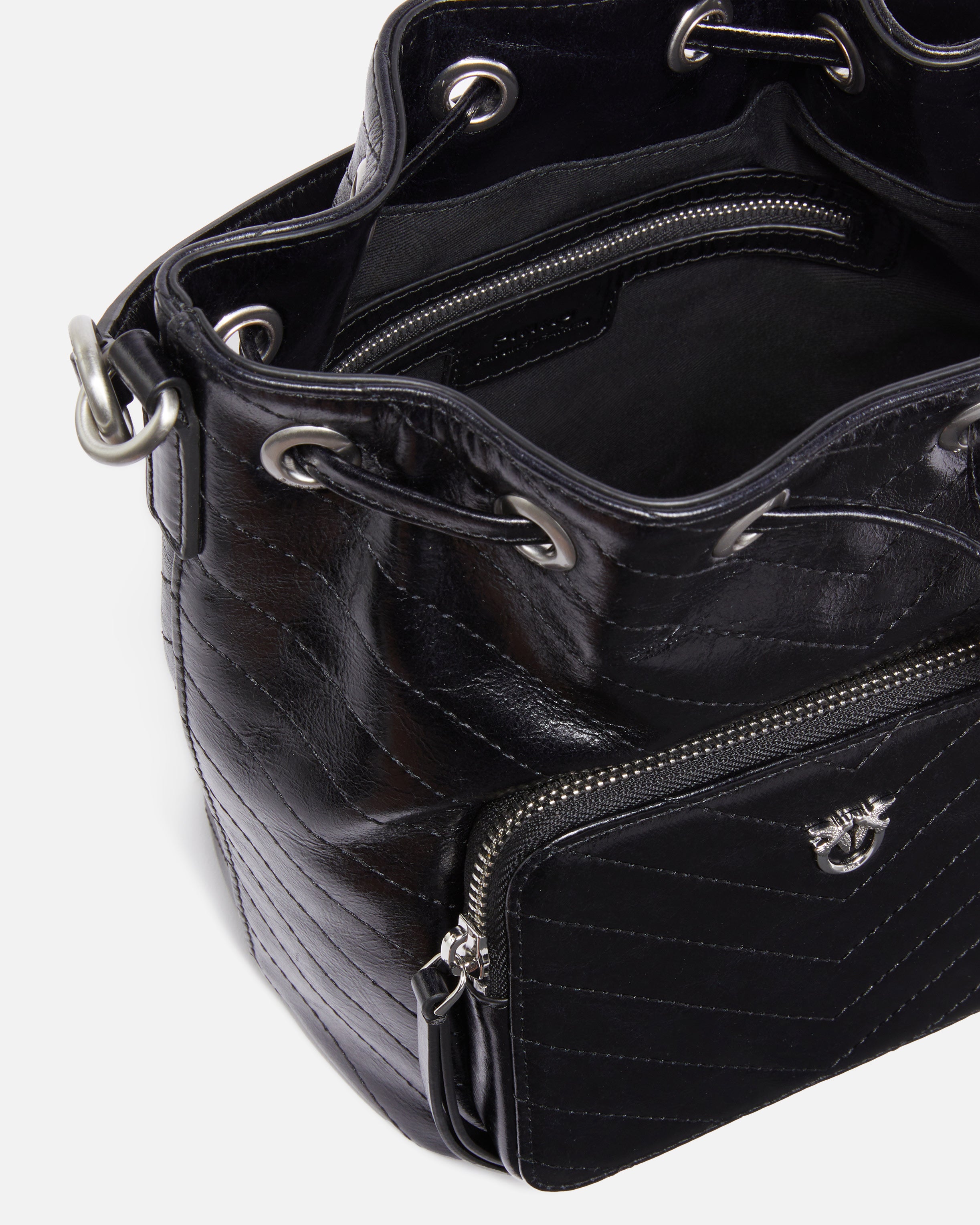 Small leather Cargo Bucket Bag with a slightly gathered, wrinkled texture and chevron quilting and a cotton lining. A distinctive accessory that is perfect for endless looks, this bag has a drawstring to adjust the fastening and an outer zip pocket to keep your essentials safe. Featuring an adjustable and detachable leather shoulder strap and handle so it can be carried by hand or on the shoulder, the bag is extremely versatile and practical. The refined design is complemented by the Love Birds logo, which embodies the inimitable style of the brand. Activate your PINKO bag: verify the authenticity of your product and access a personalised experience by scanning the Love Birds embroidery on the back of the bag with your smartphone!