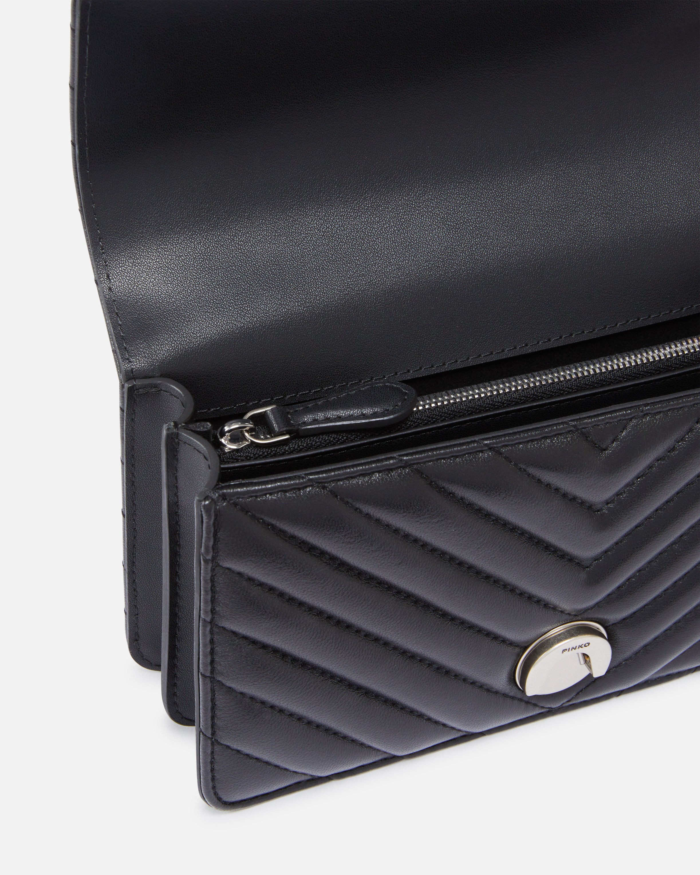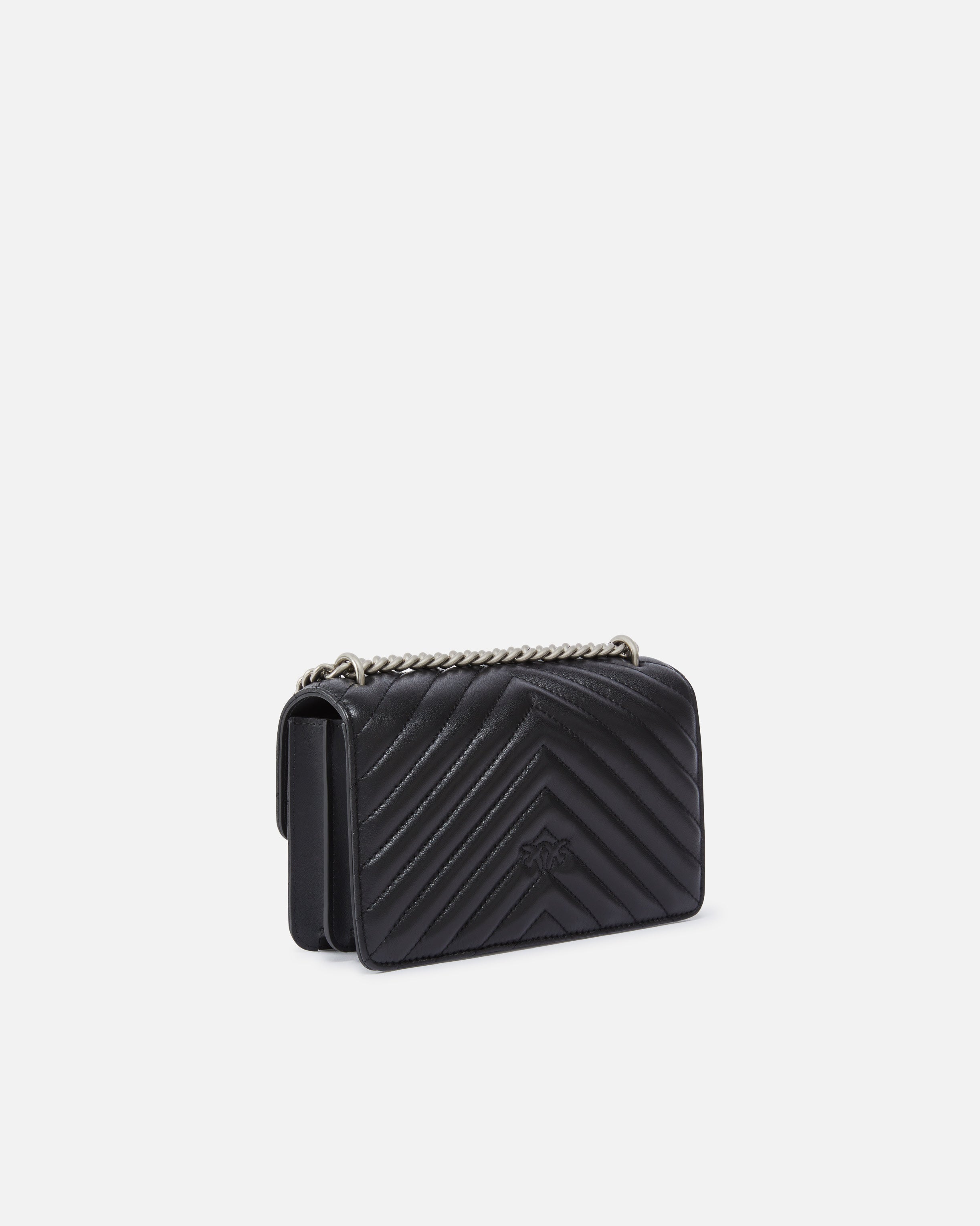 Mini Love Bag One in quilted nappa leather with chevron pattern. The fastening is embellished with the iconic metal Love Birds Diamond Cut buckle. The accessory boasts a suede microfibre-lined interior, complete with a zipped centre divider pocket and leather slip pocket. The shoulder strap combines the classic round-link chain with a practical, adjustable leather shoulder pad.