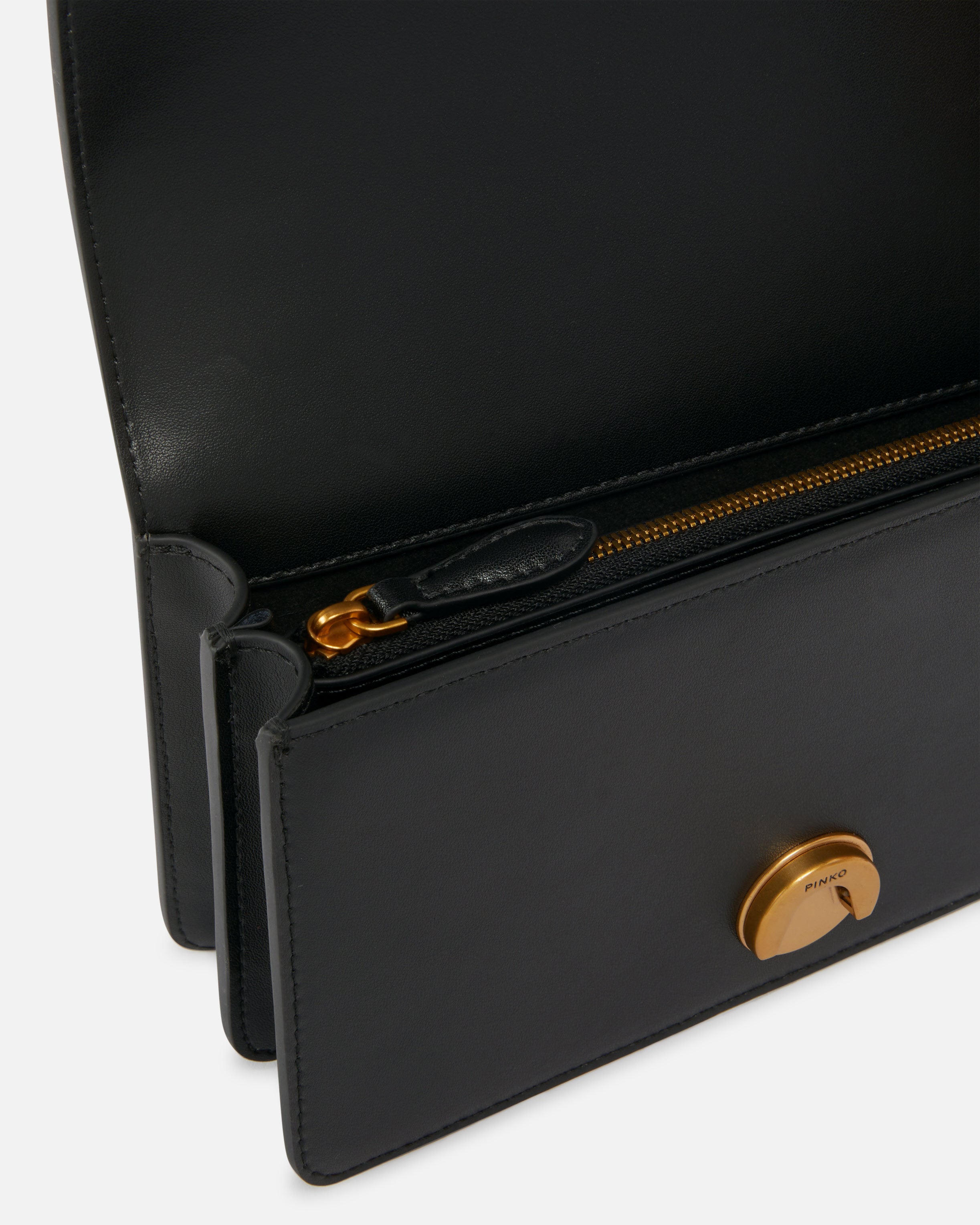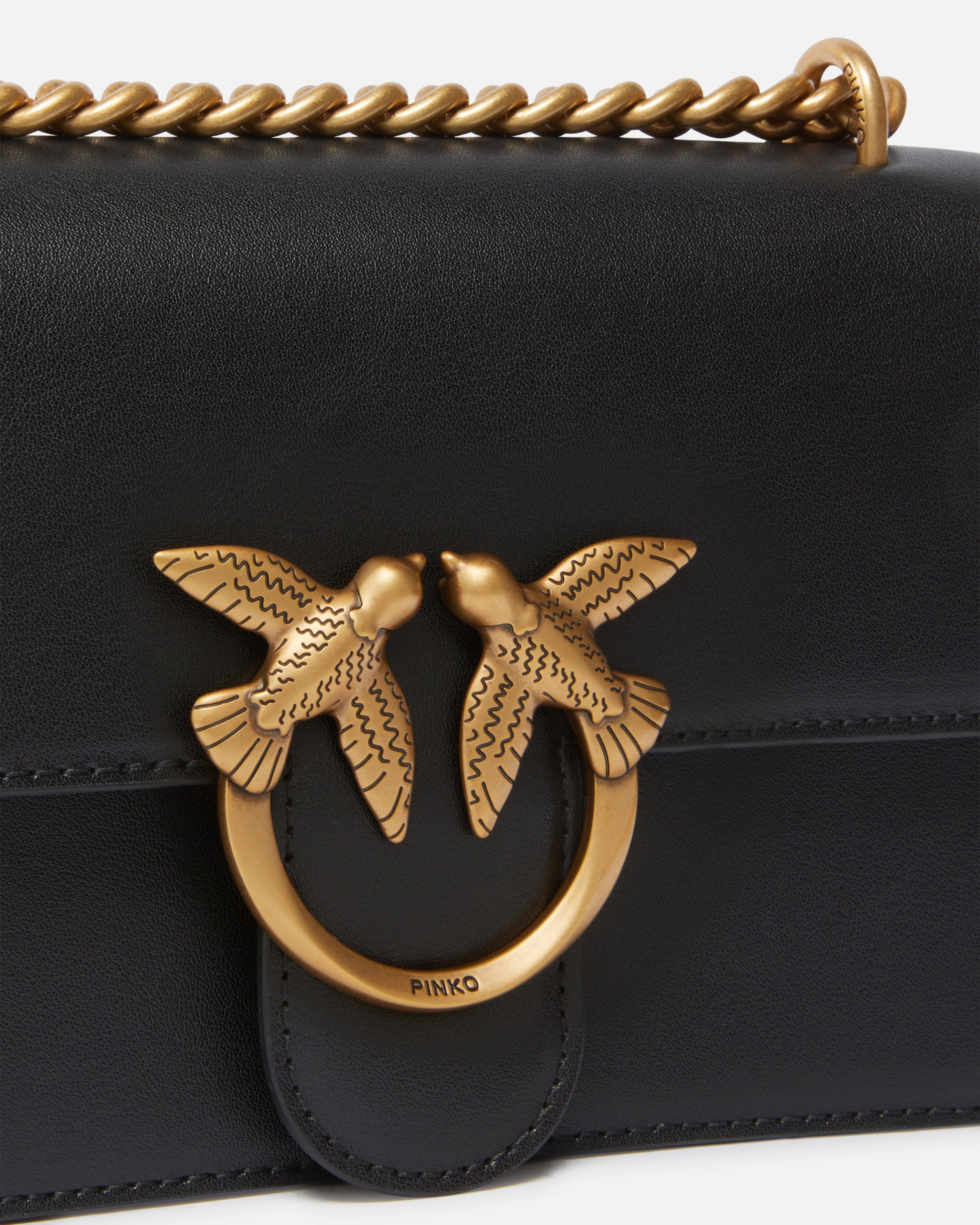 Mini Love Bag One in soft, silky leather. The fastening is embellished with the iconic metal Love Birds Diamond Cut buckle. The accessory boasts a suede microfibre-lined interior, complete with a zipped centre divider pocket and leather slip pocket. The shoulder strap combines the classic round-link chain with a practical, adjustable leather shoulder pad.