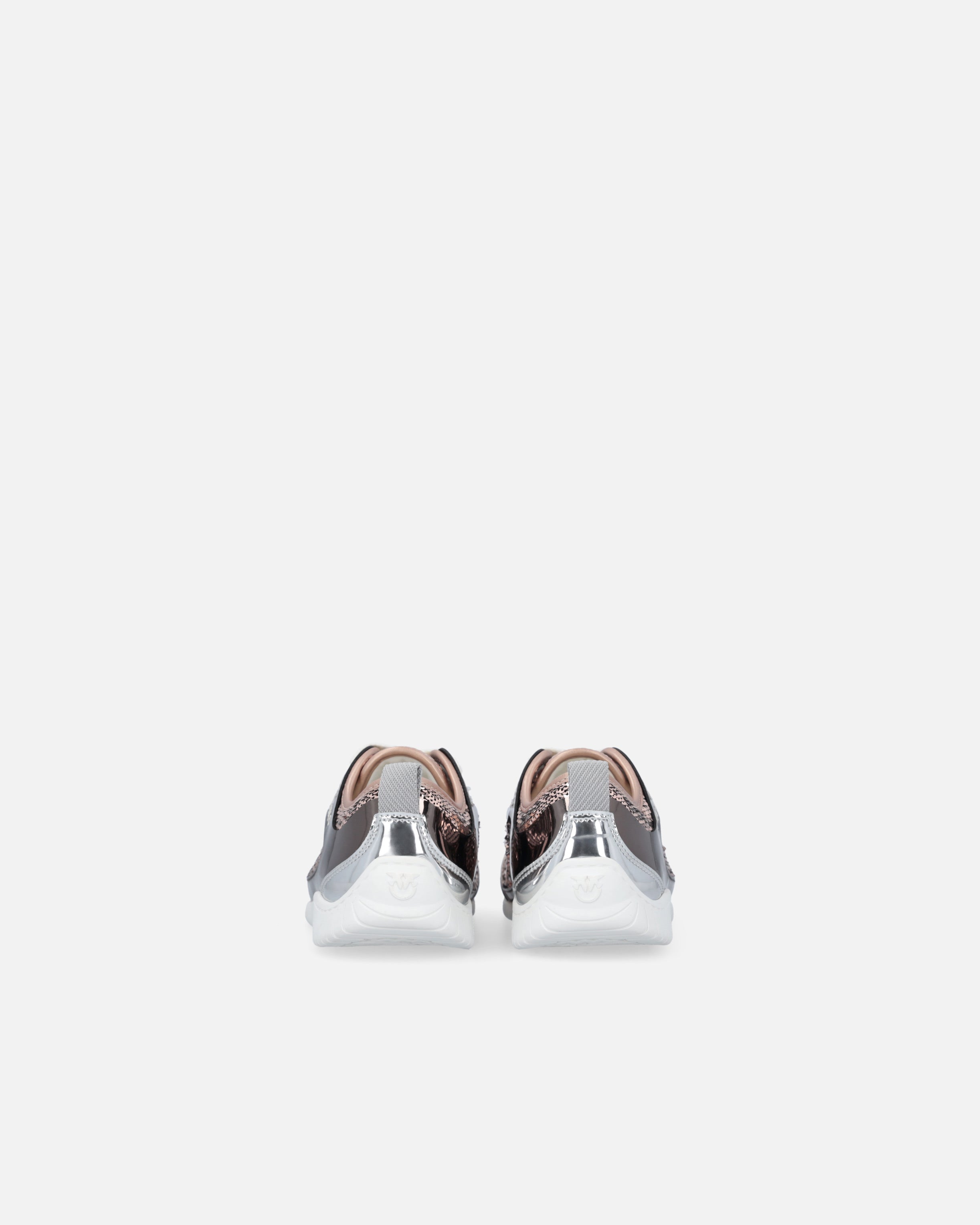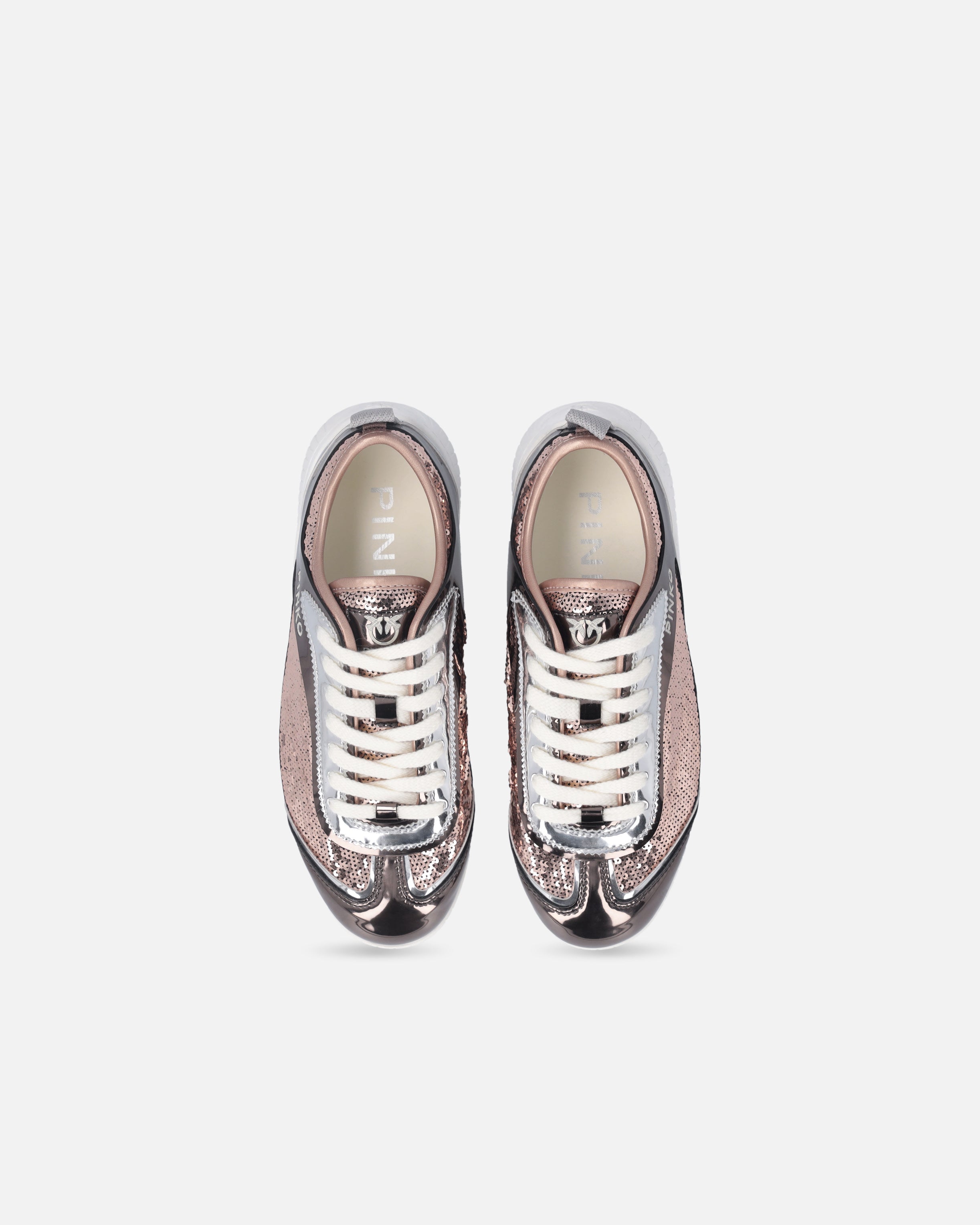 Lace-up sneakers with a 2.5 cm-high rubber sole and fabric pull tab to help put them on. Covered in shiny sequins, the upper is enhanced by the iconic PINKO logo lettering at the side, while the refined metallic inserts add an extra-special touch, making the shoe perfect for those looking seeking the right balance between boldness and elegance. Put some sparkle in every step—even for more casual occasions—with this purely PINKO pair.