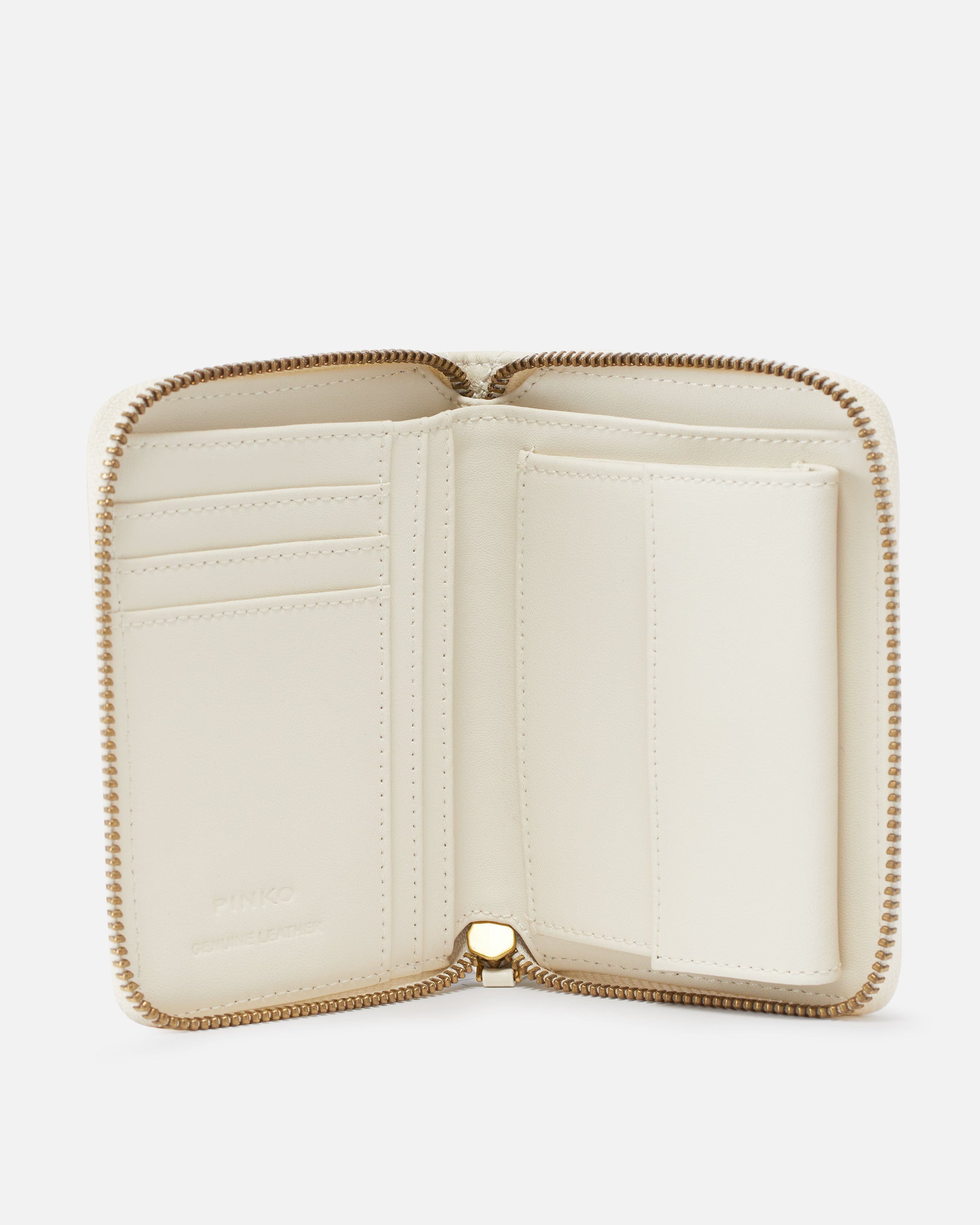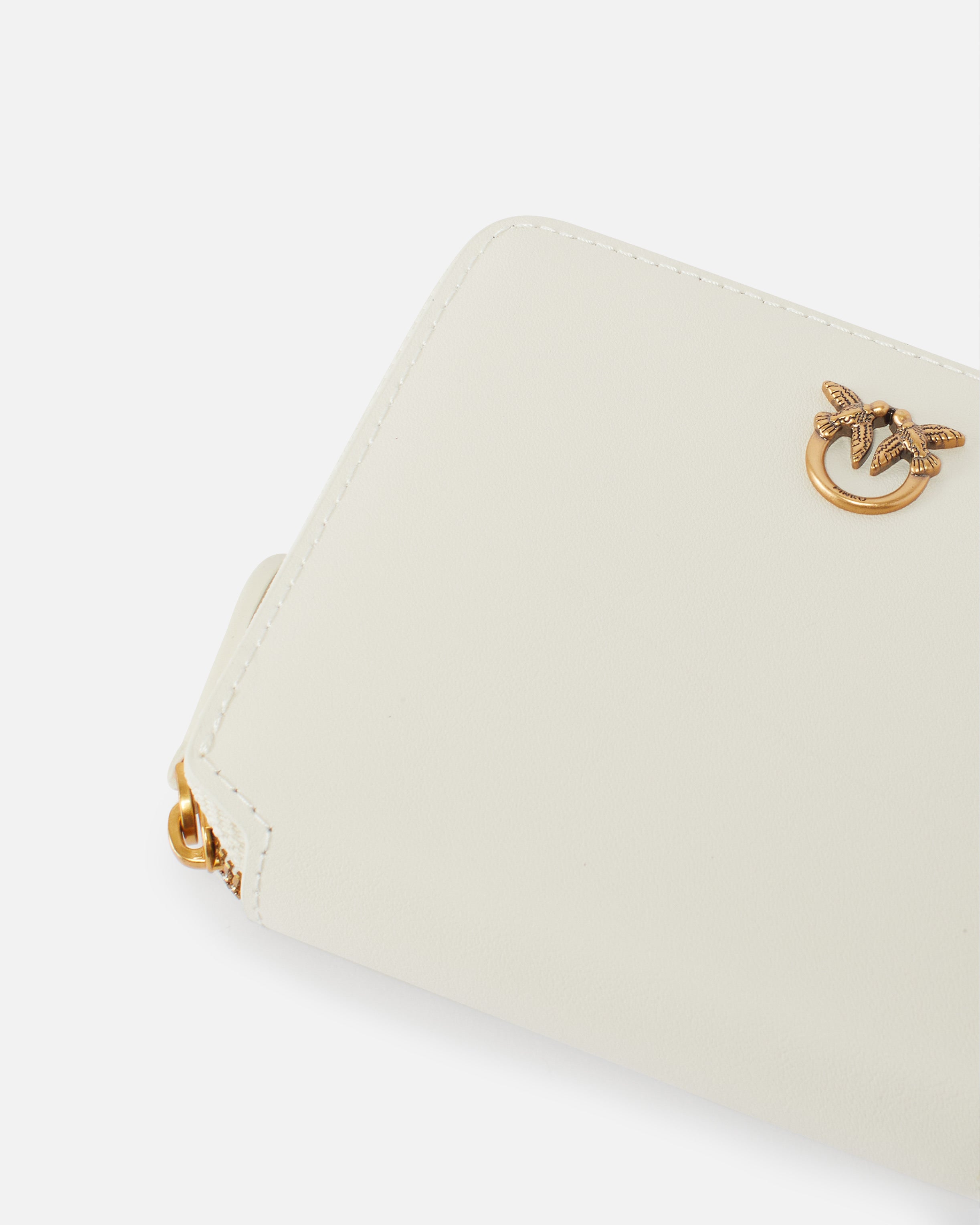 Square-shaped zip-around wallet in soft, silky leather, featuring the Love Birds Diamond Cut plaque on a leather base. Polycotton-lined interior. Zip fastening.