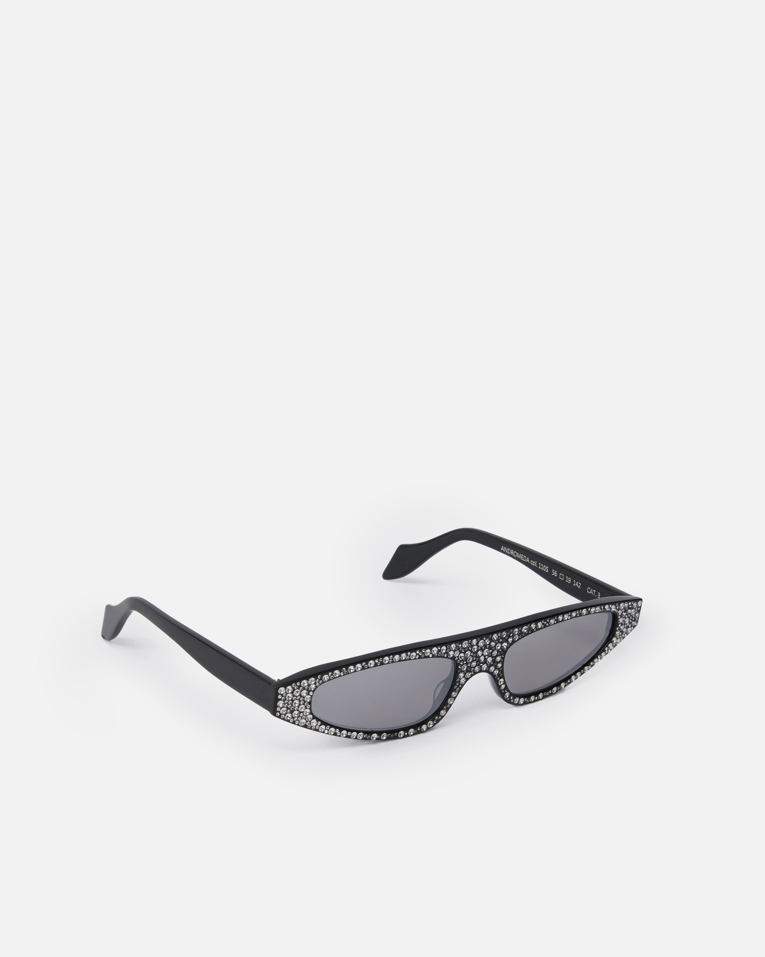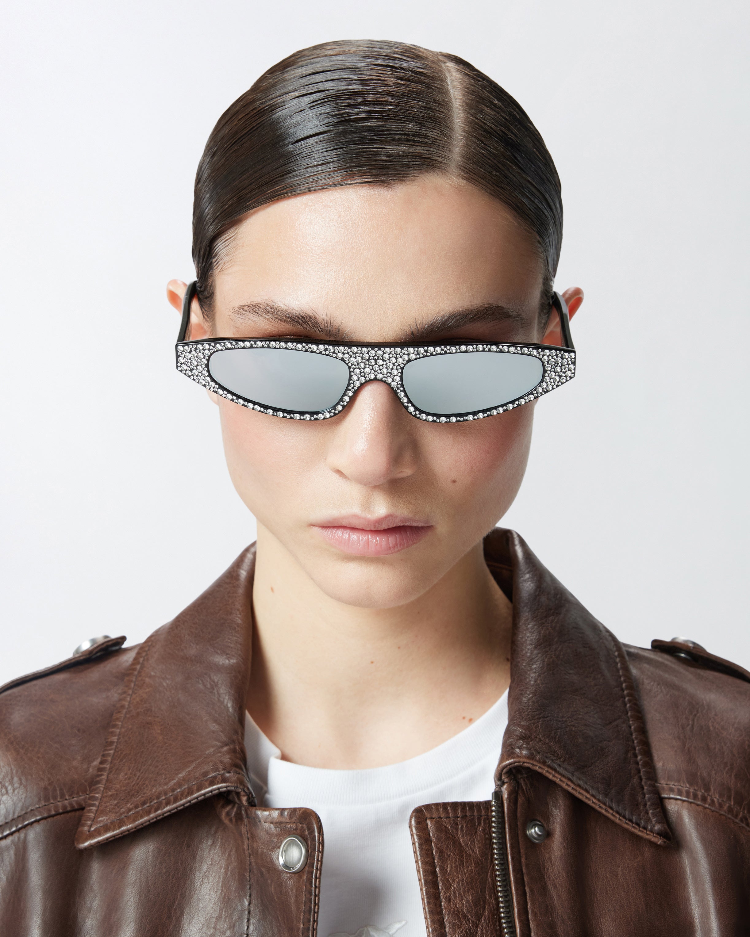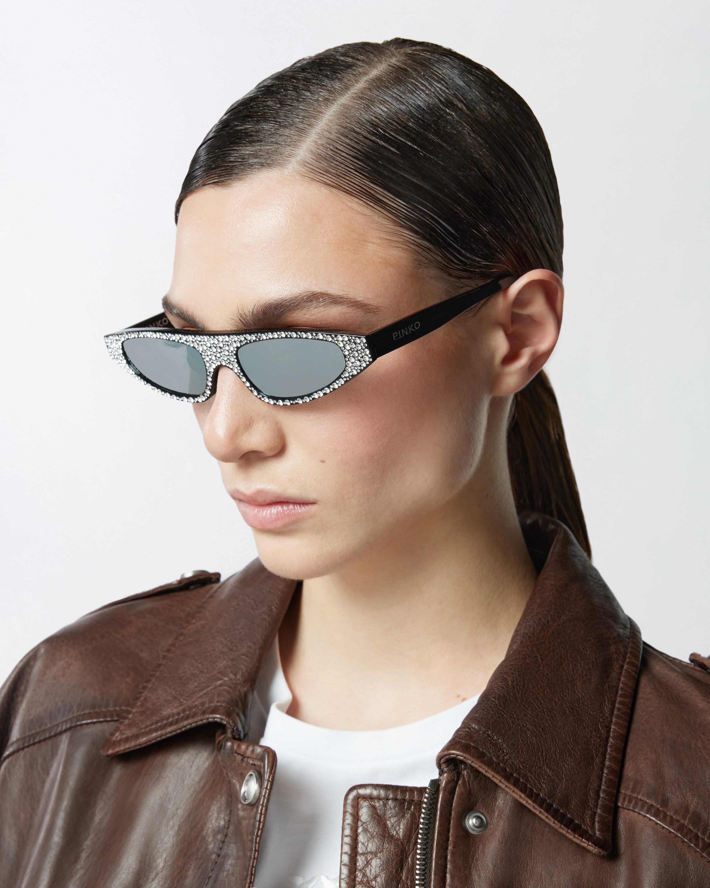 Sunglasses in cellulose acetate with elongated and slightly pointed modern design, left temple customised with the PINKO logo at the side and slightly mirror-effect lenses. These sunglasses feature category-3 lenses made from CR-39, a material that, despite being similar to glass, is stronger and more durable. These provide excellent protection from sunlight and UV rays. This pair is adorned with sparkling Swarovski stones, crafted in part by an Italian company that specialises in these particular processes. From designing the model to creating the finished glasses, this capsule collection is produced entirely in Italy. Even the small parts, such as front hinges, temple cores and screws, are all purchased from Italian companies.