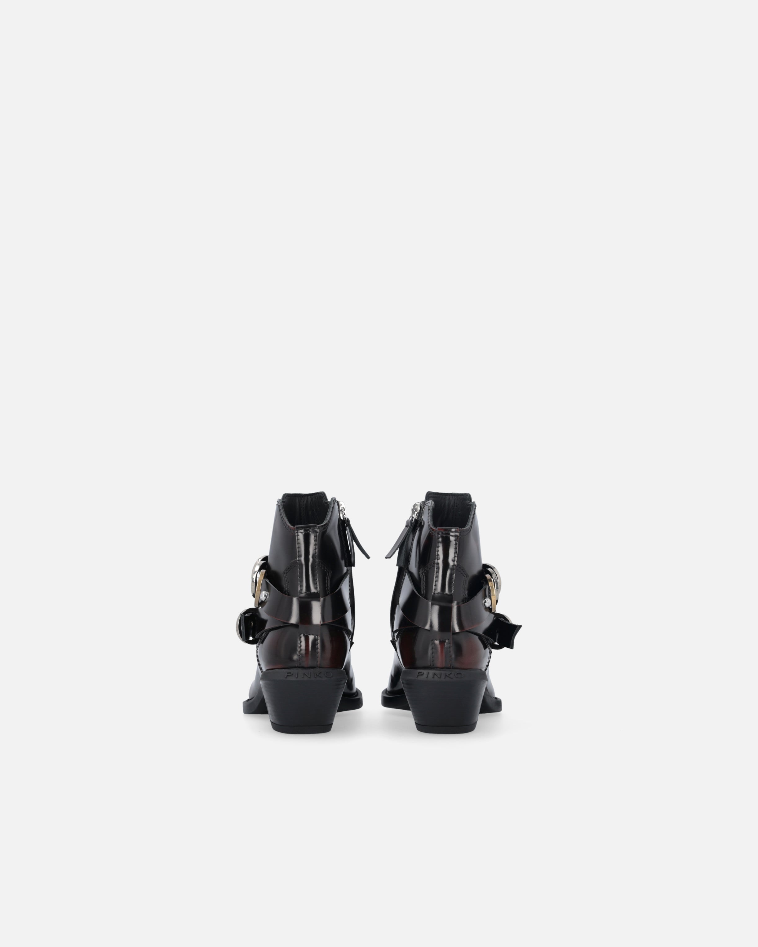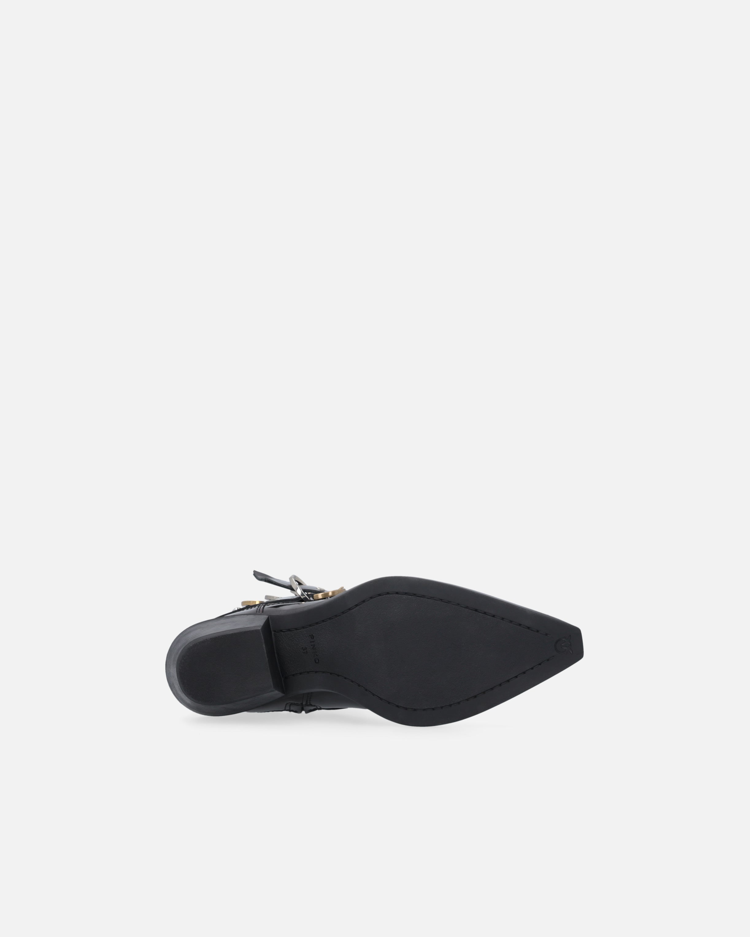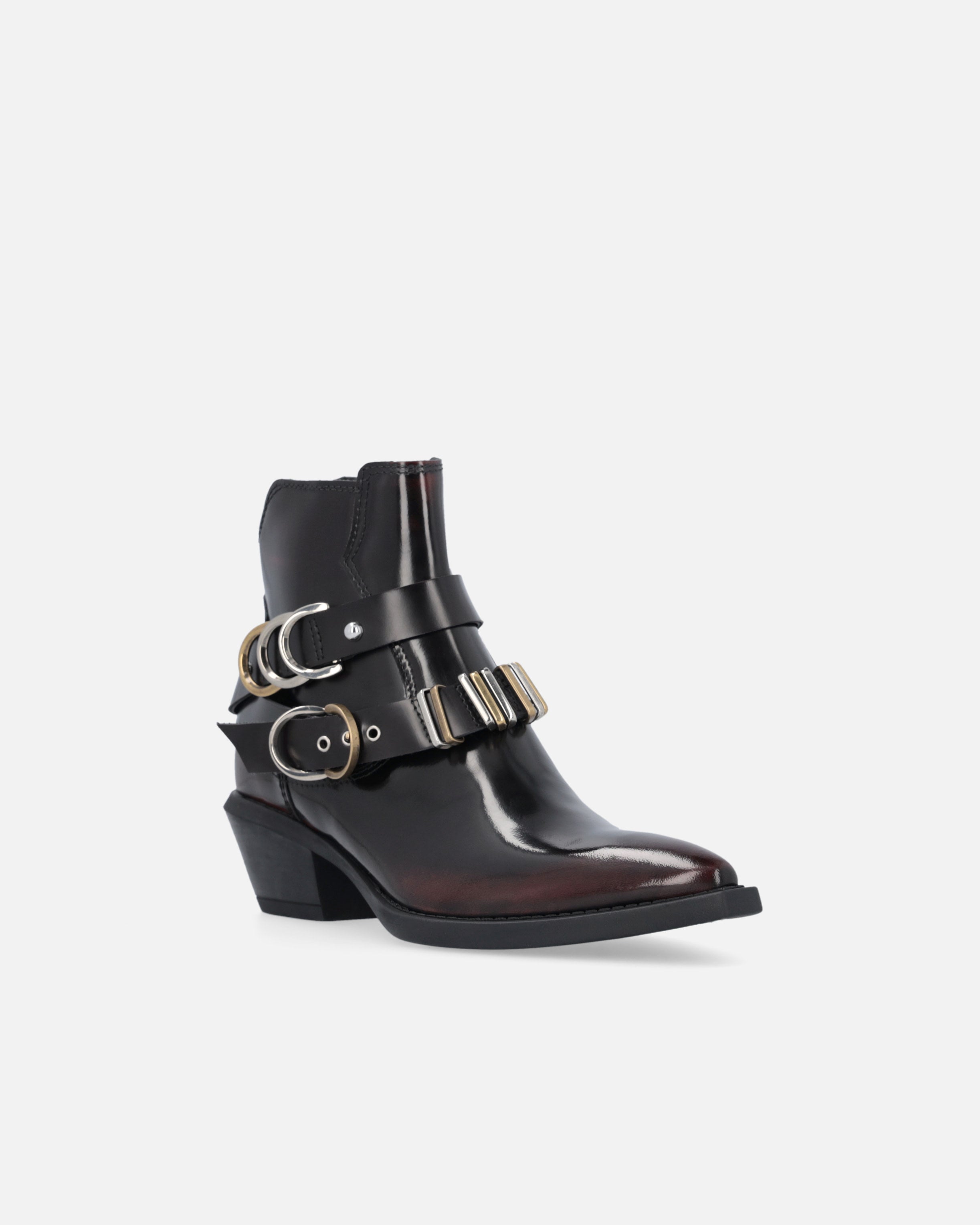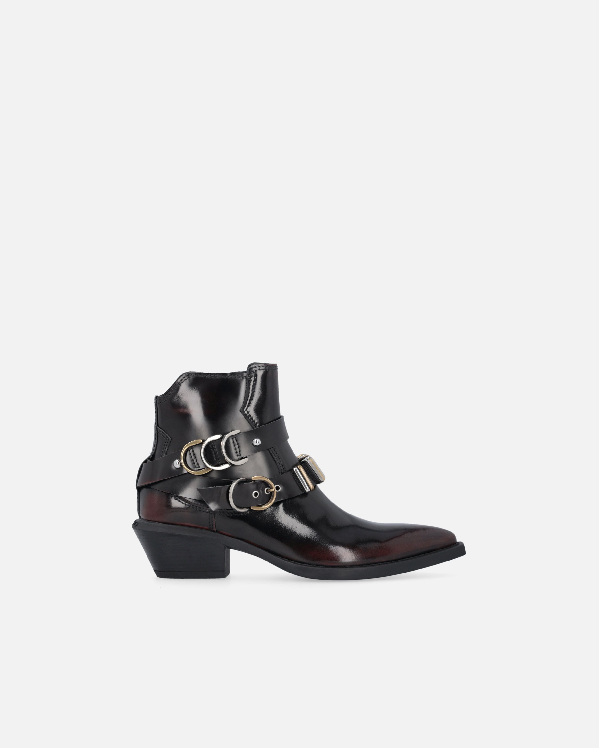 Cowboy ankle boots in fine smooth leather with wide, 5 cm-high heel. This model, equipped with two straps, combines geometric shapes and various plated finishes to perfection, with studs and loops of different sizes skilfully alternated to dynamic effect. The pure rubber sole provides excellent thermal insulation, ensuring maximum comfort and durability. We all know that details are what make the difference: choose this pair to give your casual looks a unique touch.