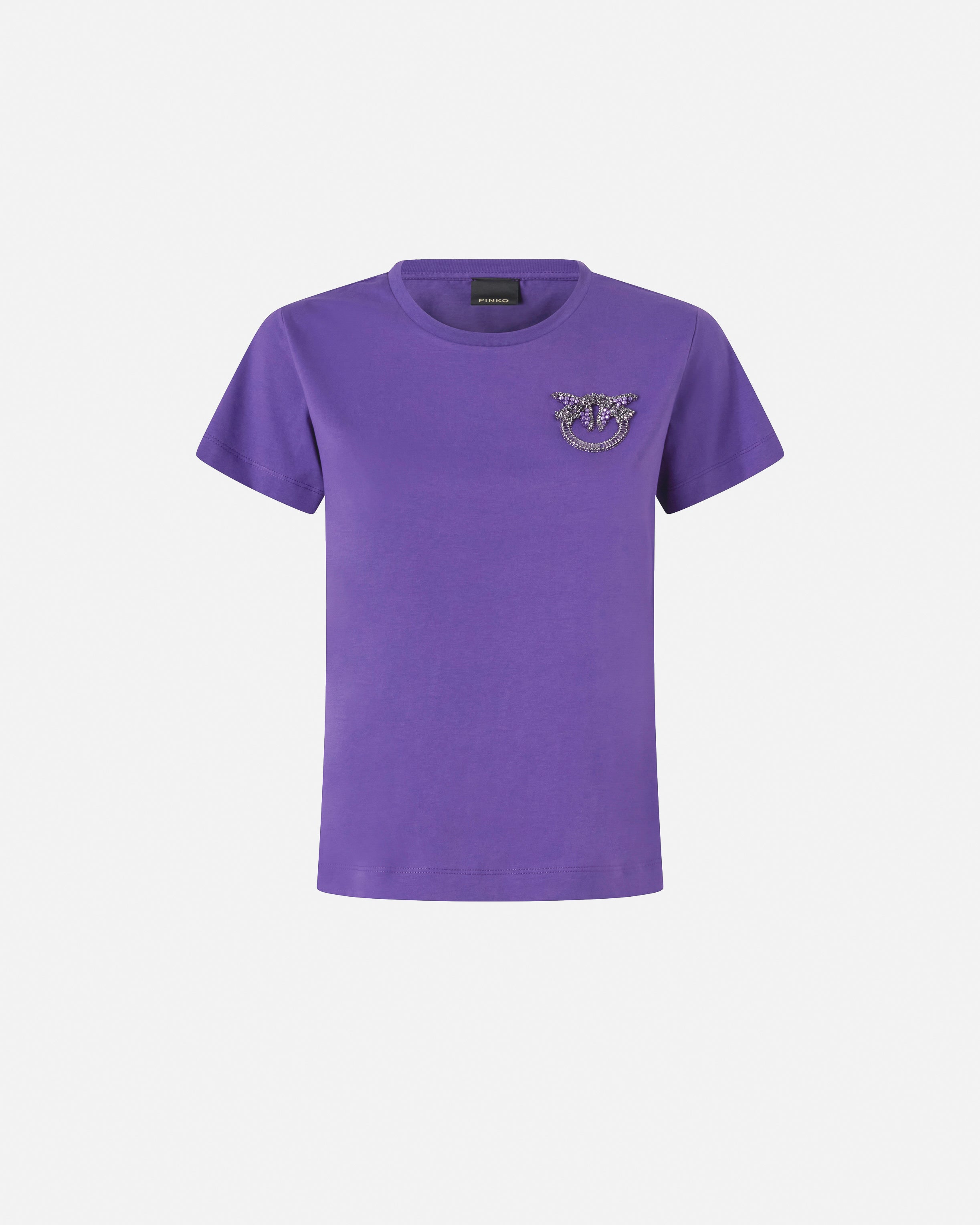 Pure cotton jersey T-shirt with round neck and short sleeves. Crystals and pearls in different colours and shapes add a touch of refined elegance to the Love Birds logo on the front left side and finish off this piece with a fine handcrafted touch. This T-shirt will work seamlessly with your favourite trousers, elevating your look in a simple, elegant and original way.