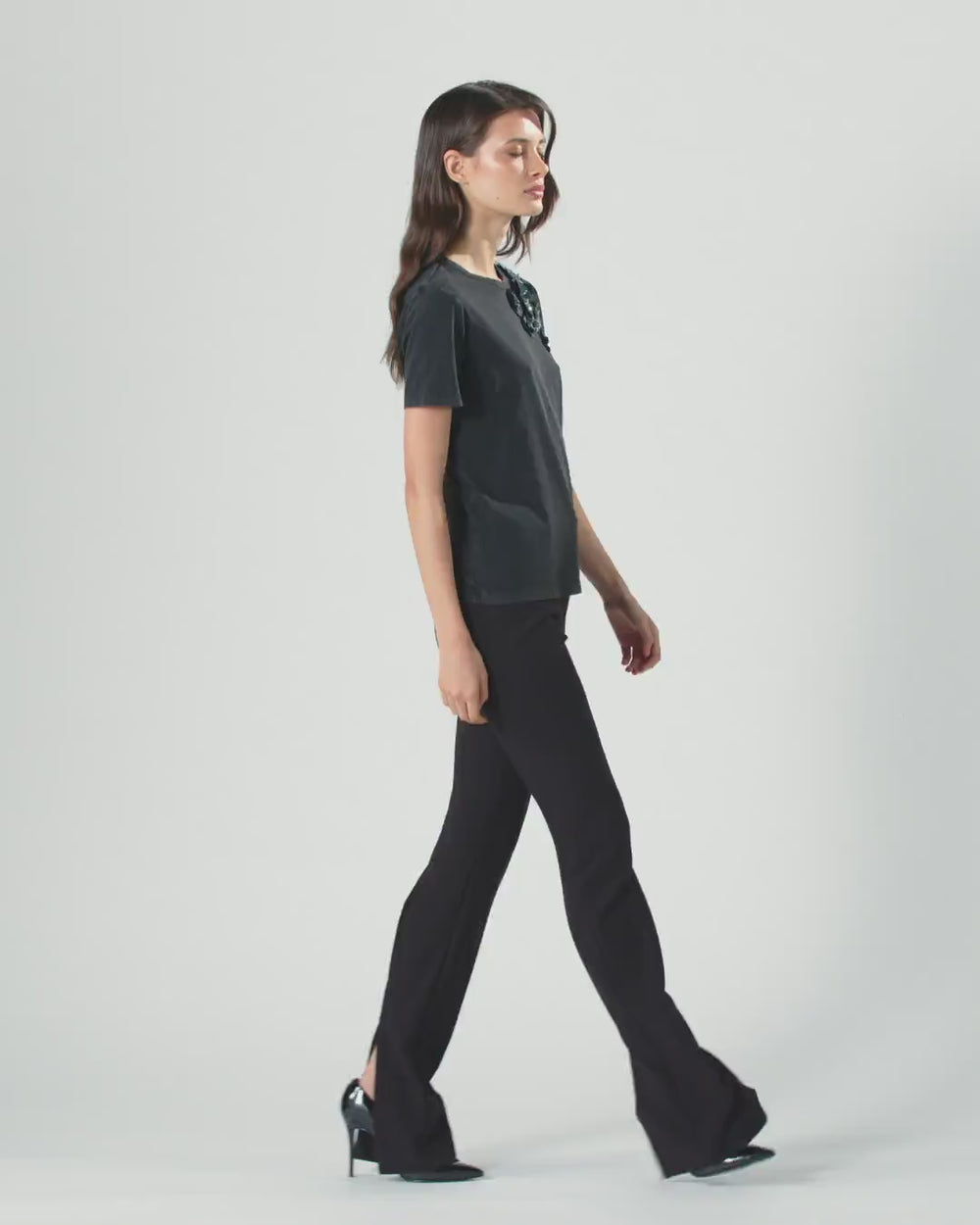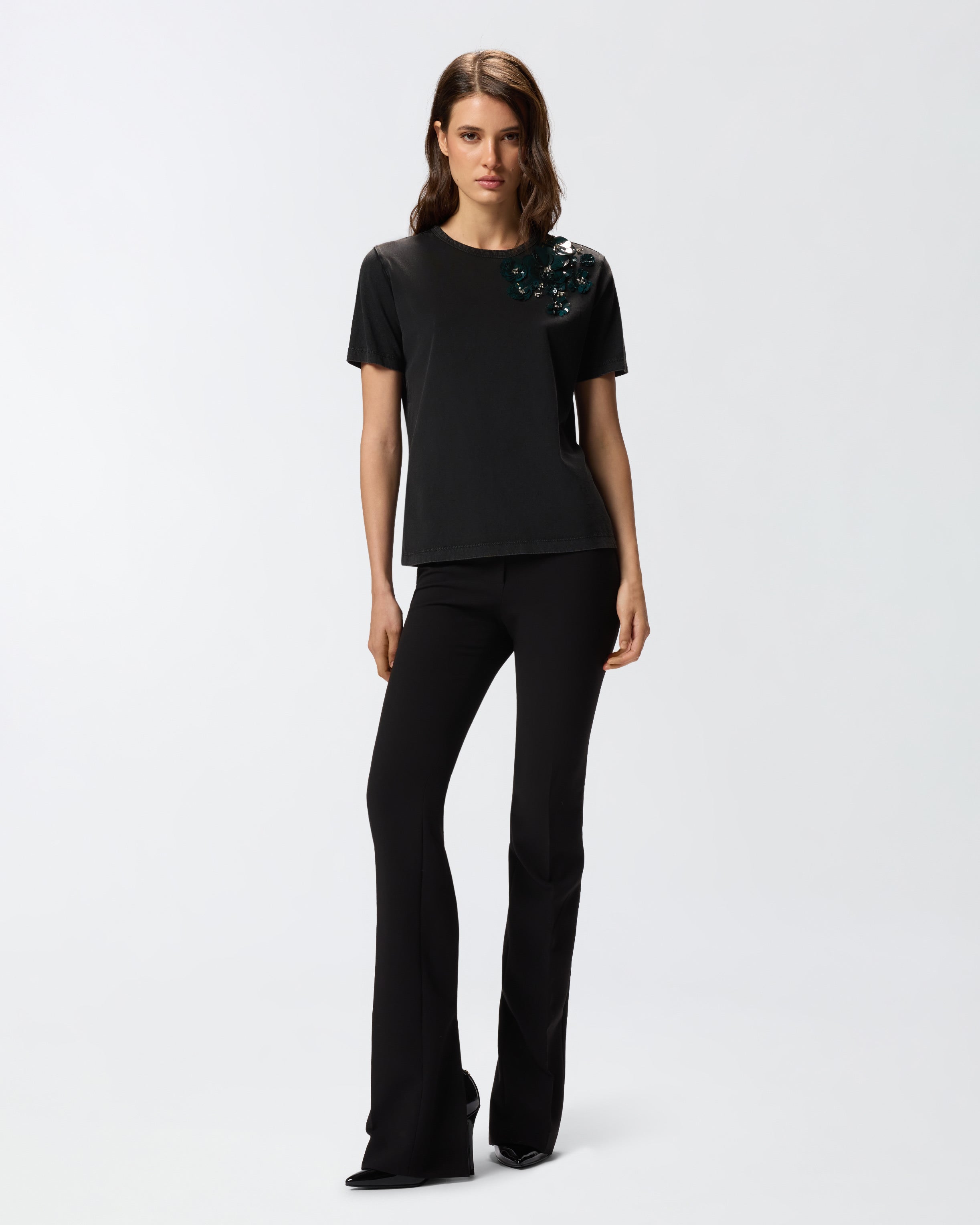 Short-sleeved, relaxed-fit crew-neck T-shirt made from 100% cotton jersey. This item is embellished with small crystals and patent-effect sequins of various sizes, embroidered by hand and arranged to form jewel flowers on the shoulder. Team this item with jeans from your wardrobe: all it takes is one detail to make even the most casual outfits shine.