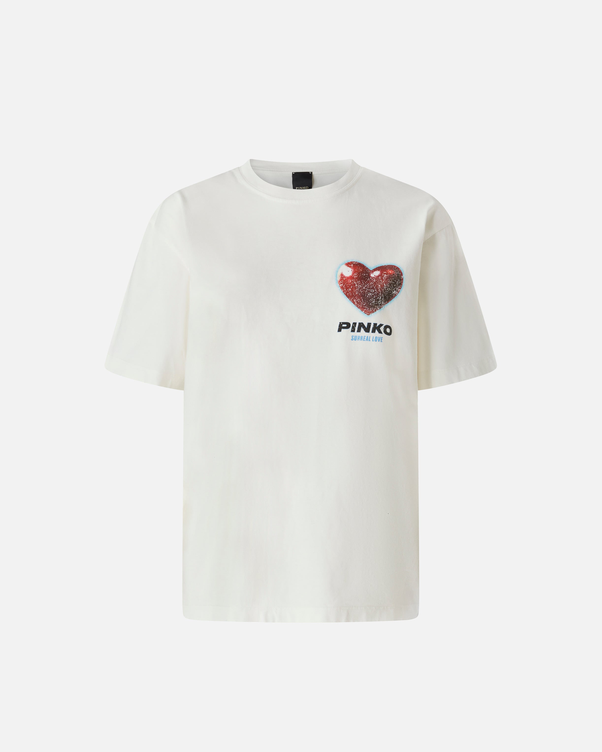 Cotton jersey crew-neck T-shirt with half sleeves. This piece features a scratch-effect print, which comes in a mini-version on the chest in the form of a small heart and PINKO lettering logo, and in a maxi-version on the back, in the form of a heart enveloped by a snake. This T-shirt will work seamlessly with your favourite trousers, elevating your look in a simple, elegant and original way.