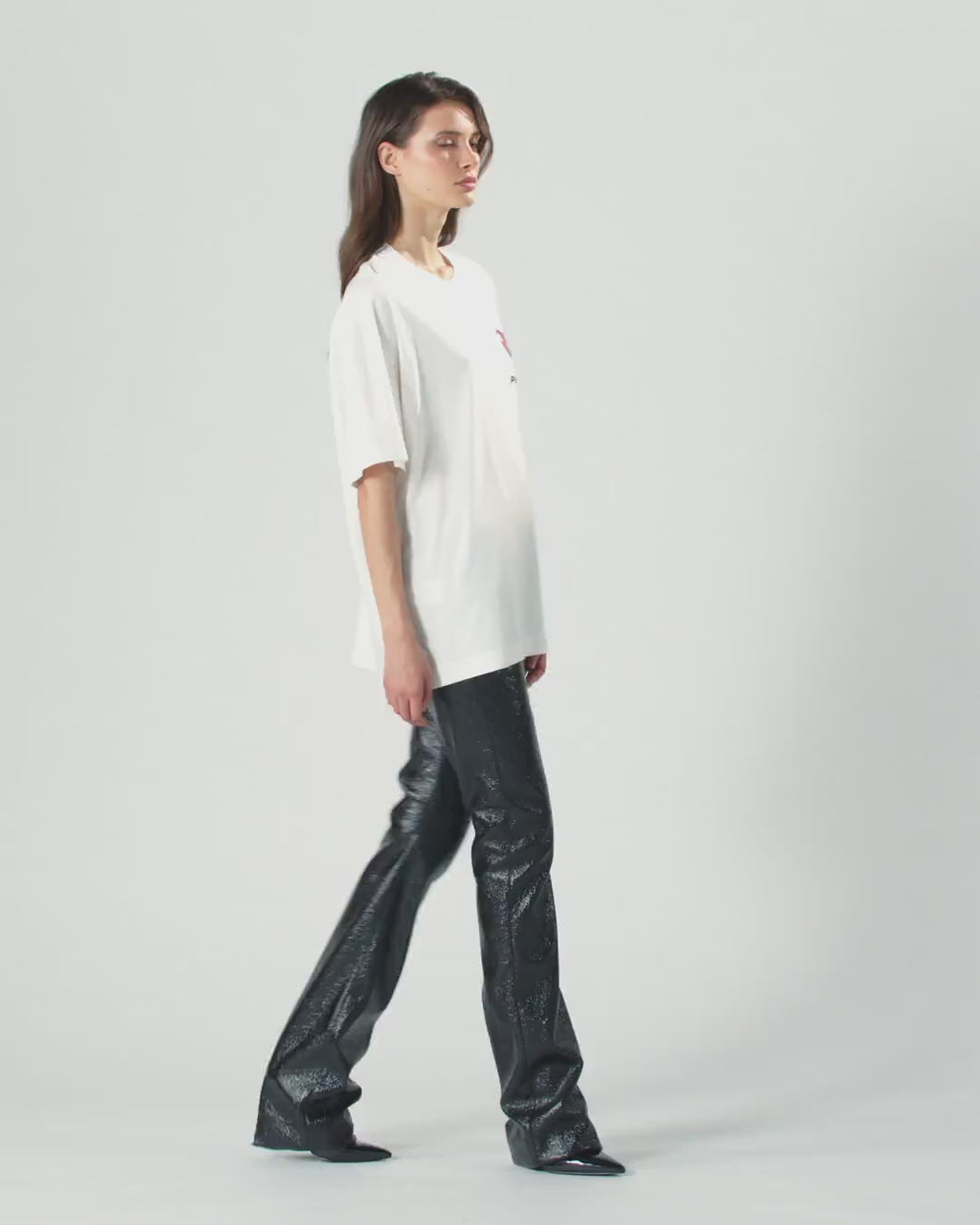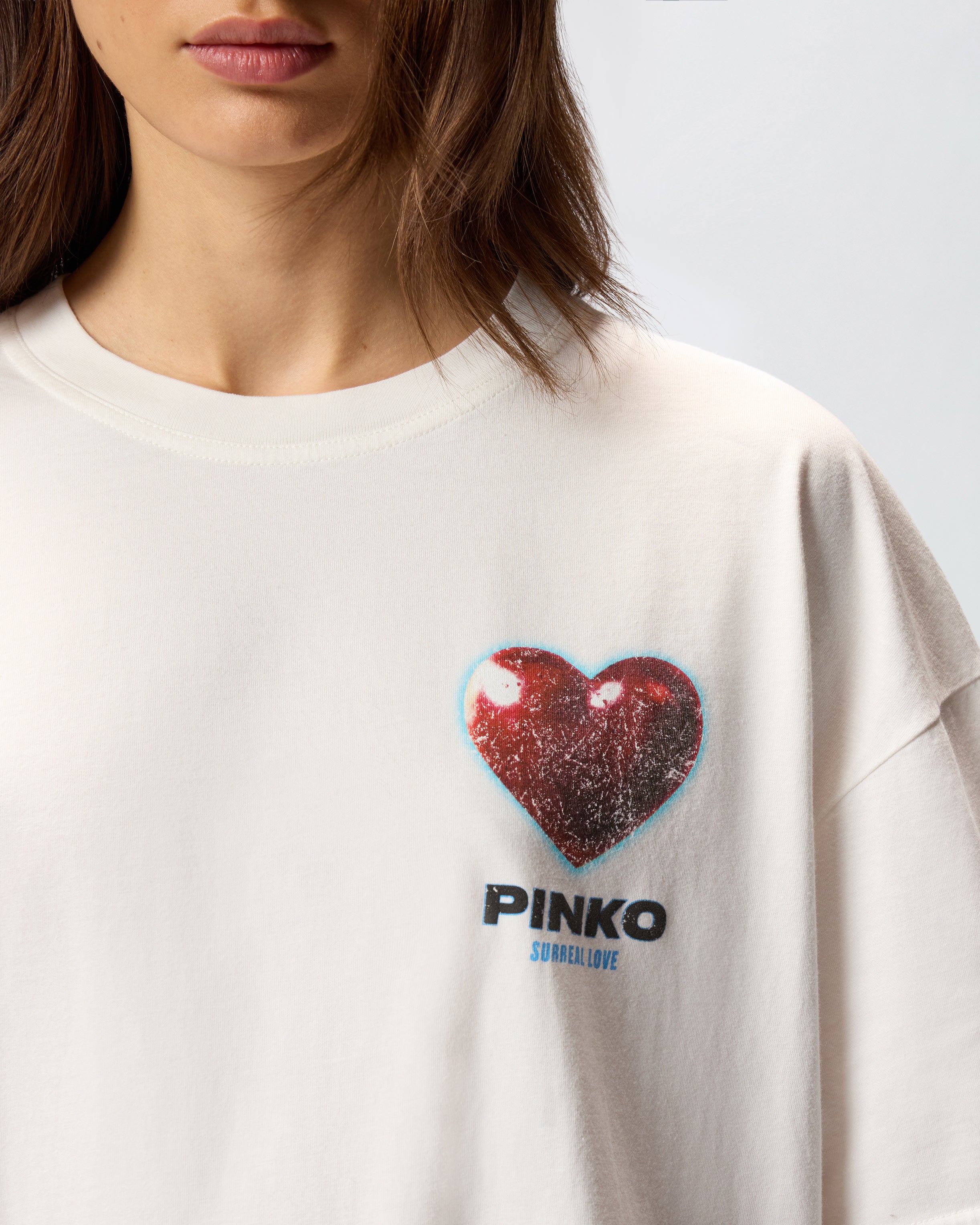 Cotton jersey crew-neck T-shirt with half sleeves. This piece features a scratch-effect print, which comes in a mini-version on the chest in the form of a small heart and PINKO lettering logo, and in a maxi-version on the back, in the form of a heart enveloped by a snake. This T-shirt will work seamlessly with your favourite trousers, elevating your look in a simple, elegant and original way.