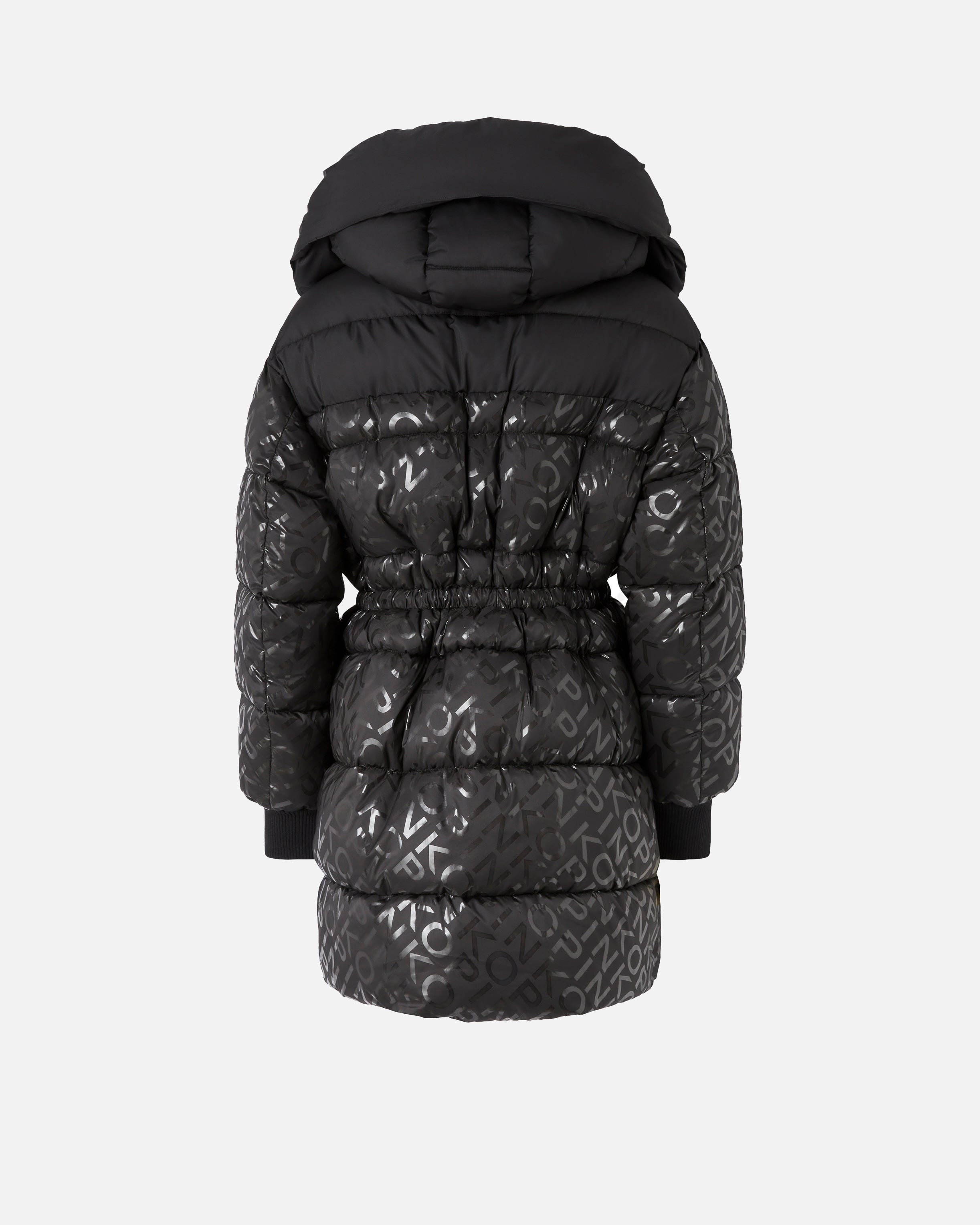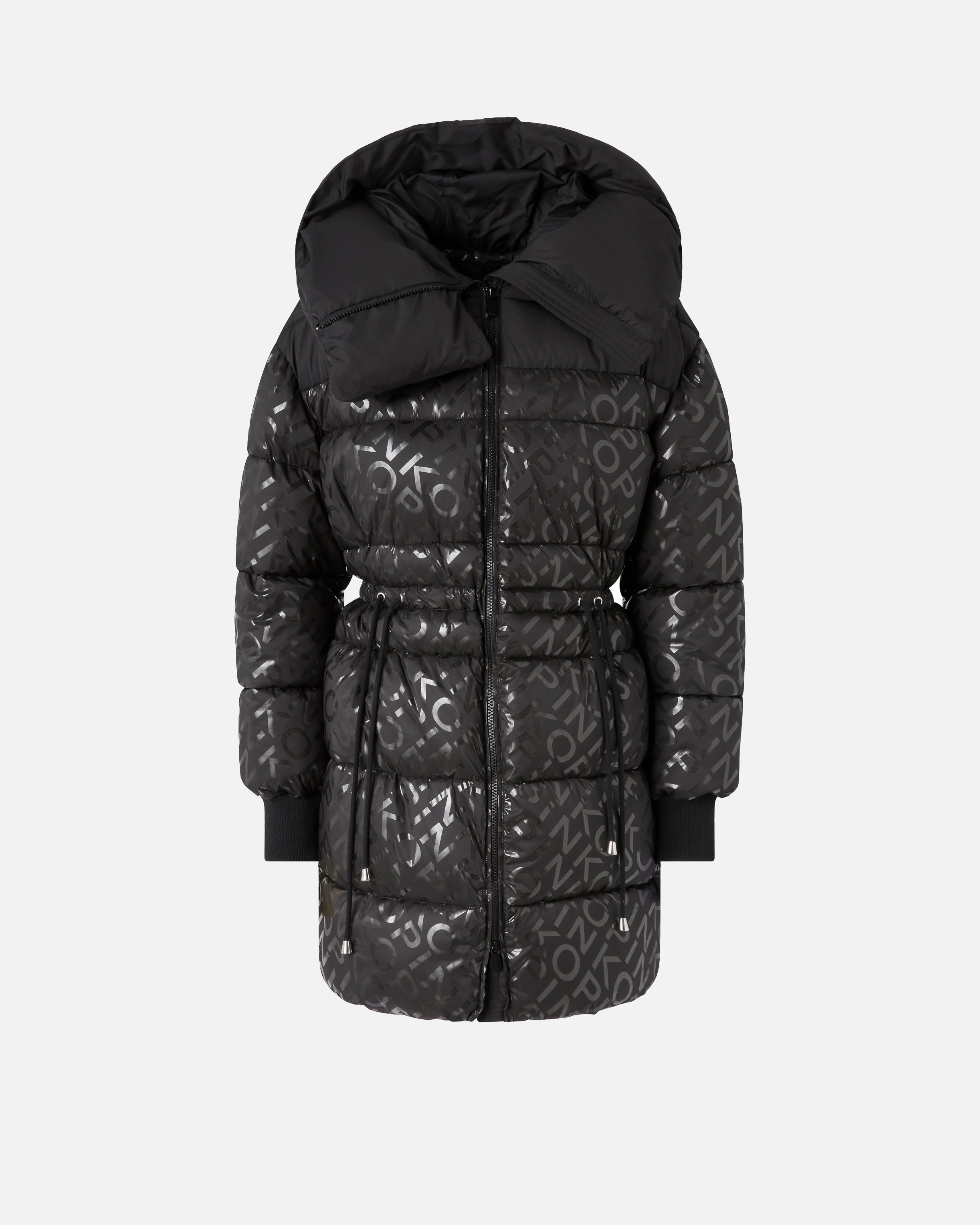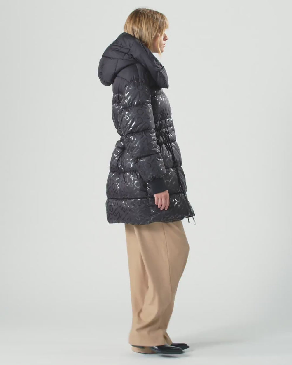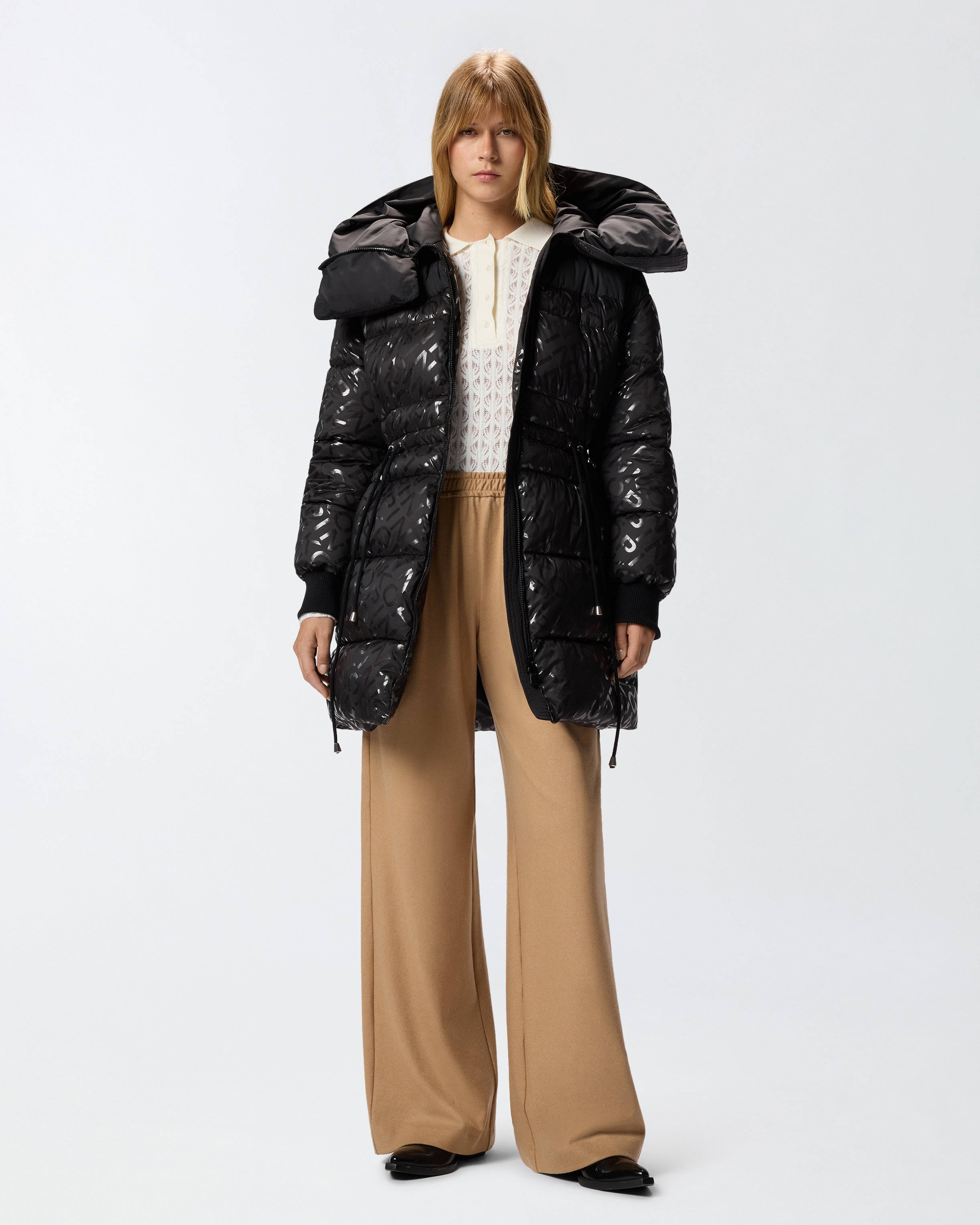 Long padded down jacket, made from technical canvas with horizontal quilting and customised with the all-over PINKO lettering logo print with a distinctive glossy effect. The style features a wide, cosy hood and rib-knit cuffs. A comfortable trekking-inspired drawstring on the waist allows you to adjust the fit. Two-way zip fastening on the front. This outerwear is ideal for wearing on cooler early-season days in the open air with maximum comfort without sacrificing a touch of style.