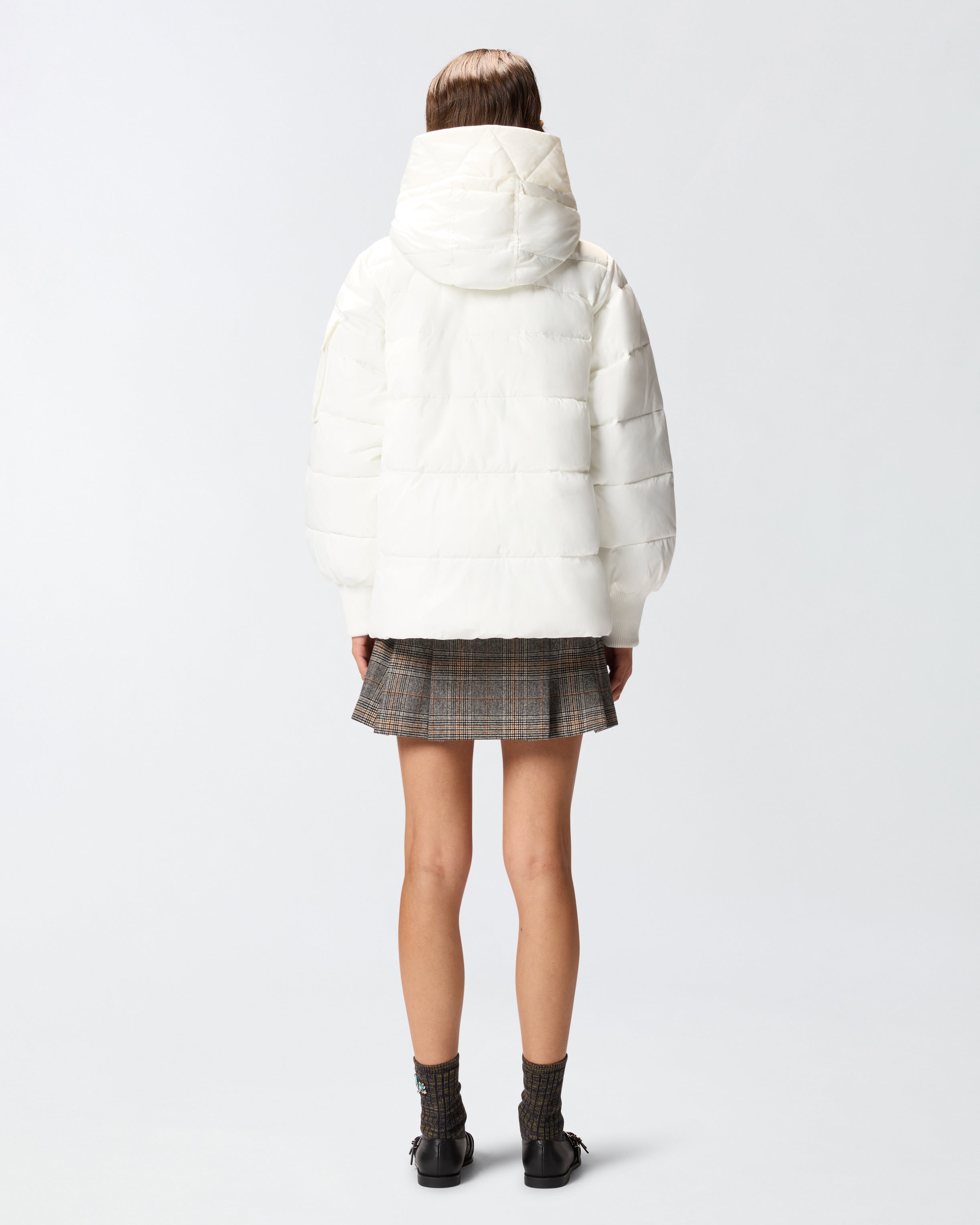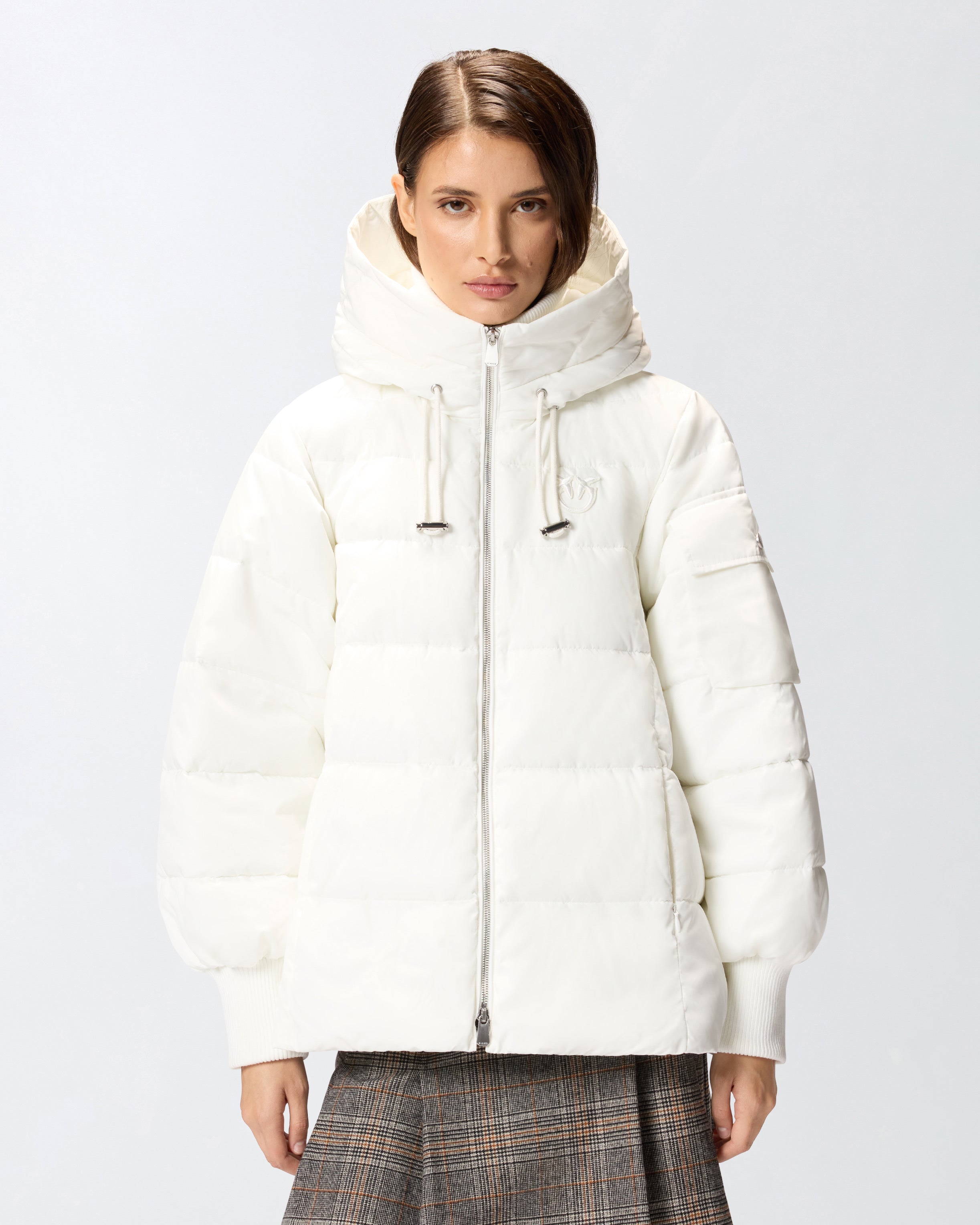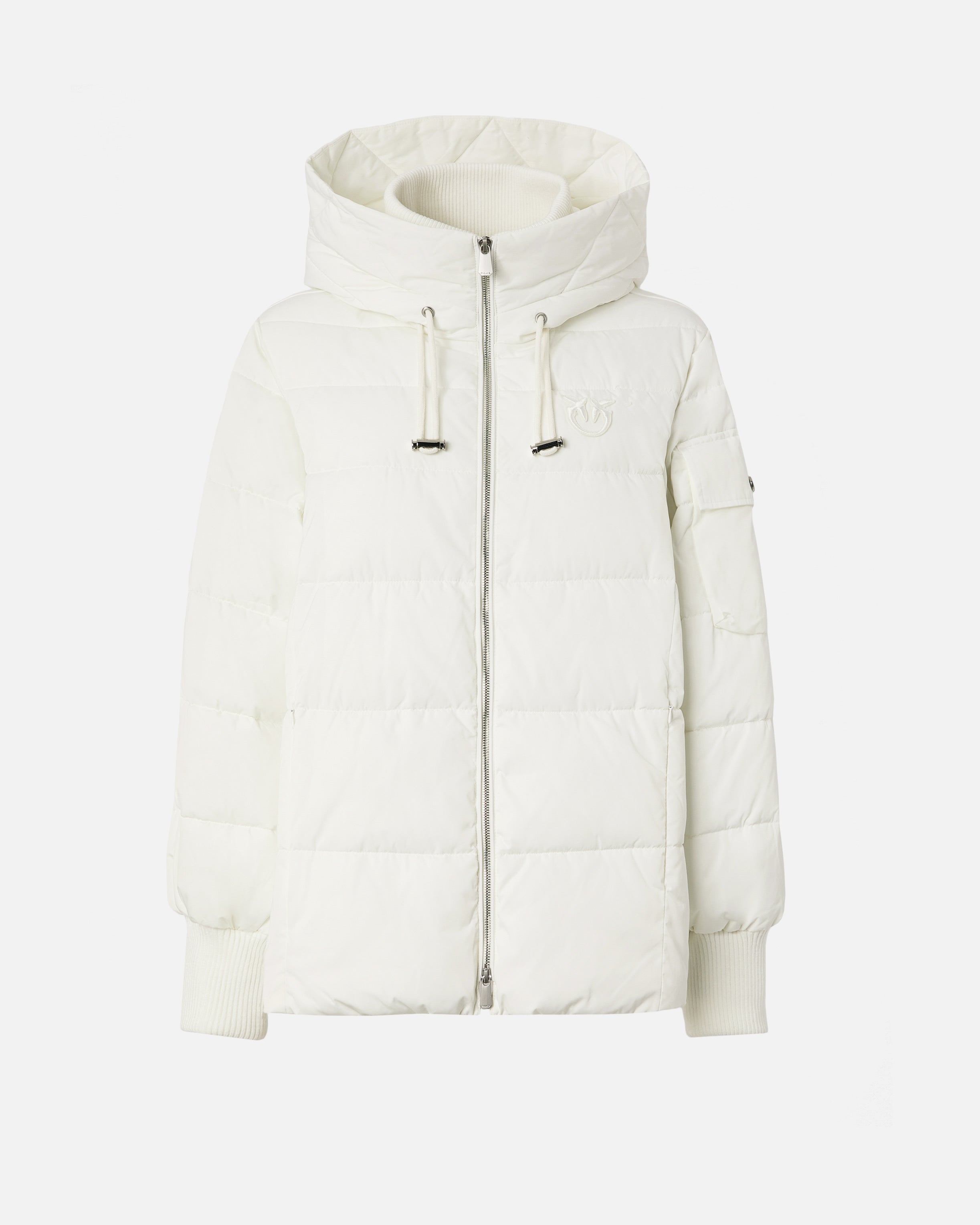 Short, padded and slightly bell-shaped down jacket in technical canvas. The style stands out for its sportier look, provided by the matte finish of the fabric, and for its functional elements, such as the pockets with invisible zip, the rib knit on the high collar and cuffs, and the large adjustable hood with a trekking-inspired drawstring equipped with a peak to protect you from the rain. The patch with rubber-effect Love Birds logo on the front left side customises this piece of outerwear in pure PINKO style. Two-way metal zip fastening on the front. Lined model.