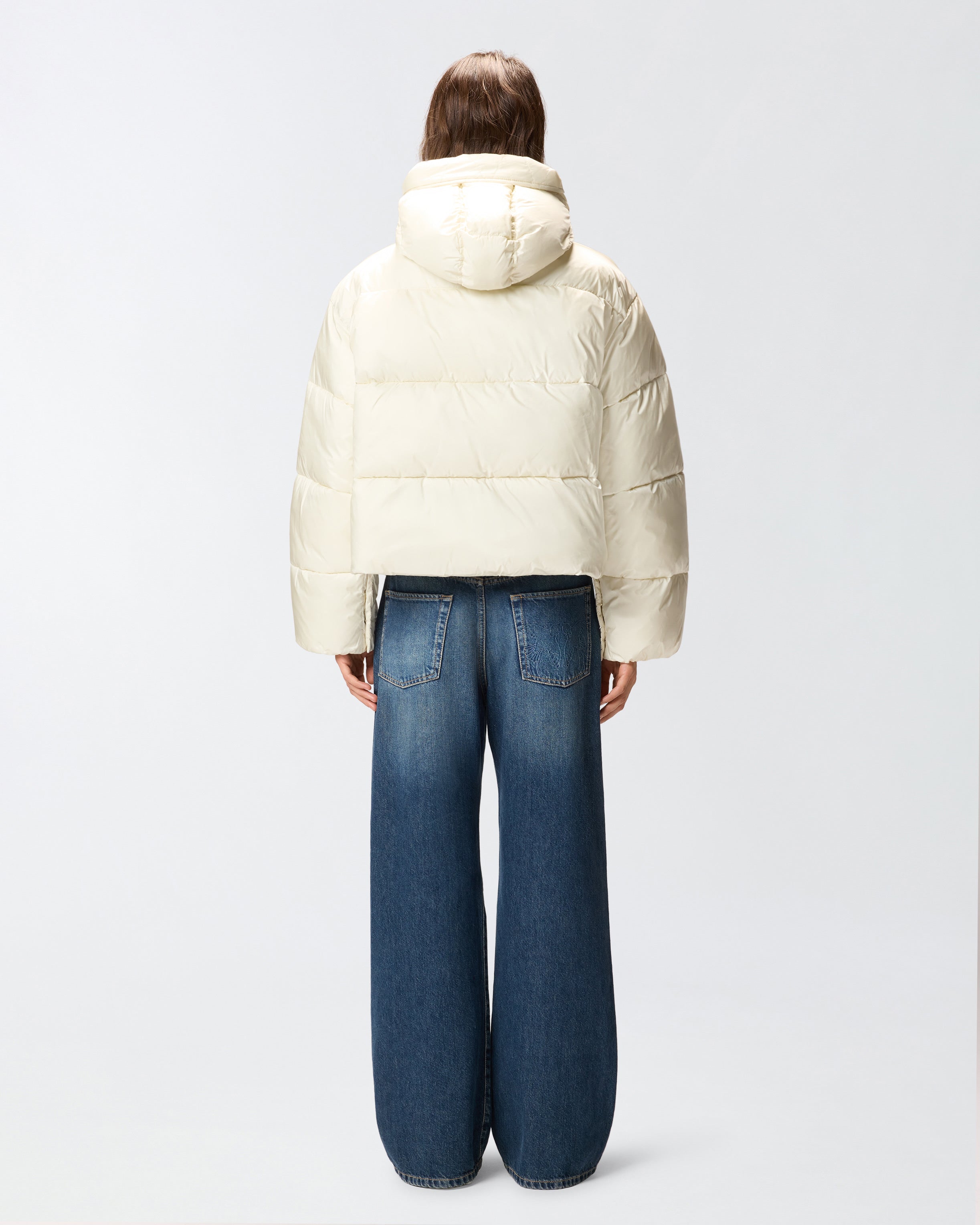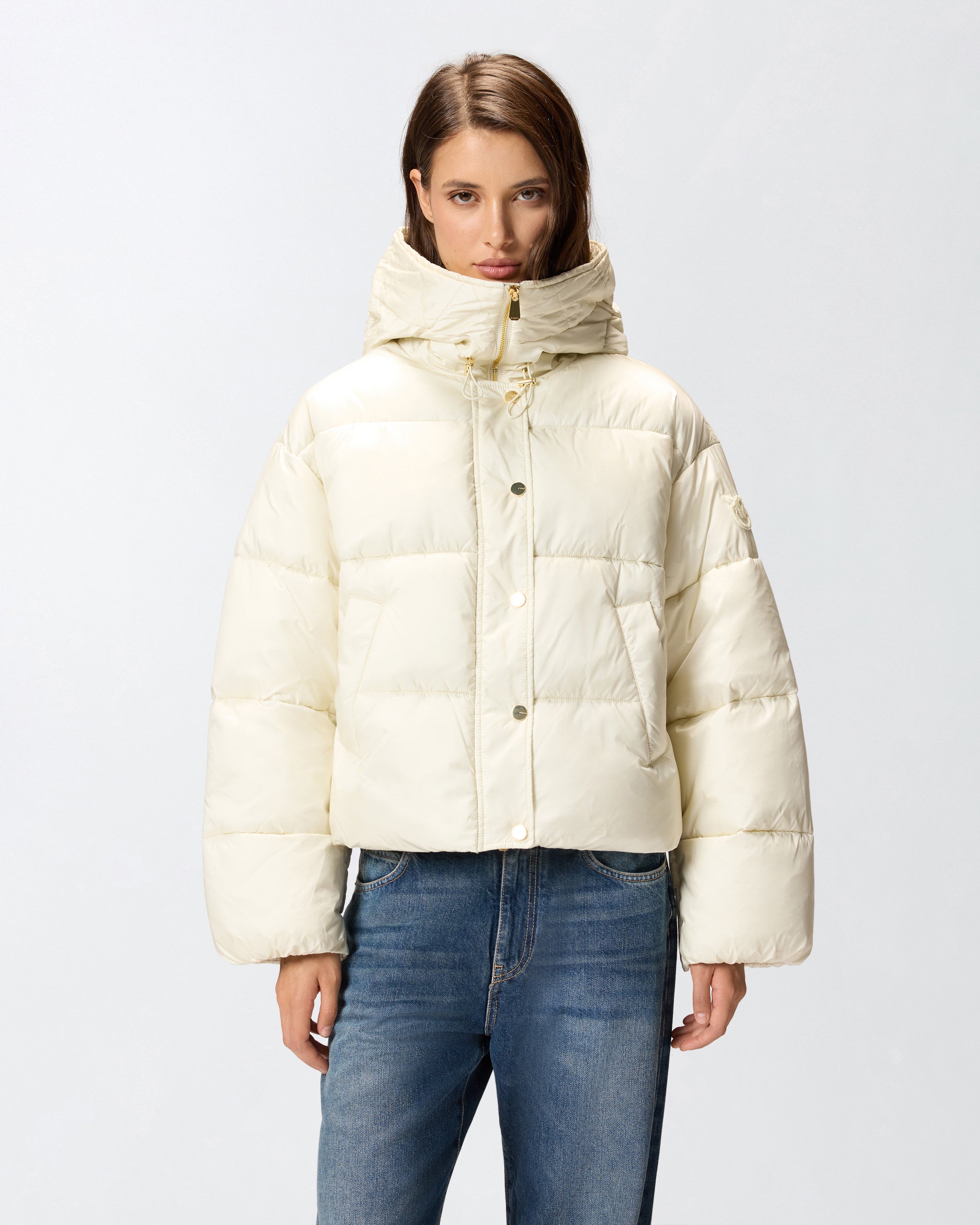 Down jacket in padded technical fabric with special semi-glossy finish. The style features a large cosy hood with an adjustable drawstring and comfortable vertical welt pockets. Metal press-stud fastening. The cropped cut of the puffer jacket makes it the perfect everyday outerwear to tackle the first cold days of the season.
