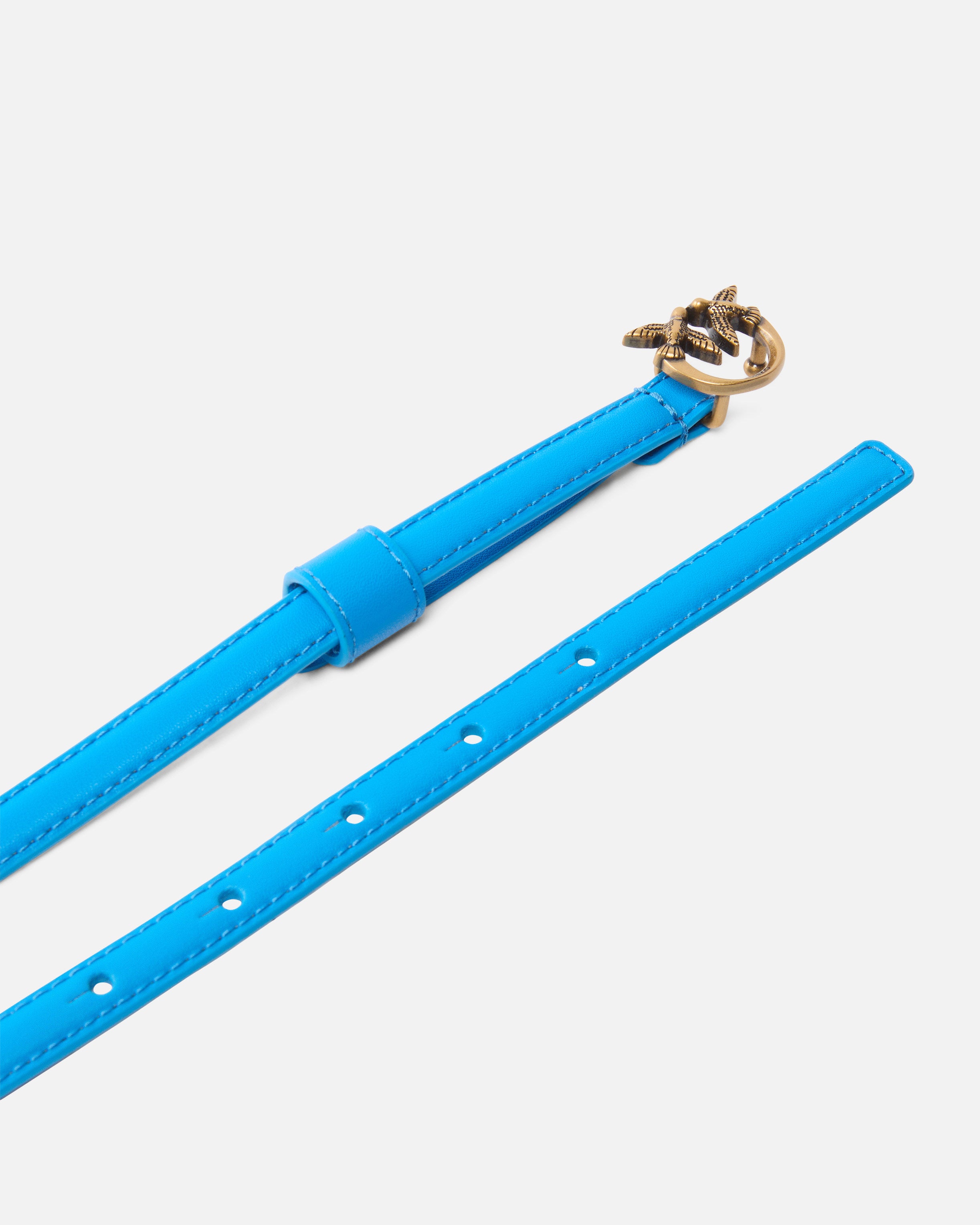 Thin leather belt with mini Love Birds Diamond Cut buckle in antique gold- or old silver-electroplated metal.