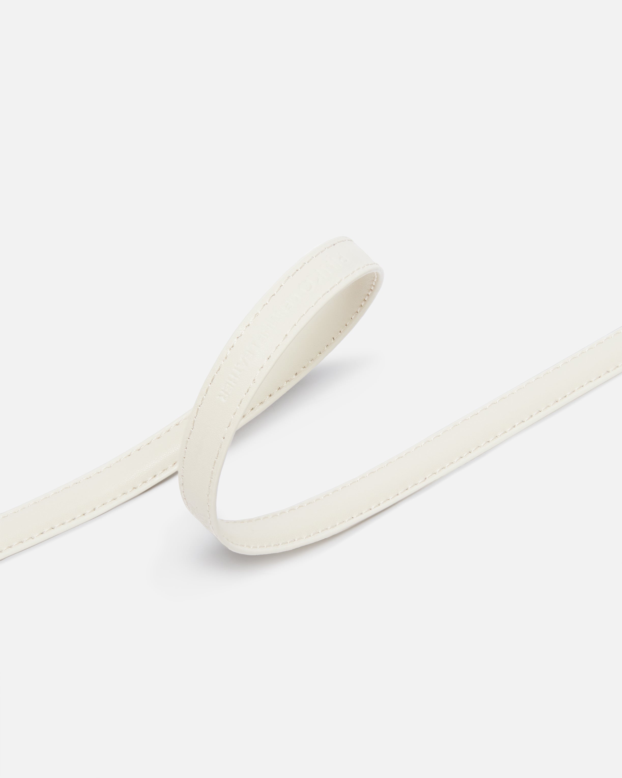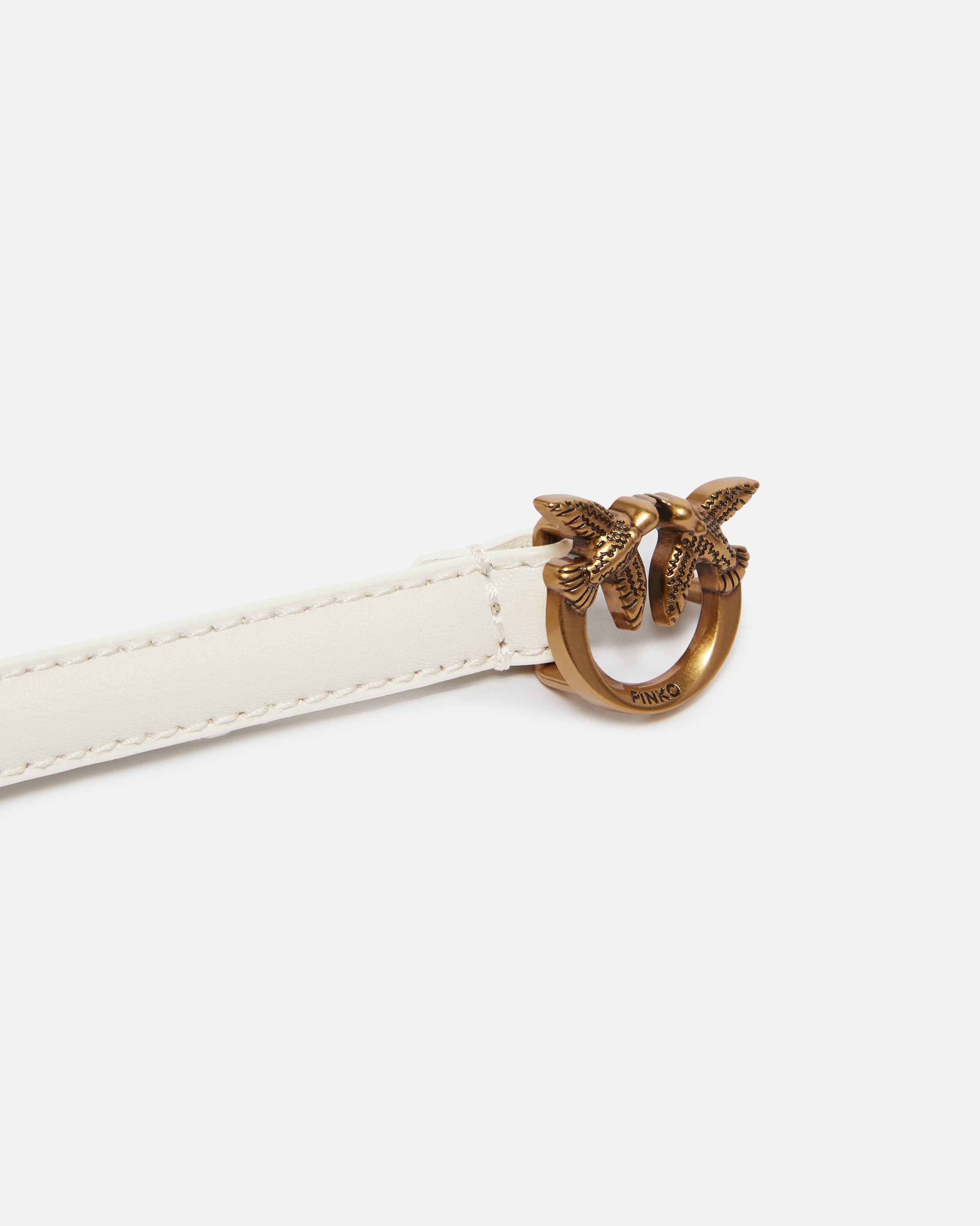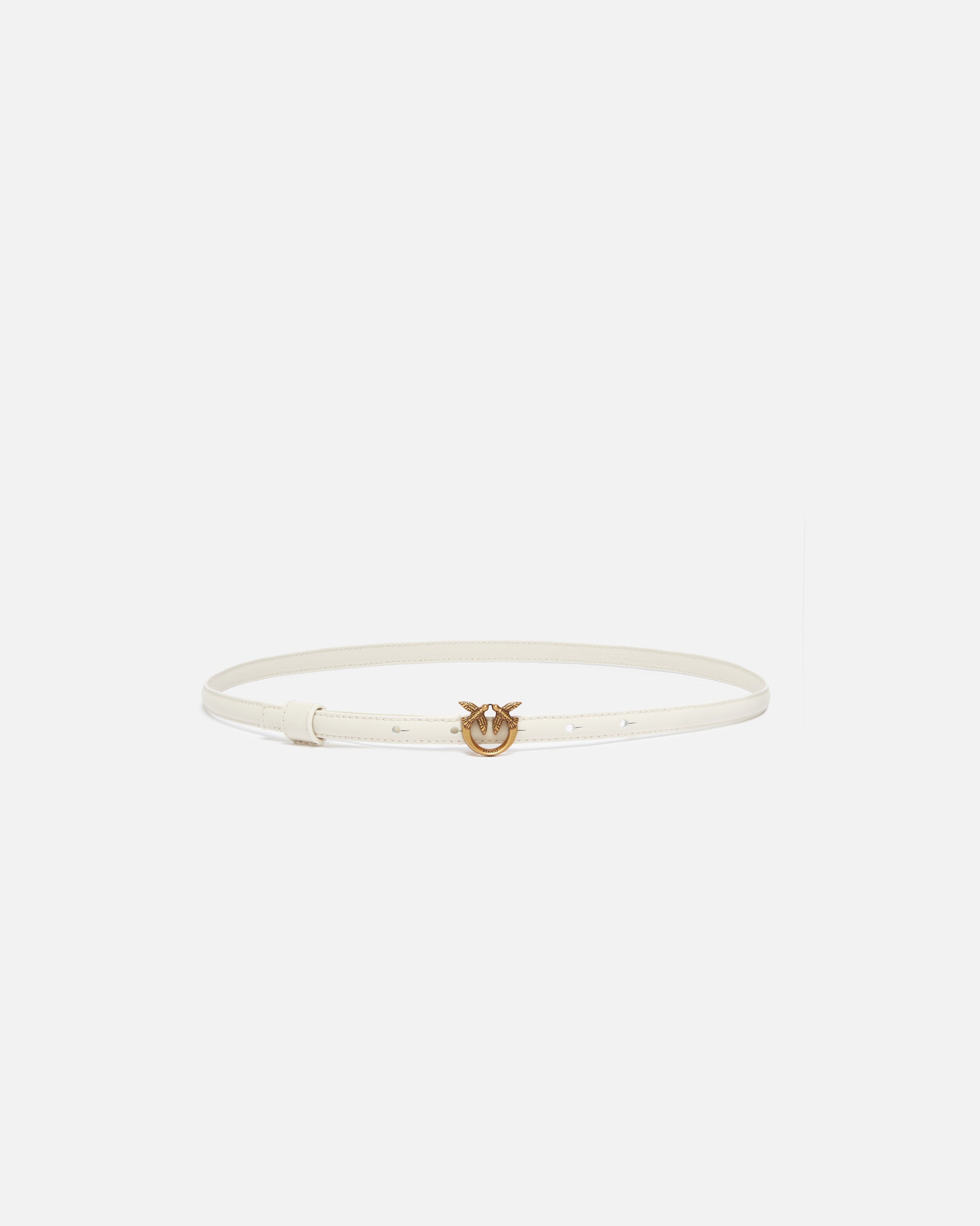 Thin leather belt with mini Love Birds Diamond Cut buckle in antique gold- or old silver-electroplated metal.