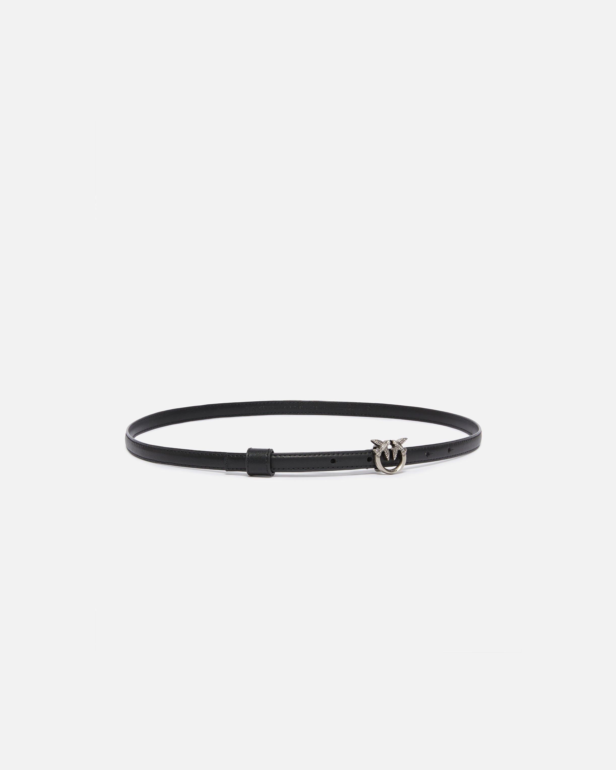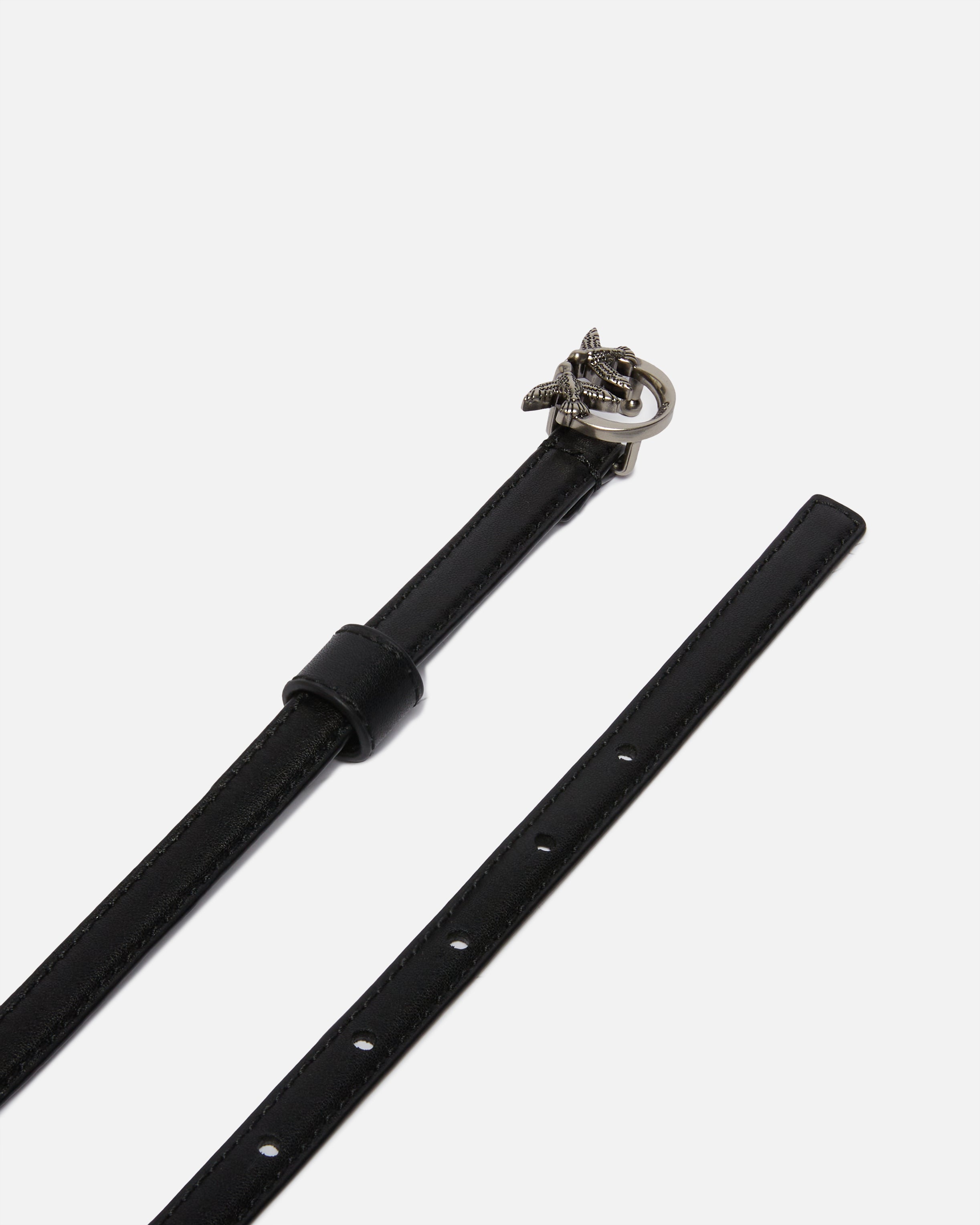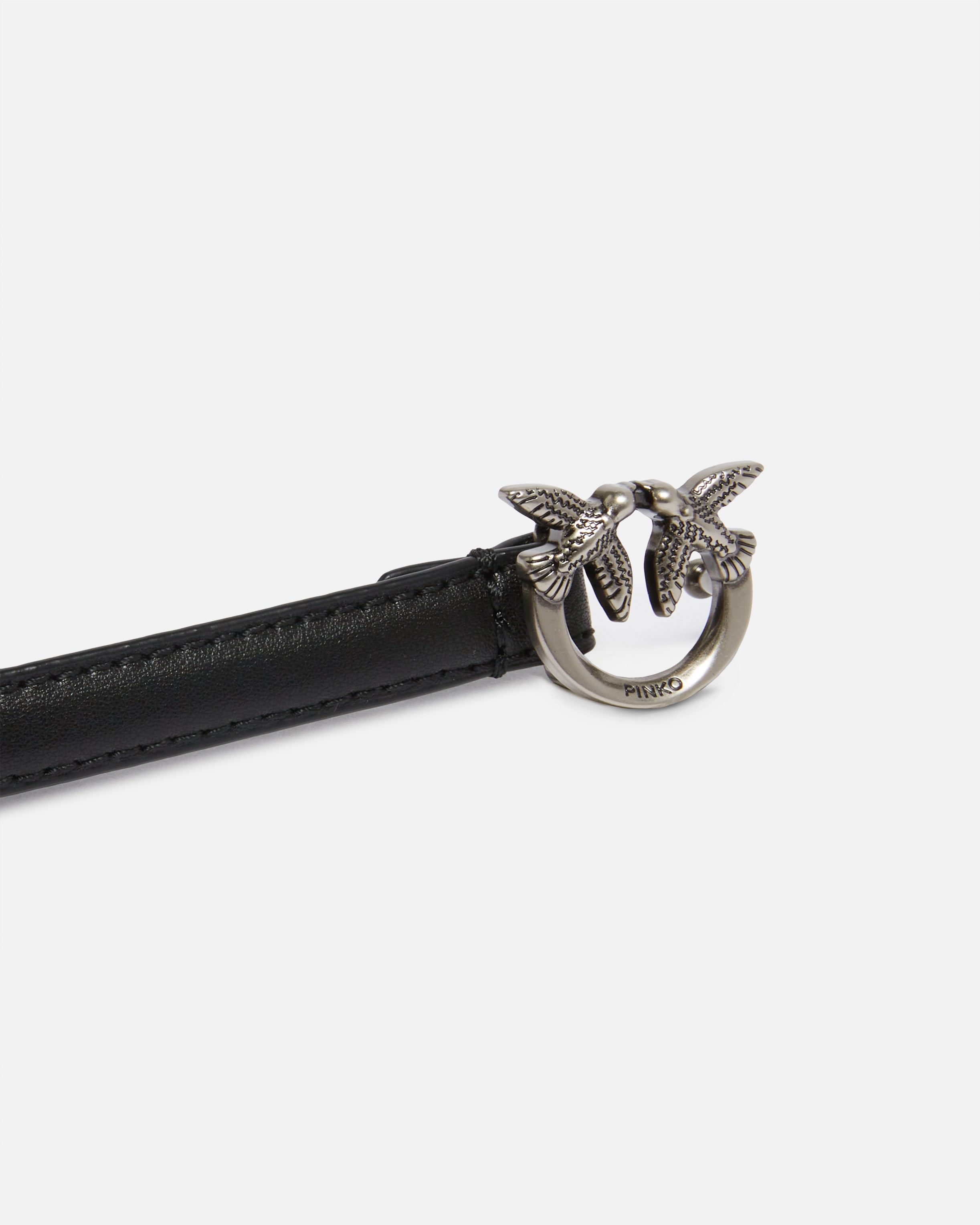 Thin leather belt with mini Love Birds Diamond Cut buckle in antique gold- or old silver-electroplated metal.