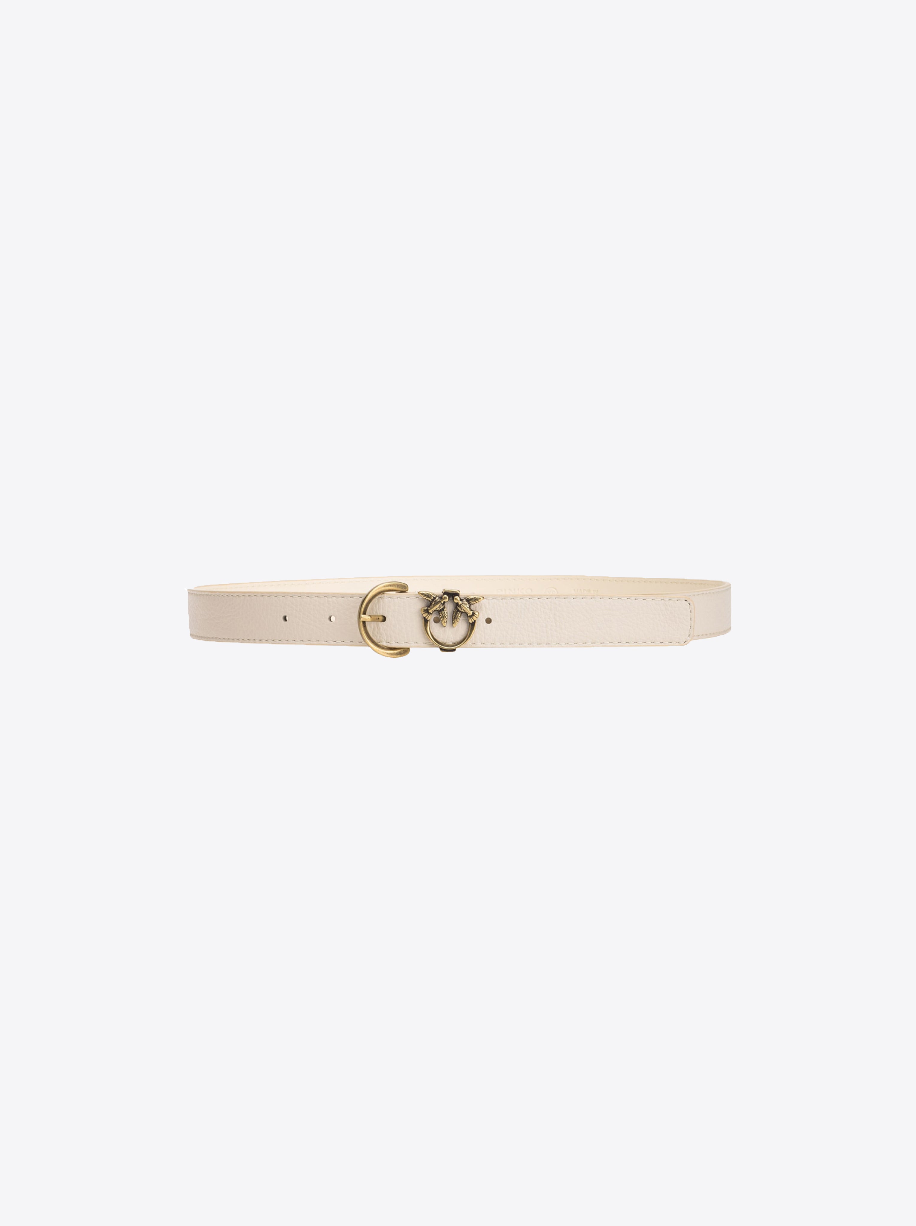 Thin tumbled leather belt with metal detail bearing the Love Birds Diamond Cut plaque and antique gold-electroplated half moon-shaped buckle.