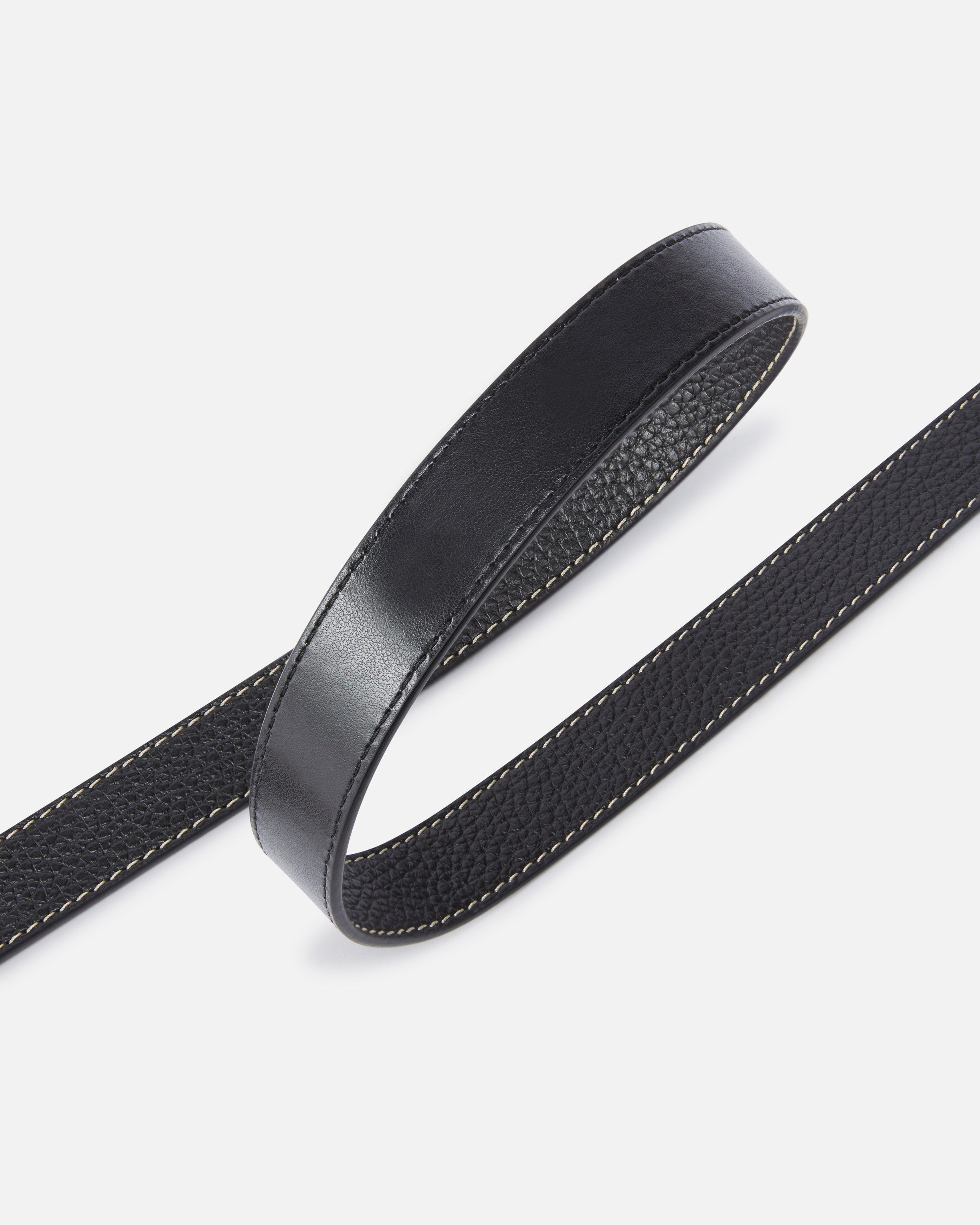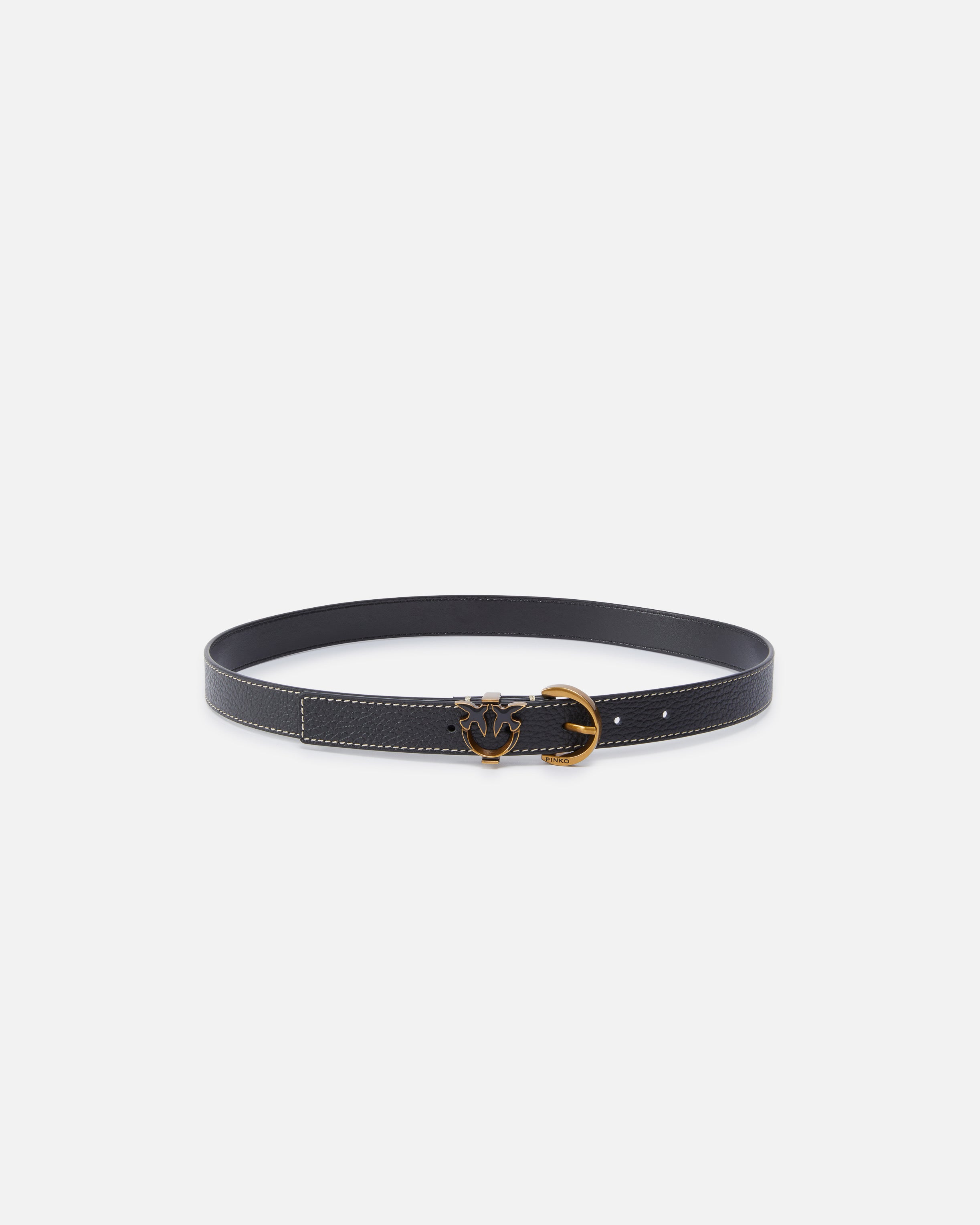 Thin tumbled leather belt with metal detail bearing the Love Birds Diamond Cut plaque and antique gold-electroplated half moon-shaped buckle.