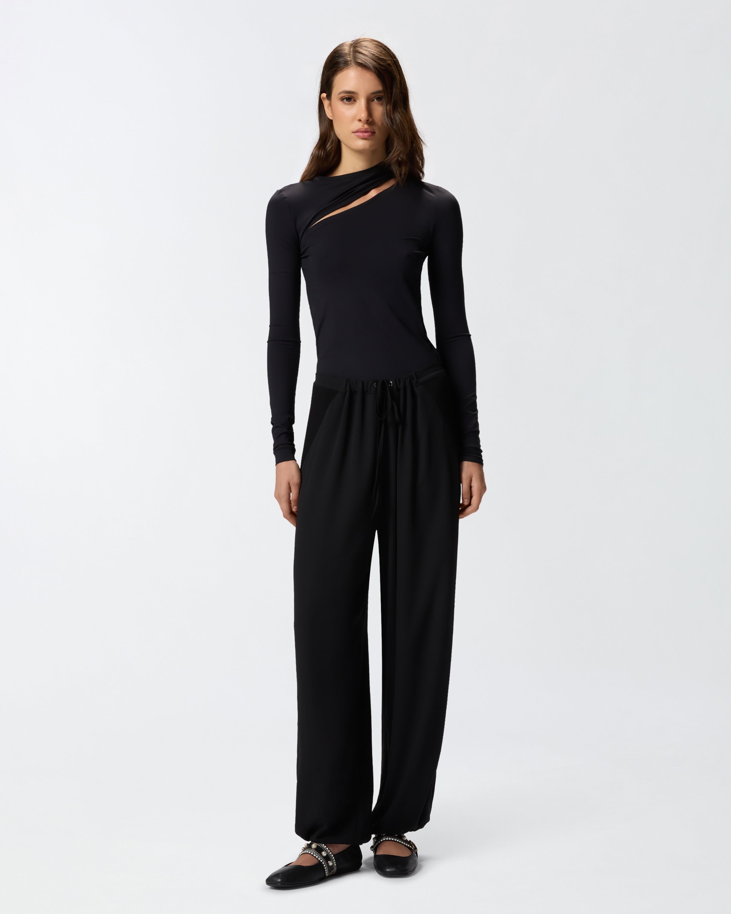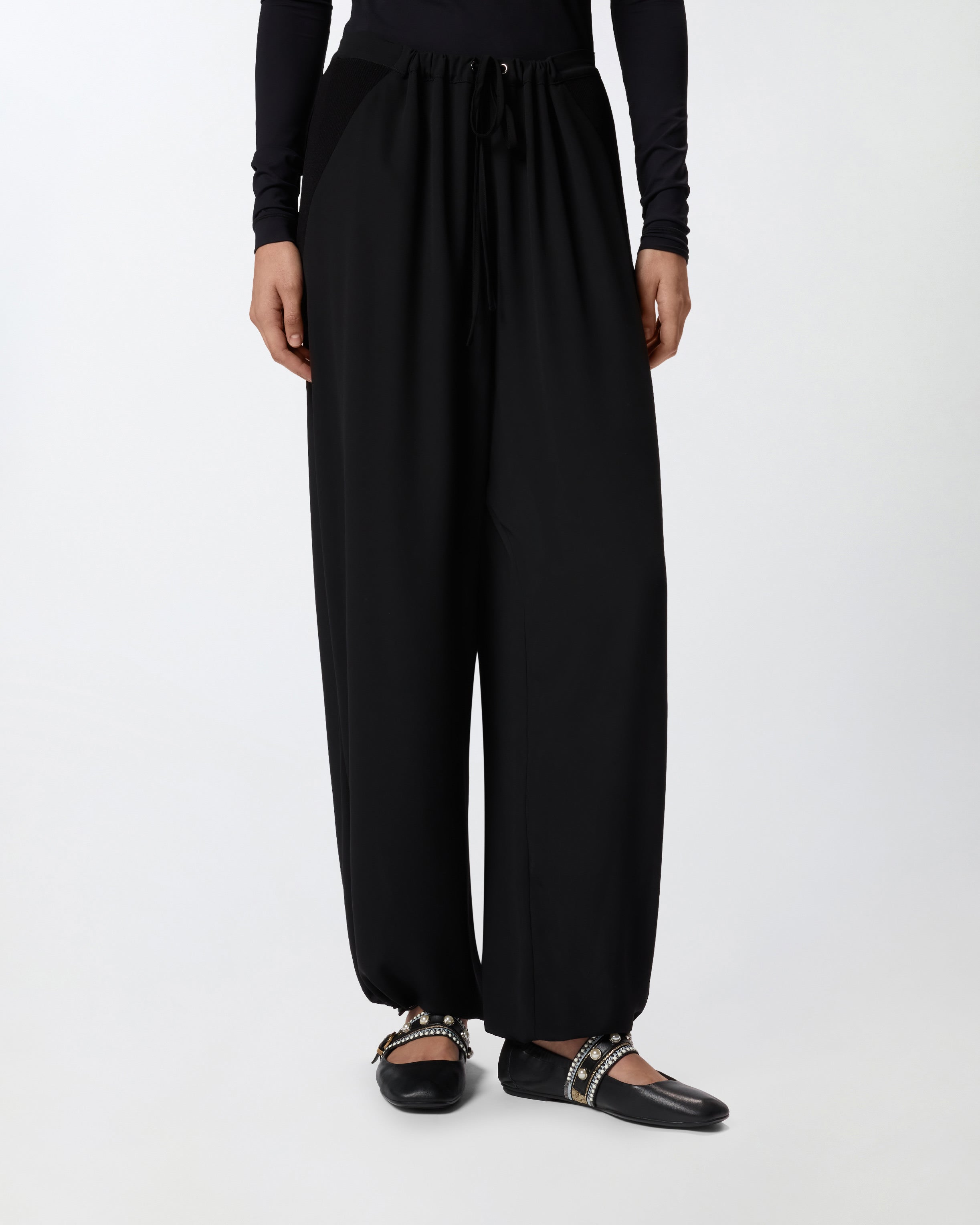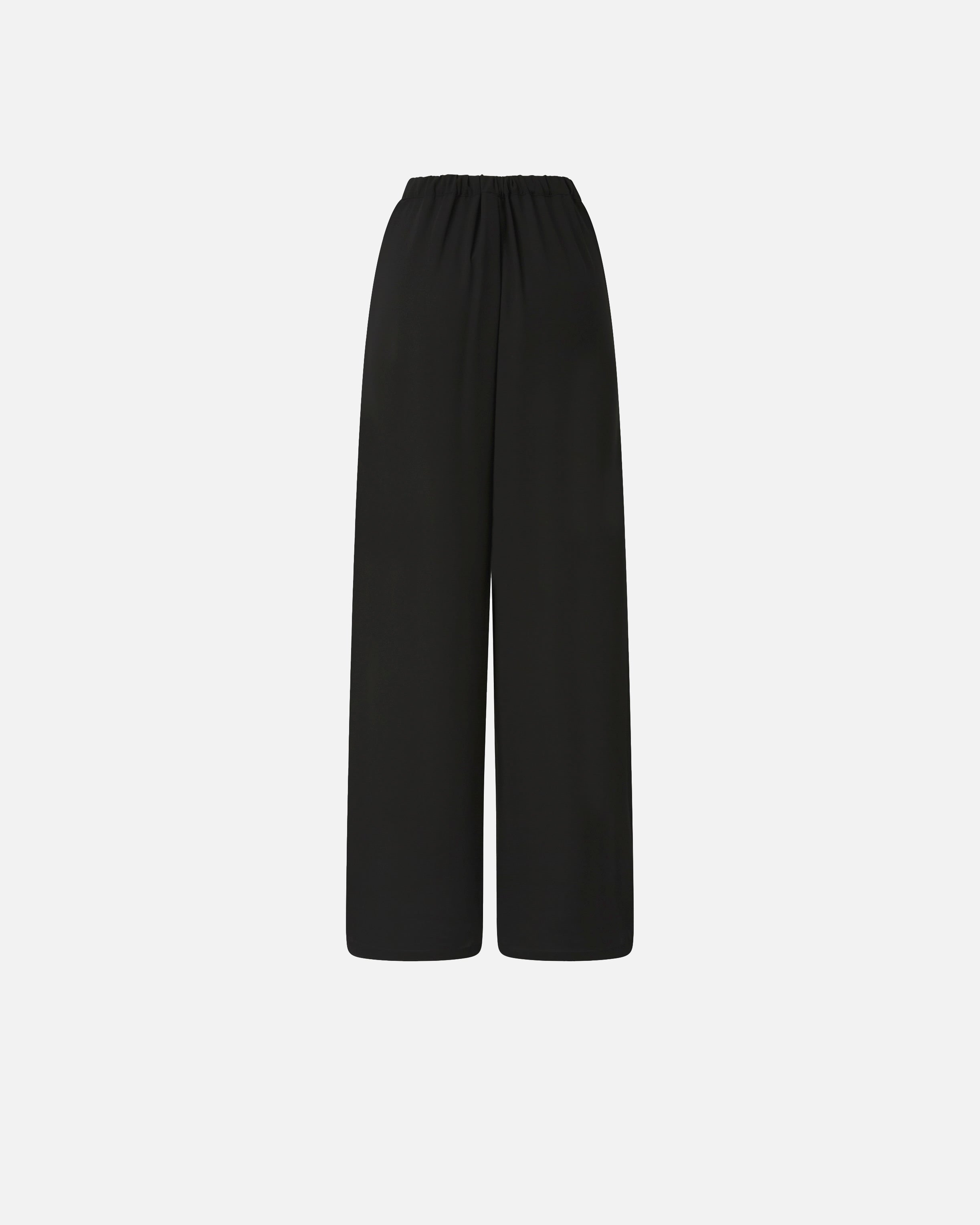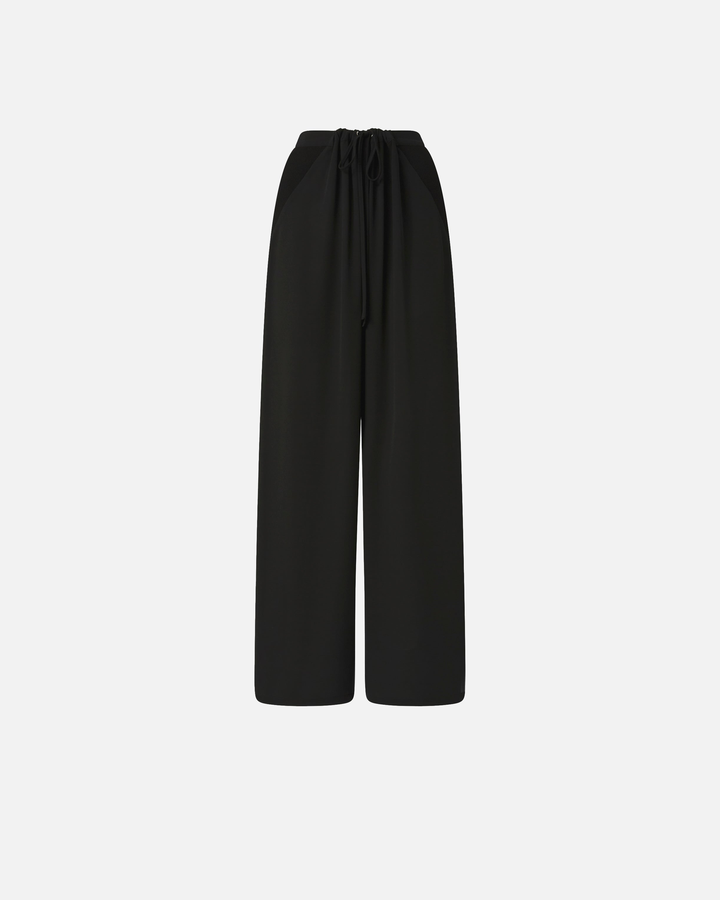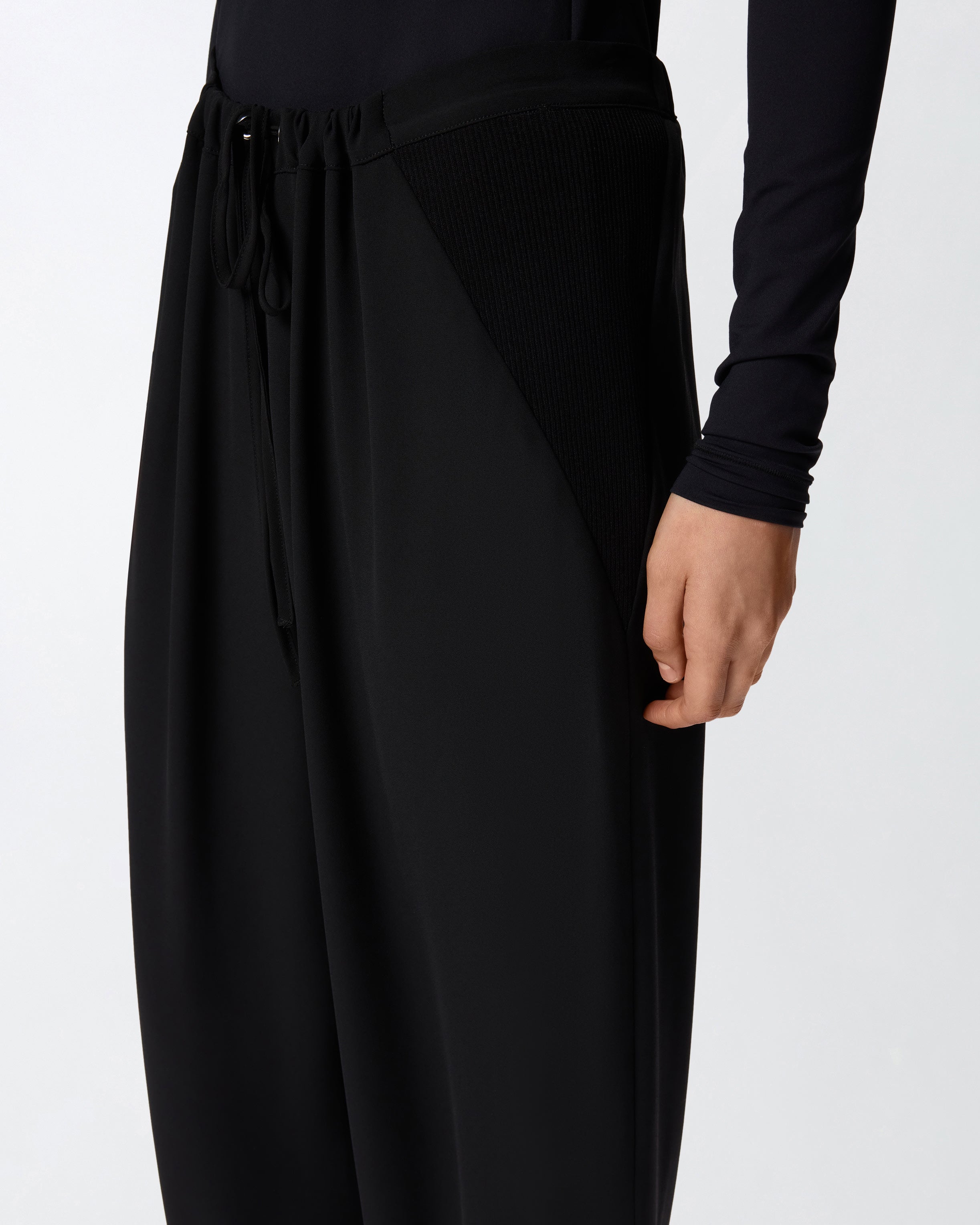 Trousers with a very wide leg and slightly contrasting front inserts just below the waist. The very fine, fluid and light technical crepe fabric is particularly suitable for everyday wear. Complete with an elasticated drawstring waist, these wide-leg trousers are very comfortable.