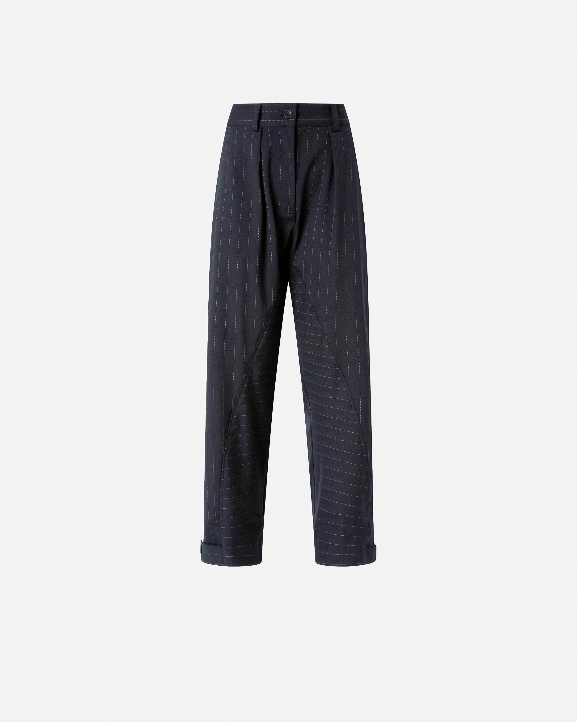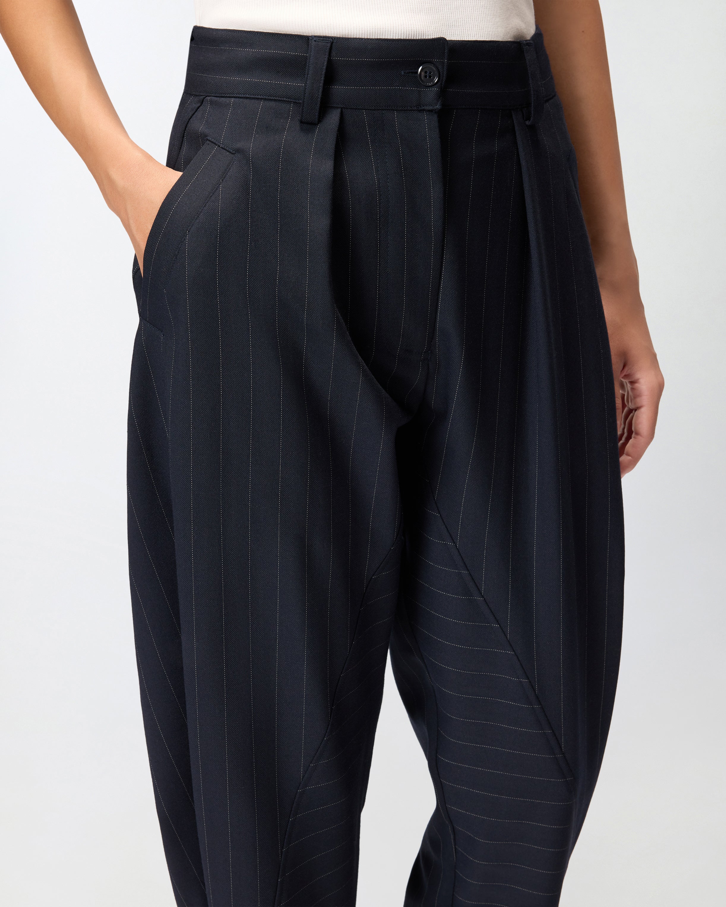 Balloon-fit trousers with a soft, rounded balloon leg at the top and narrower at the bottom, where there is also a strap to adjust the wear as needed. The fabric used is a classic poly wool pinstripe characterized by a change of texture and light to emphasize the design of the material. The tailored design of the garment is further highlighted by the pleats, the waist construction with belt loops and the welt pocket on the back. Concealed button and zip closure. Pair trousers with blazers in the same fabric for a suit effect, or wear a shirt for a formal, but not too formal look.
