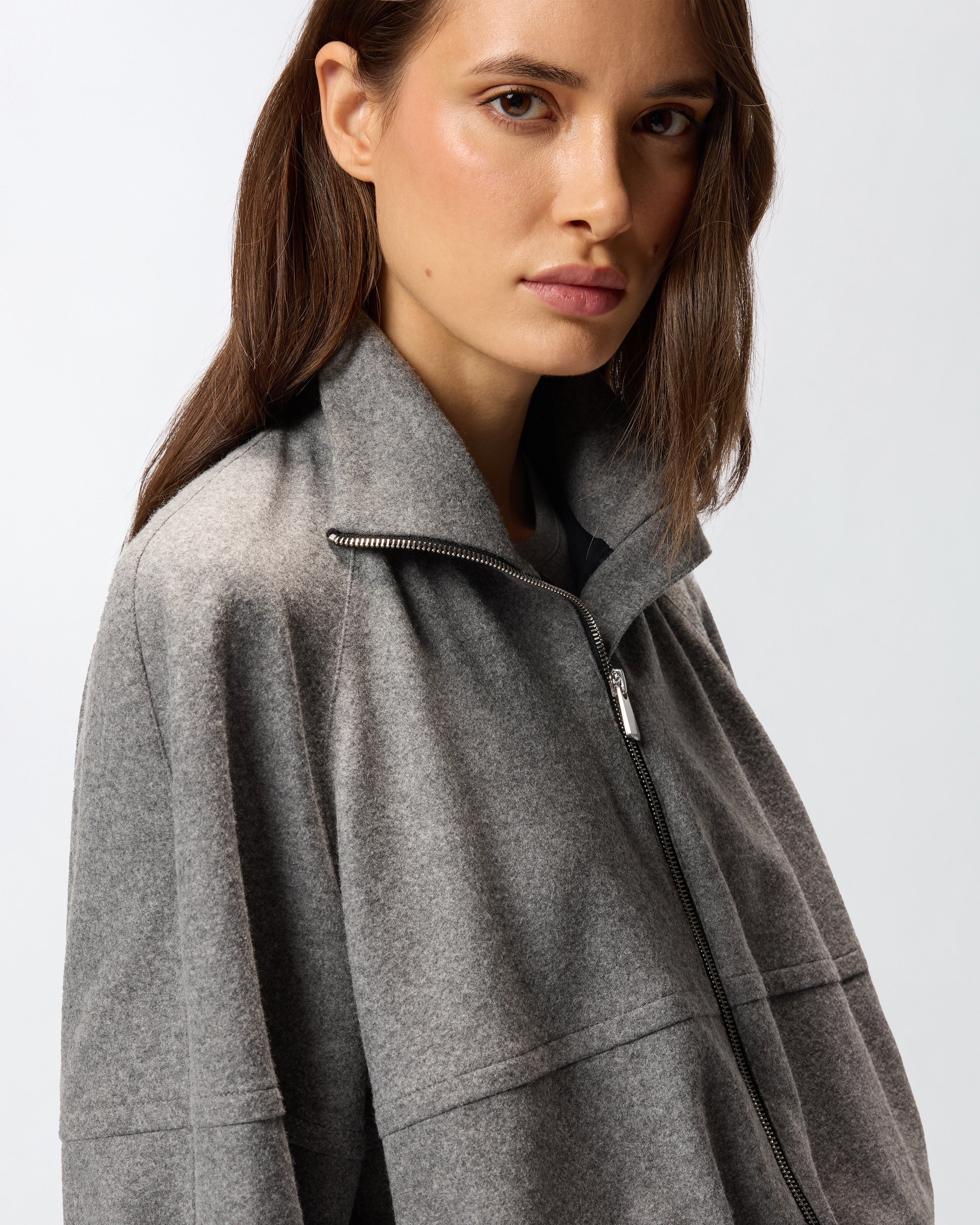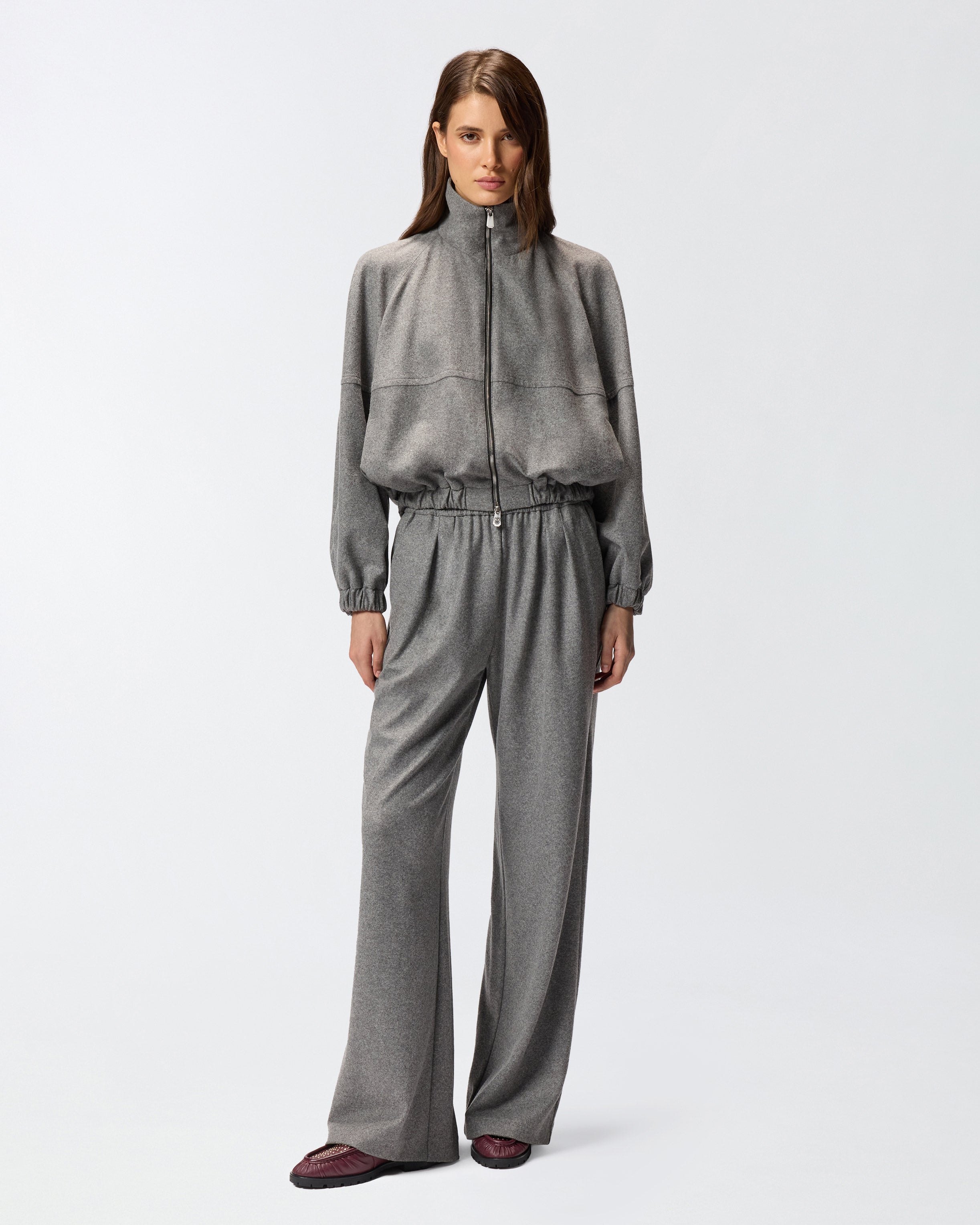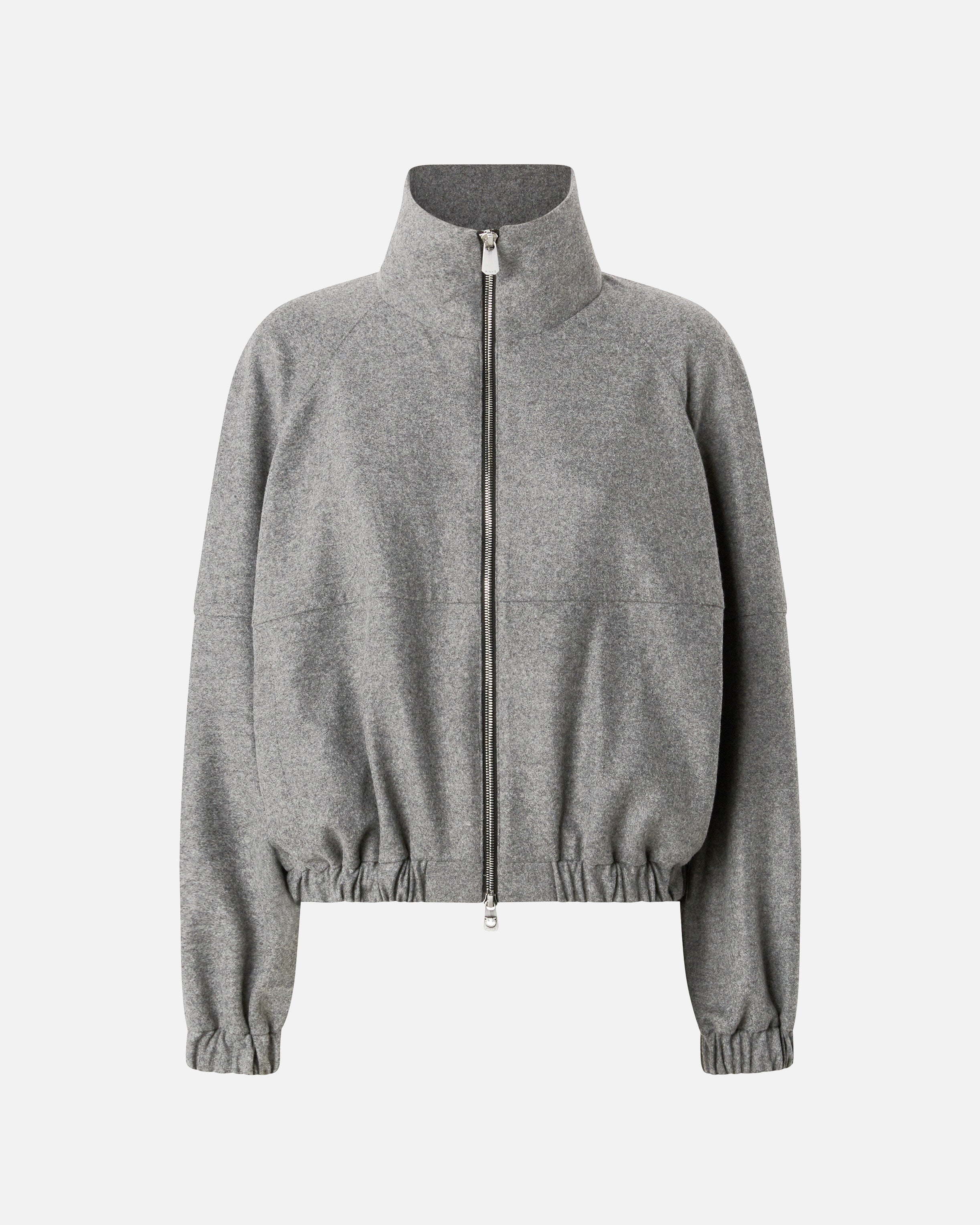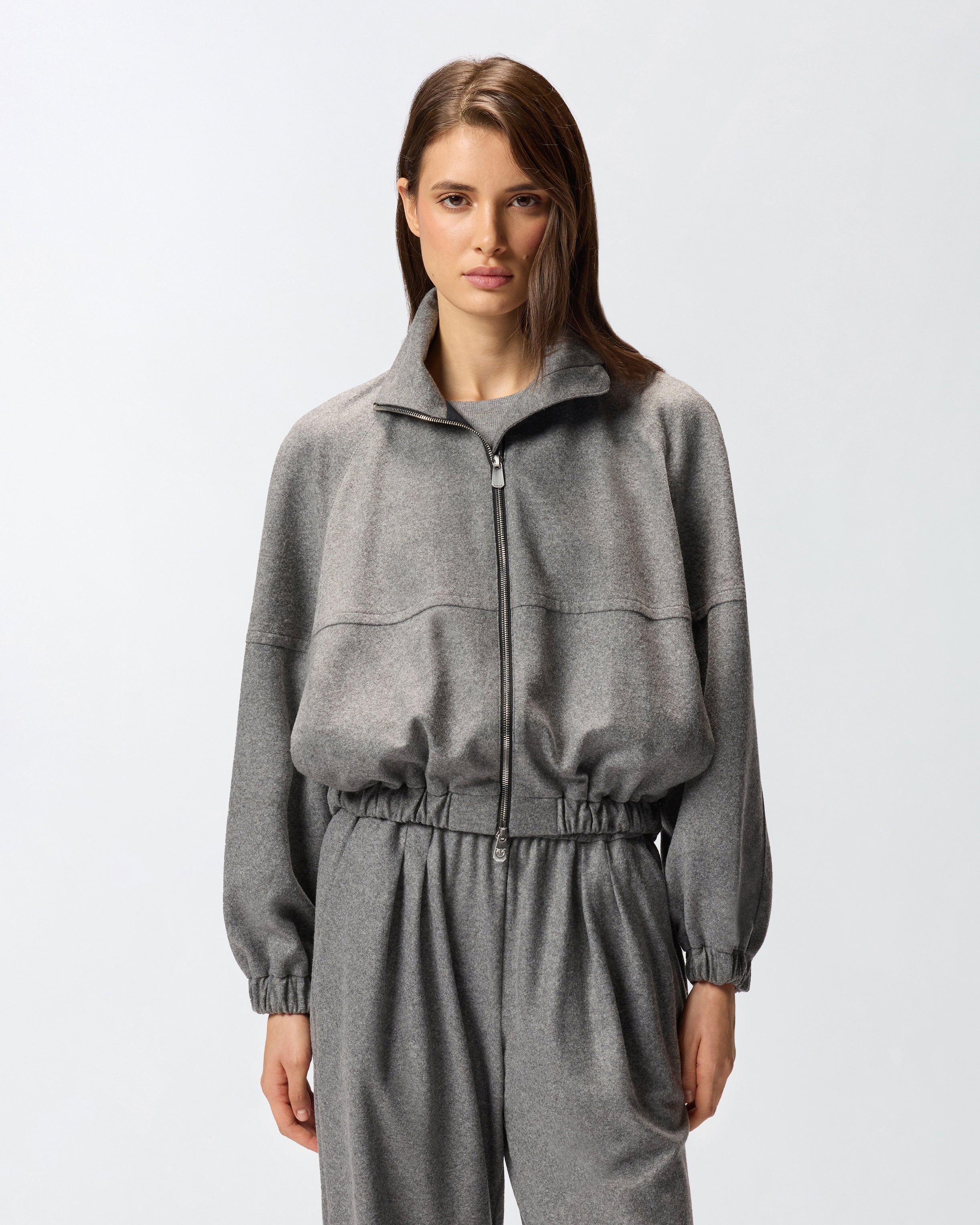Regular-fit bomber jacket made of yarn-dyed wool-blend jersey flannel, a perfect fabric for combining tailoring and comfort. The garment features a wrap-around stand-up collar, a functional front zip closure and comfortable side pockets, and is made even more practical by the elasticated hem and cuffs. Embrace sporty style with this practical and versatile style, to be worn in your free time or during more casual occasions.