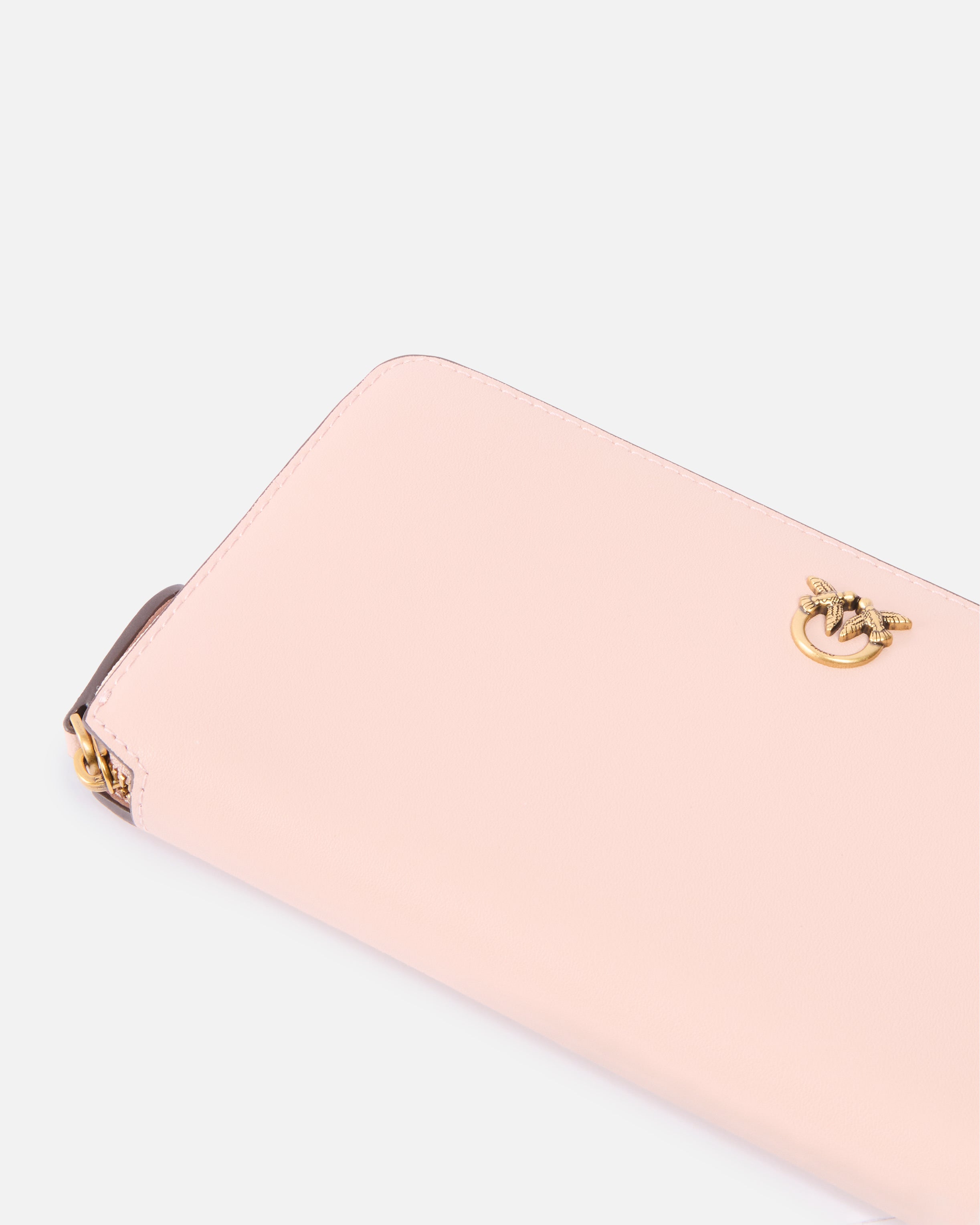 Zip-around purse in soft, silky leather, featuring the Love Birds Diamond Cut plaque on a leather base. The polycotton-lined interior is divided into four compartments, one of which is zipped and two of which have card slots.