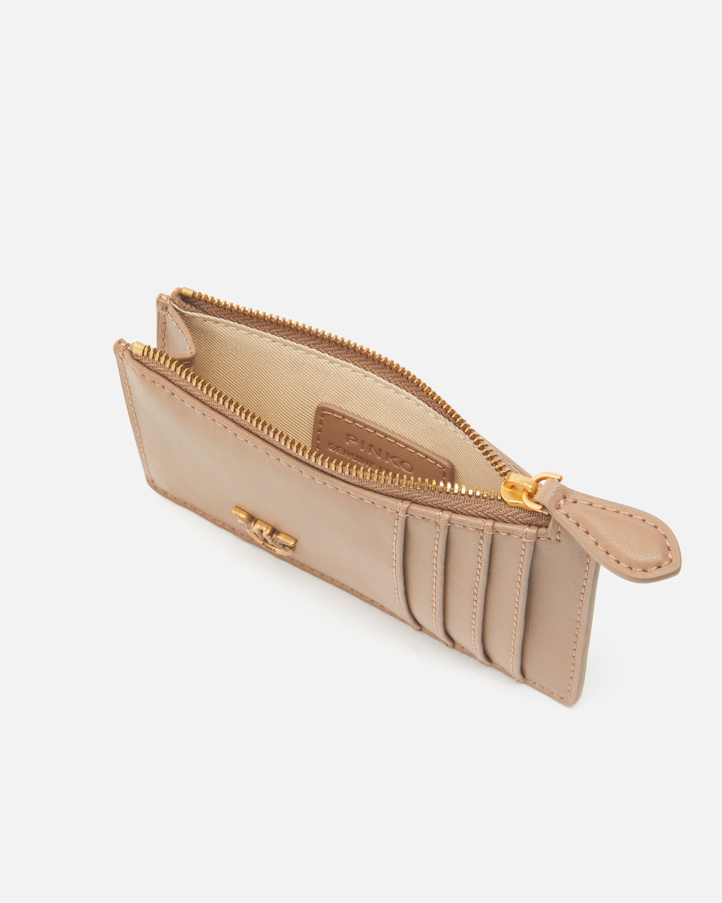 Soft, silky leather card holder. Metal Love Birds Diamond Cut logo plaque embellishment. Polycotton-lined interior. Zip fastening.